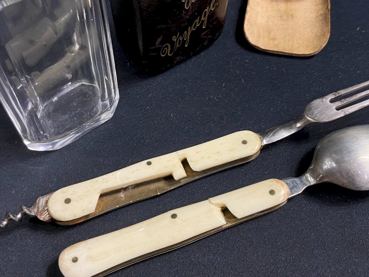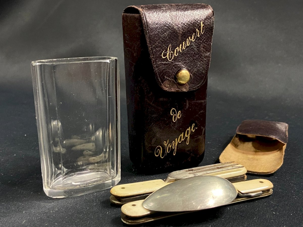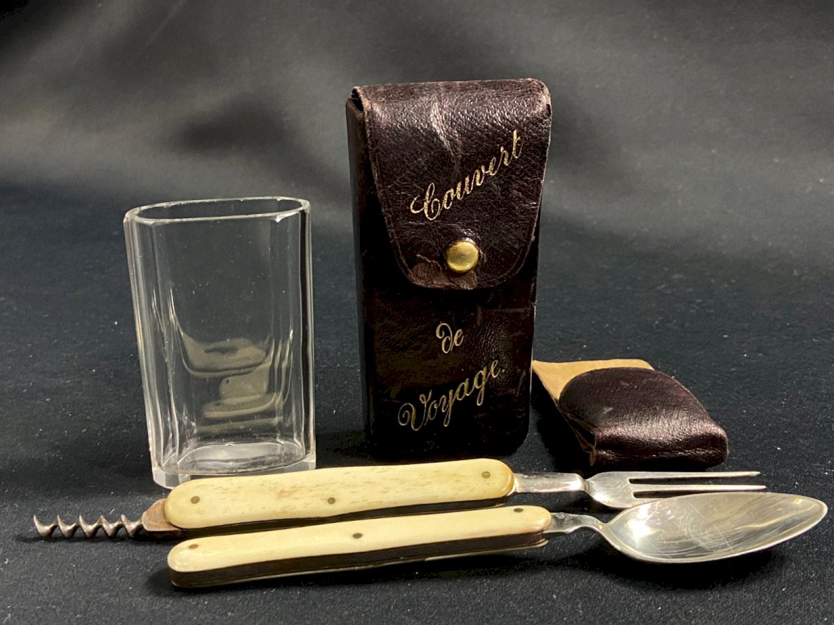 Travel cutlery late 19th century The set is presented as follows: Fork with corkscrew and folding metal spoon: Length 8.5 cm / Maximum length 15 cm (presence of slits) Faceted crystal glass: Height 7.2 x 4.7 x 2.5 cm (tiny chipping) Leather case: Height 10 x 5 x 3 cm (surface wear marks) Total weight: 136 grams Very careful shipping worldwide Authenticity: Original Type: Showcase item, Decorative Origin: France Country of origin: France Sub-type: Travel cutlery Material: Crystal Style: Napoleon III