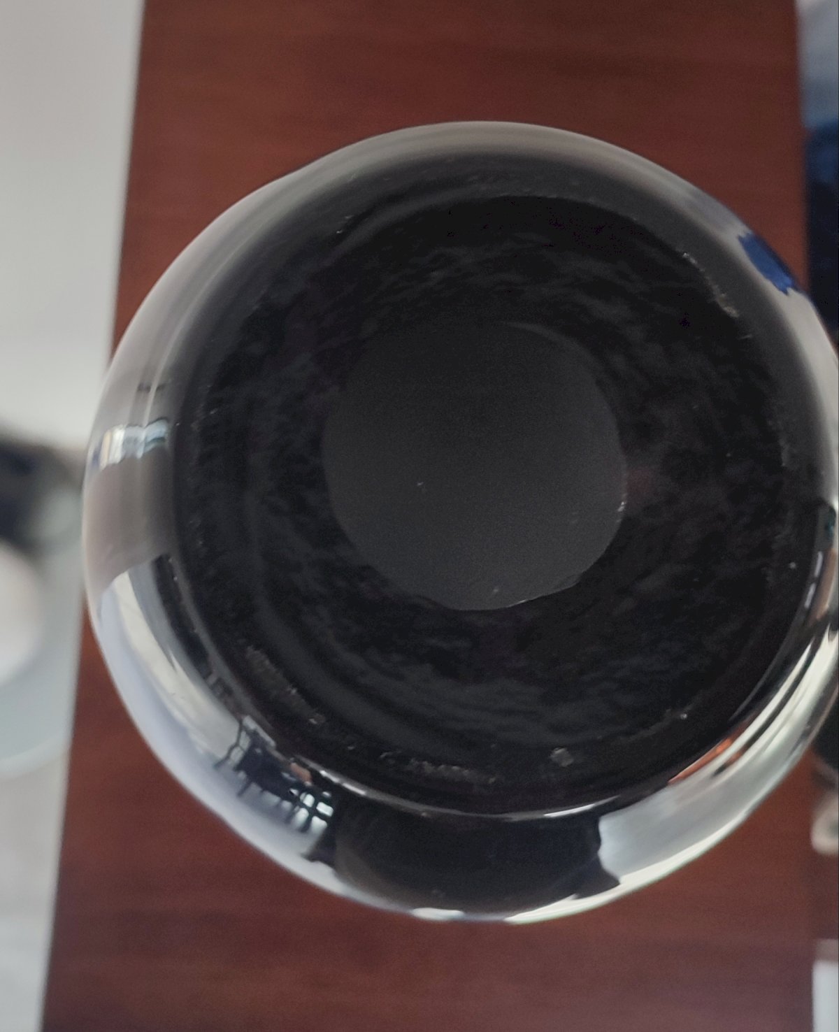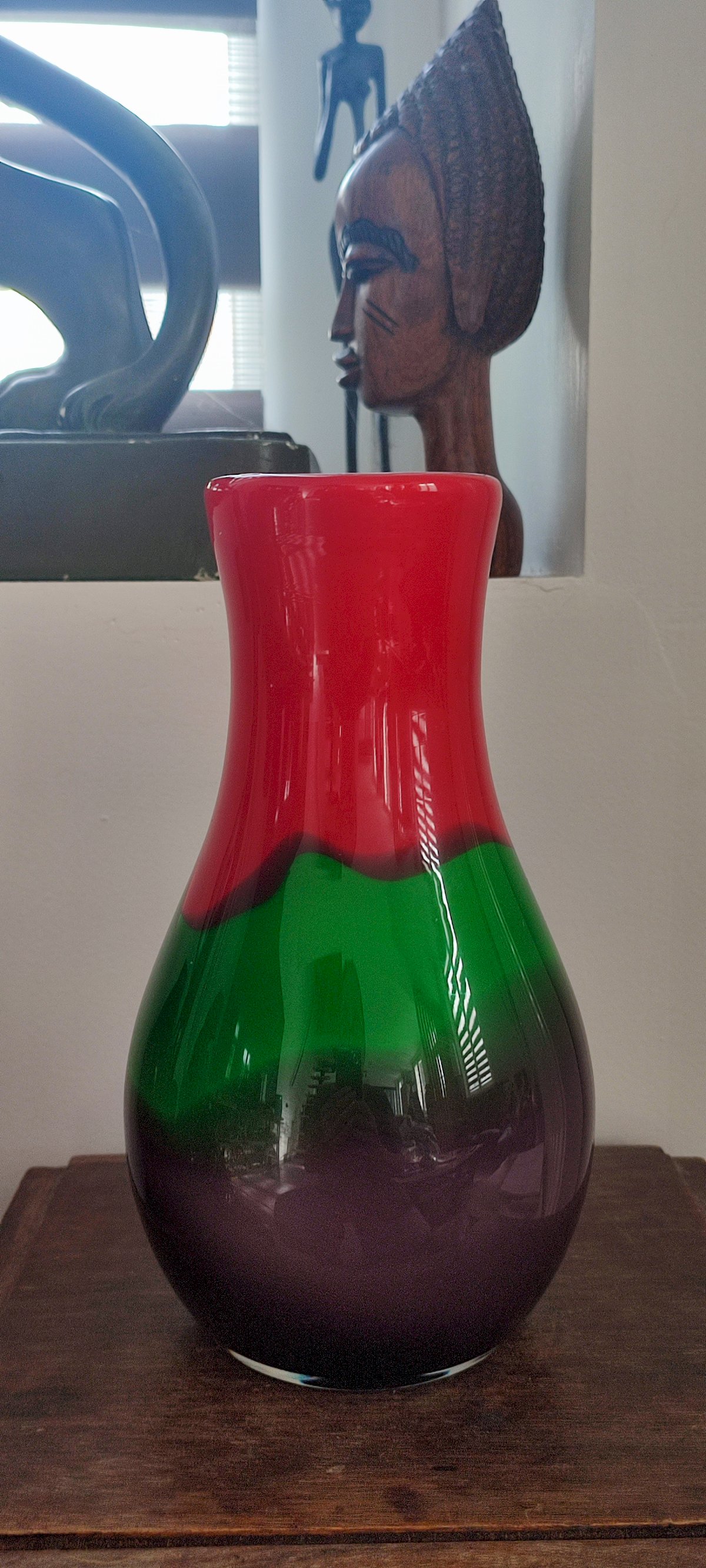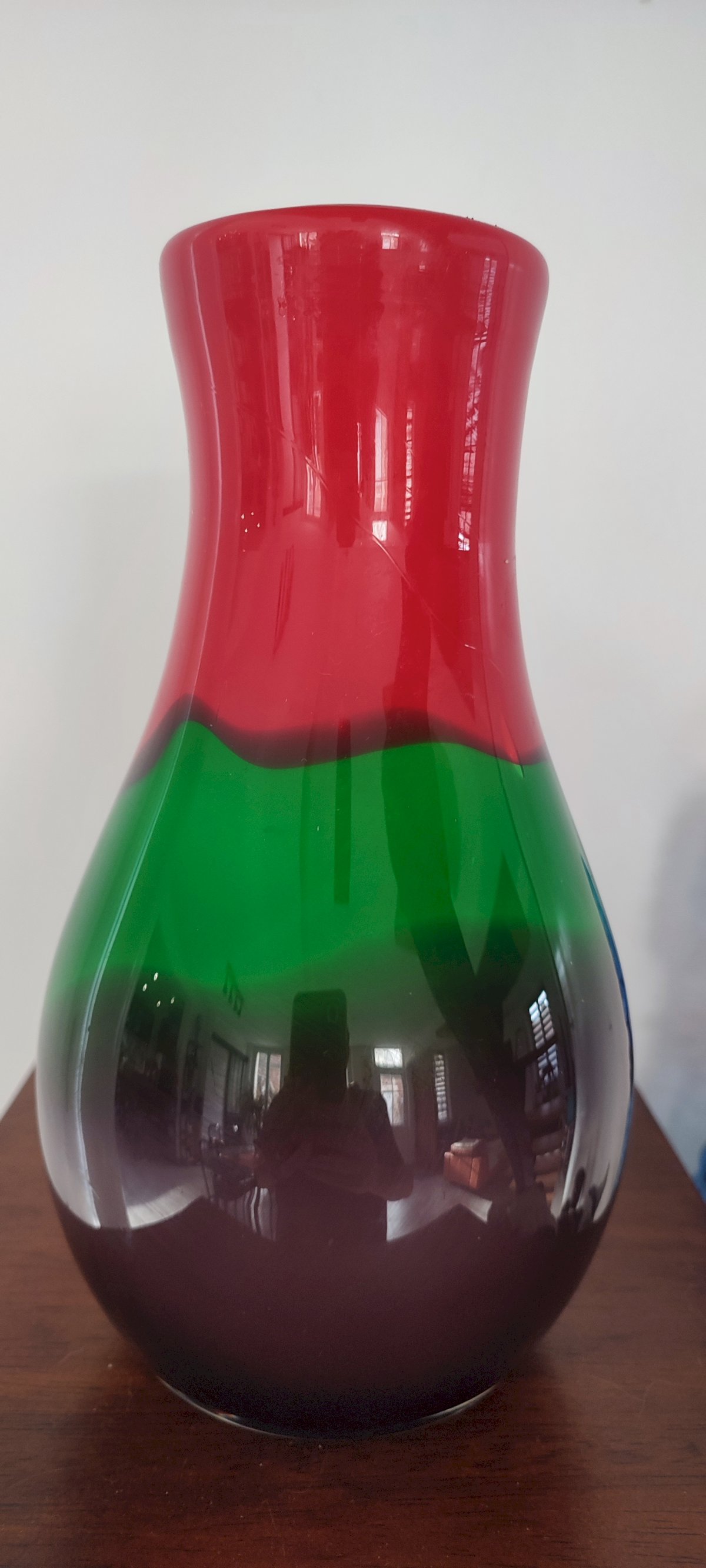 Thick glass bulging vase with a tricolor design. A beautiful presence and excellent stability due to its weight and the quality of the glass. The interplay of colors makes it an elegant and luminous decorative piece.