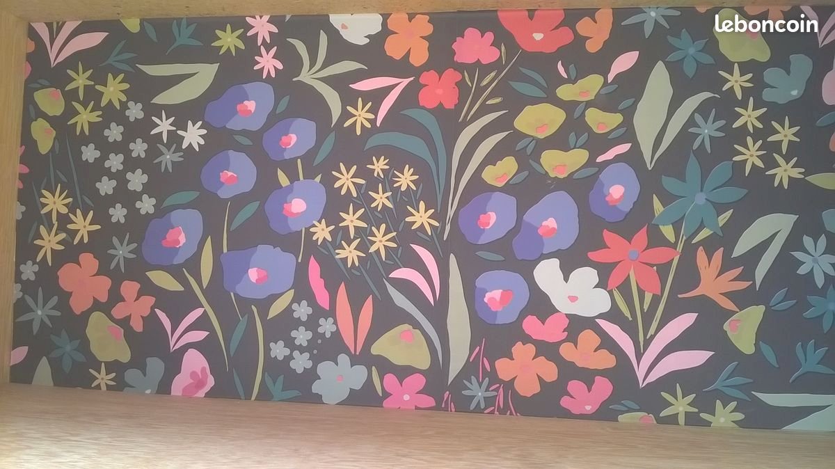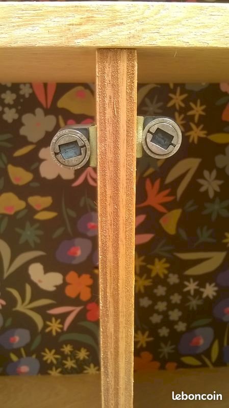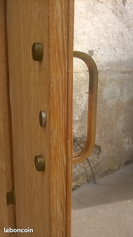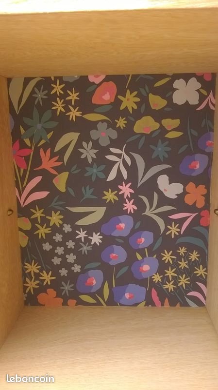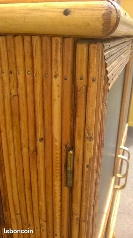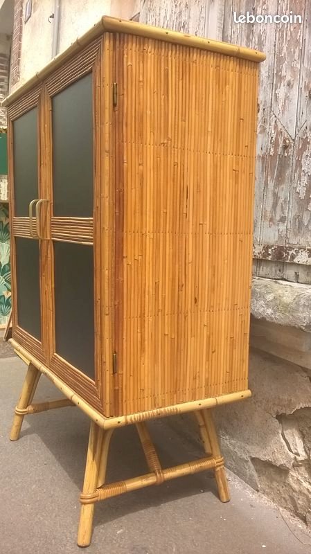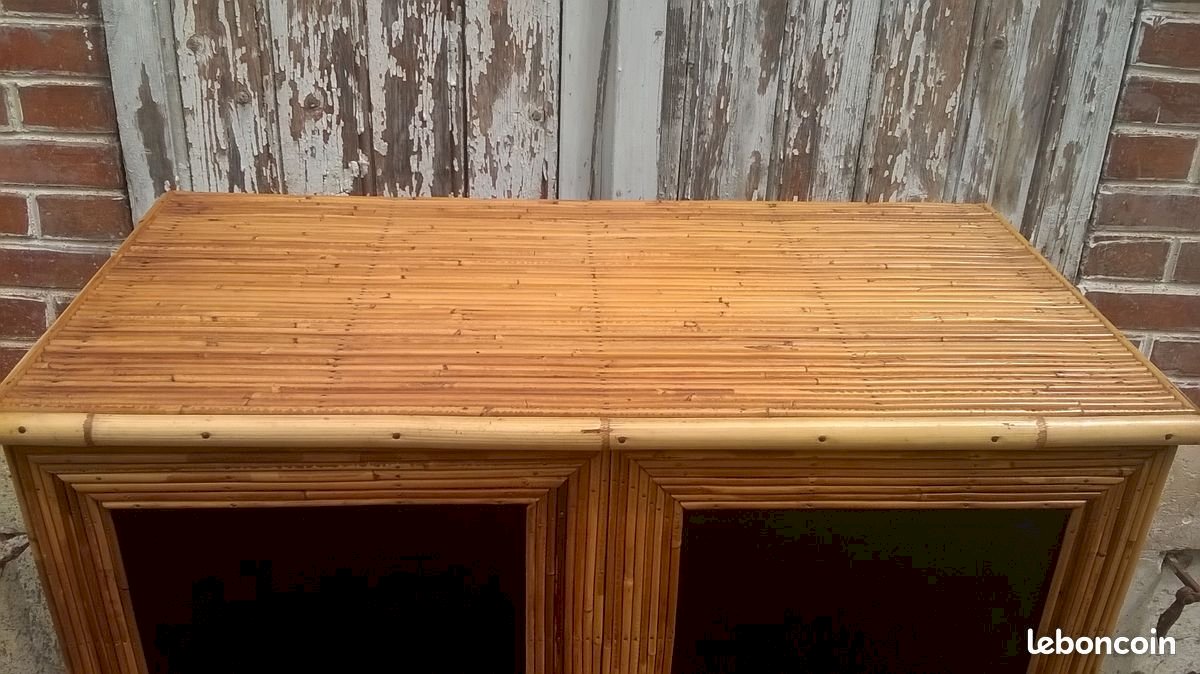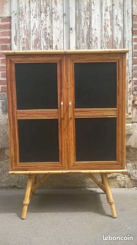 Two-door rattan buffet in Audoux Minet style. This buffet has been cleaned and revitalized. It features a full-length shelf at the top and two separate shelves at the bottom. The back of the piece is lined with black paper with a floral pattern. In the center of the doors, there is original black leather. Please note that a trim is missing on one edge of a door (not disturbing). The piece is stable and solid. Height 117 cm. Length 85 cm. External depth 43 cm. Internal depth 36 cm.
