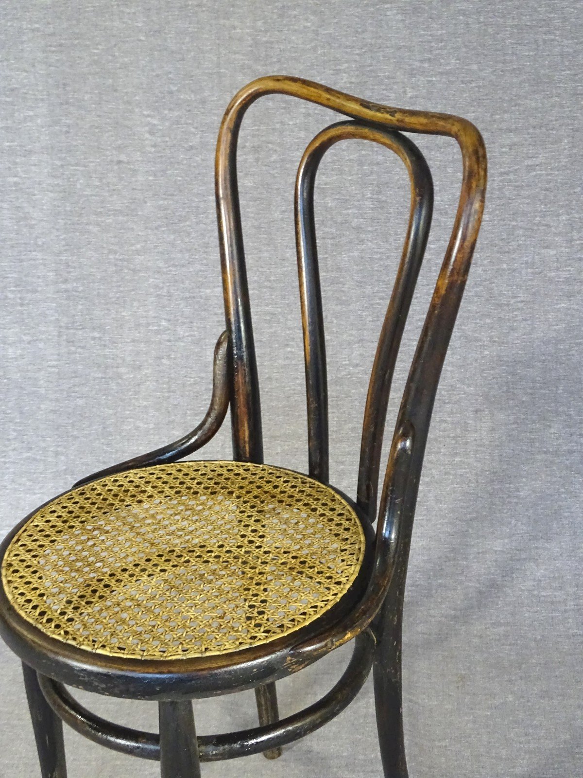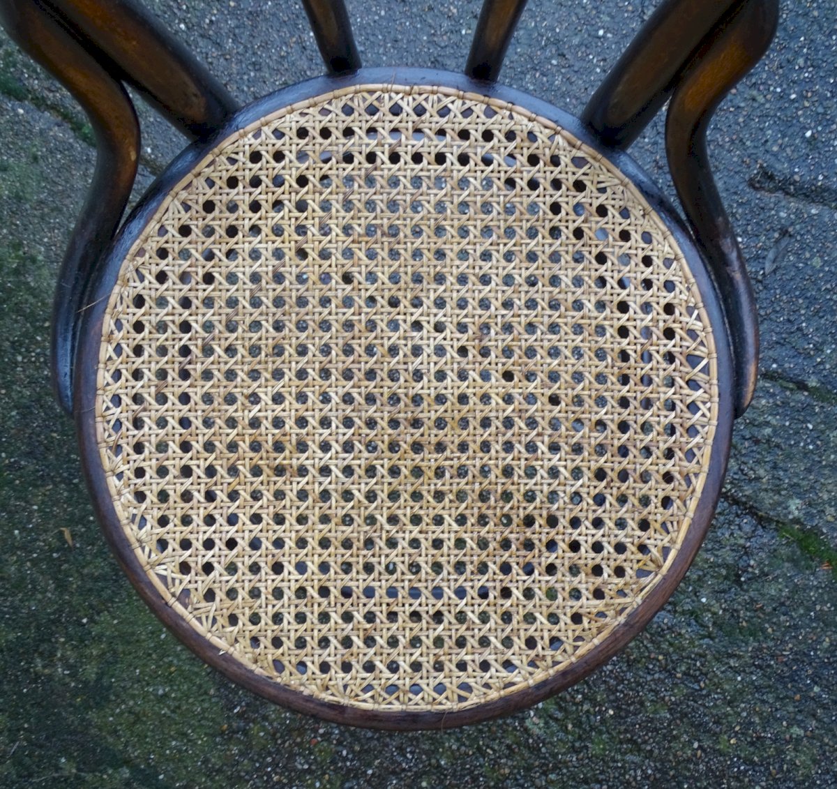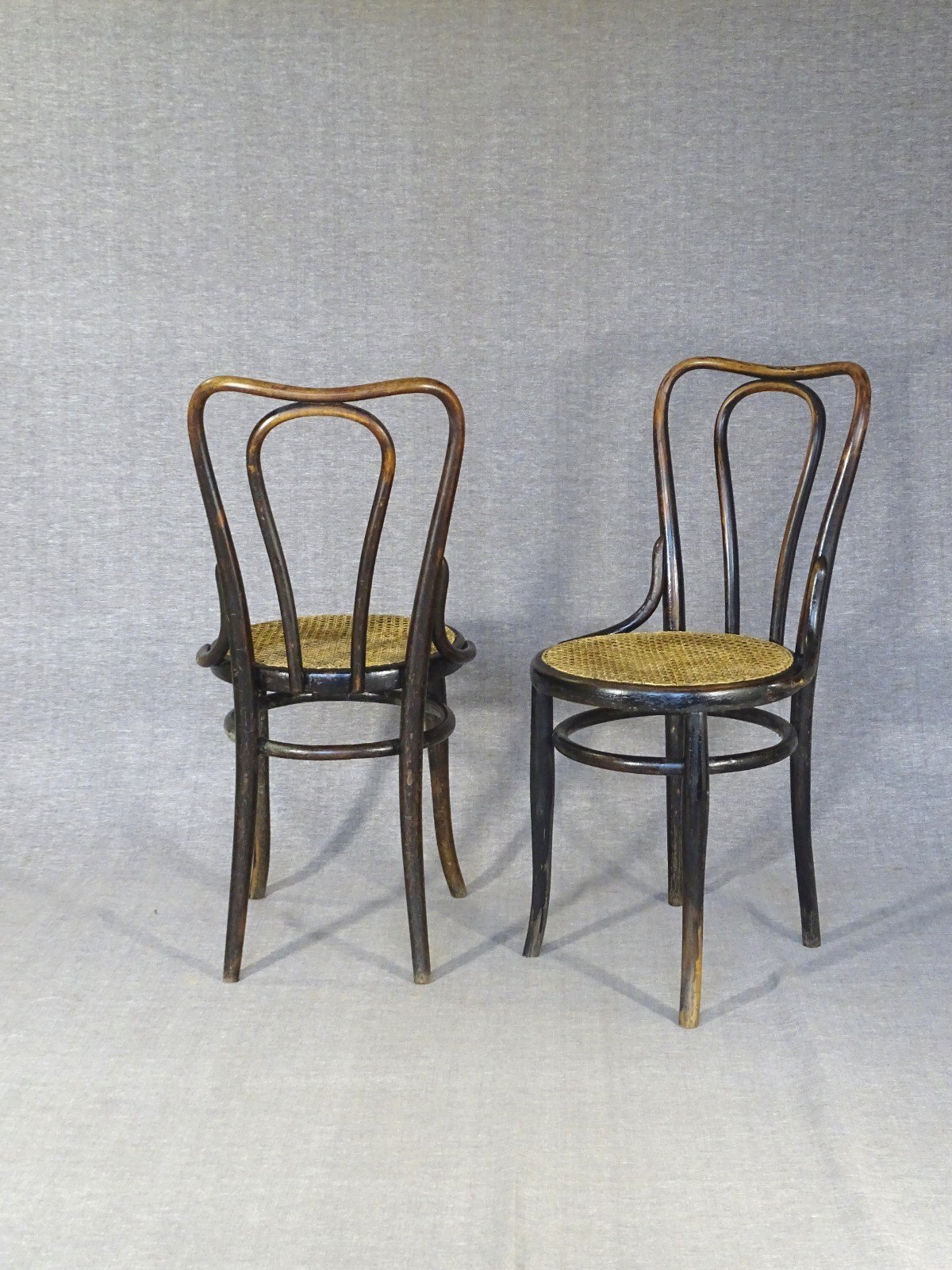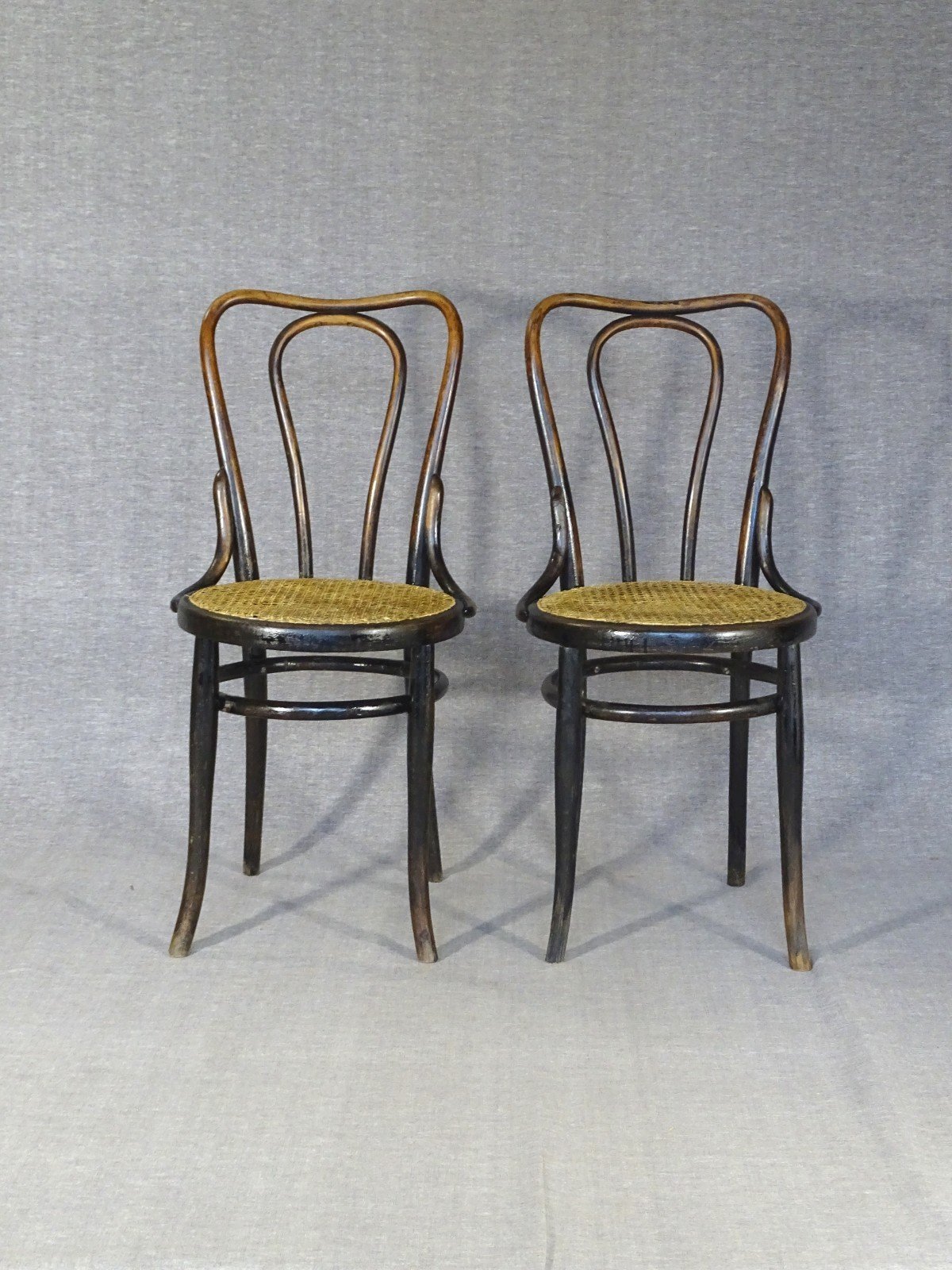Set of 2 bistro chairs by Jacob and Joseph KOHN No. 48 from around 1890, there are several versions of this model that have evolved over time. Here it is with a ring connection of the legs and a round wooden seat, in a "dark oak" shellac color, a classic of bistros from the 1890s/1900s. We have been able to preserve the patina of time and the traces of the different phases of renovation. ---- Very beautiful and in good condition, stable and solid ready to serve ---- Under the 2 chairs, there is the stamp J & J KOHN. Kohn filed a patent around 1884 for fixing the front legs with metal screws, solid and easy to assemble in the branches of various European countries. (See sketch attached…) This chair is of ¾ size, neither small bistro nor large dining room but high in its seat height. The supports, optional in the catalog, contributed to their current beautiful condition!! Seat height: 47 cm total height: 88 cm ------ Seat diameter: 39 cm More photos and information on request Secure delivery in France and Europe. Pickup in Alsace. Color: Oak Number of pieces: 2 Type: Chair Brand: KOHN Period: 1890 Subtype: Bistro Country of origin: Austria Material: Beech