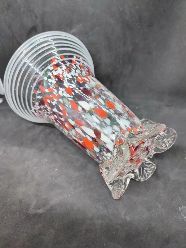 Typical Murano style vase with color inlays, in good condition, beautiful glass work, some minor chips on the small wire-shaped edges, height 20.5 cm...