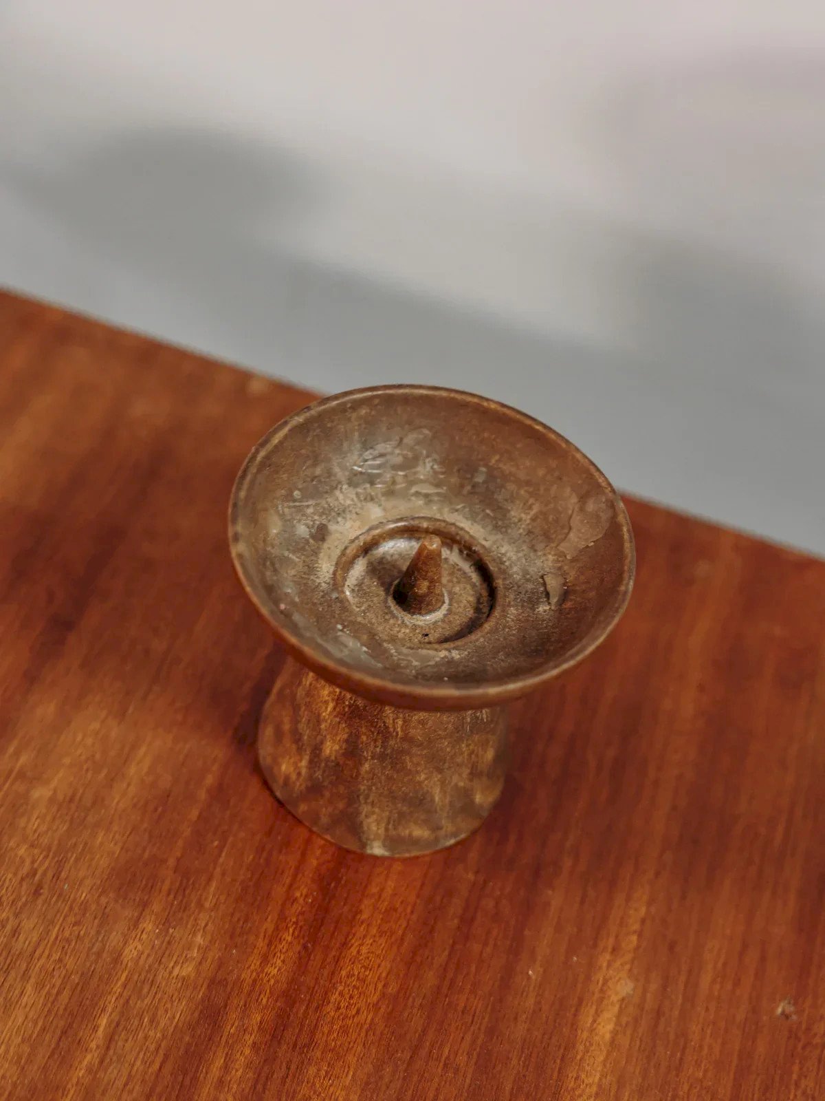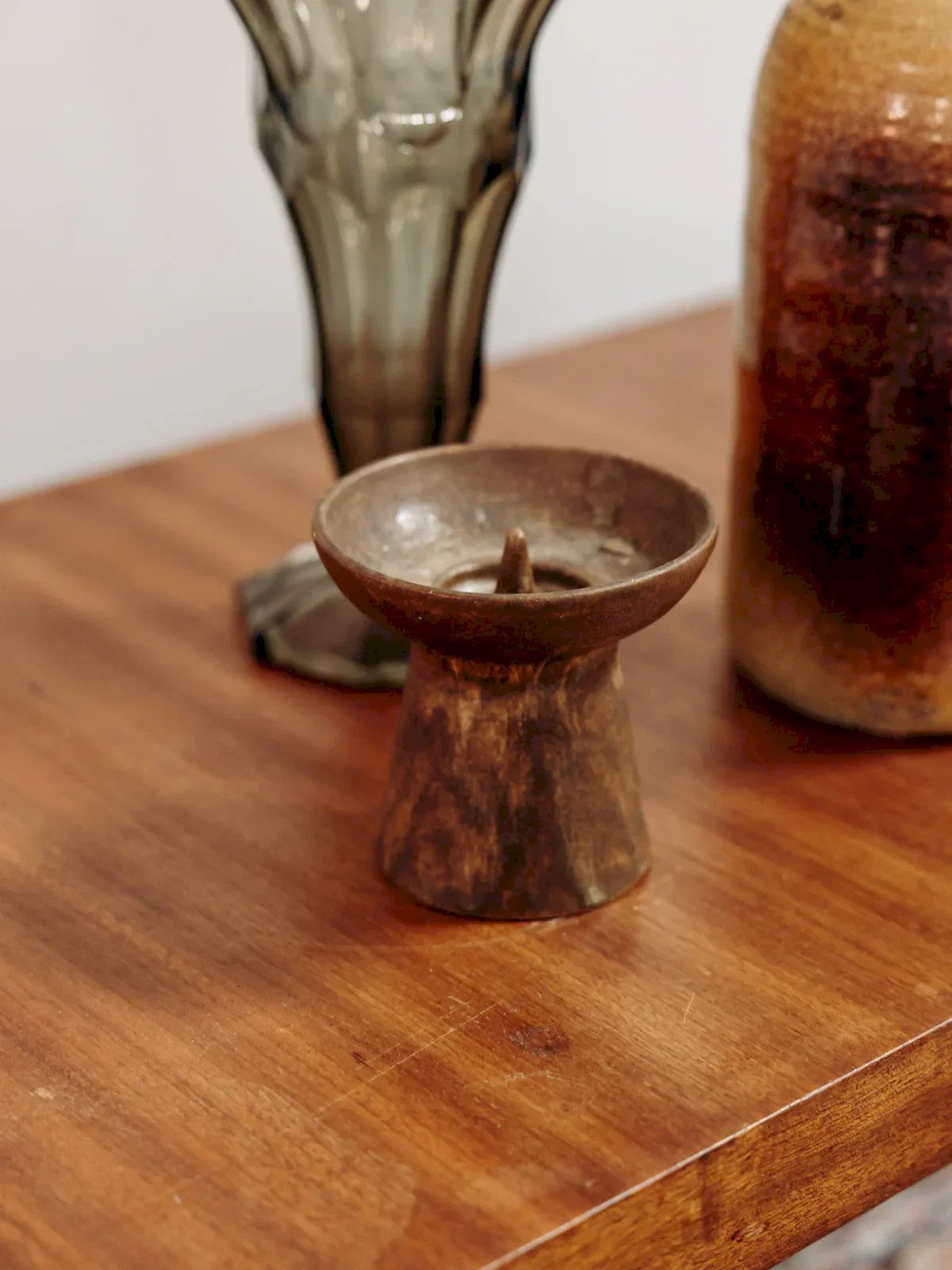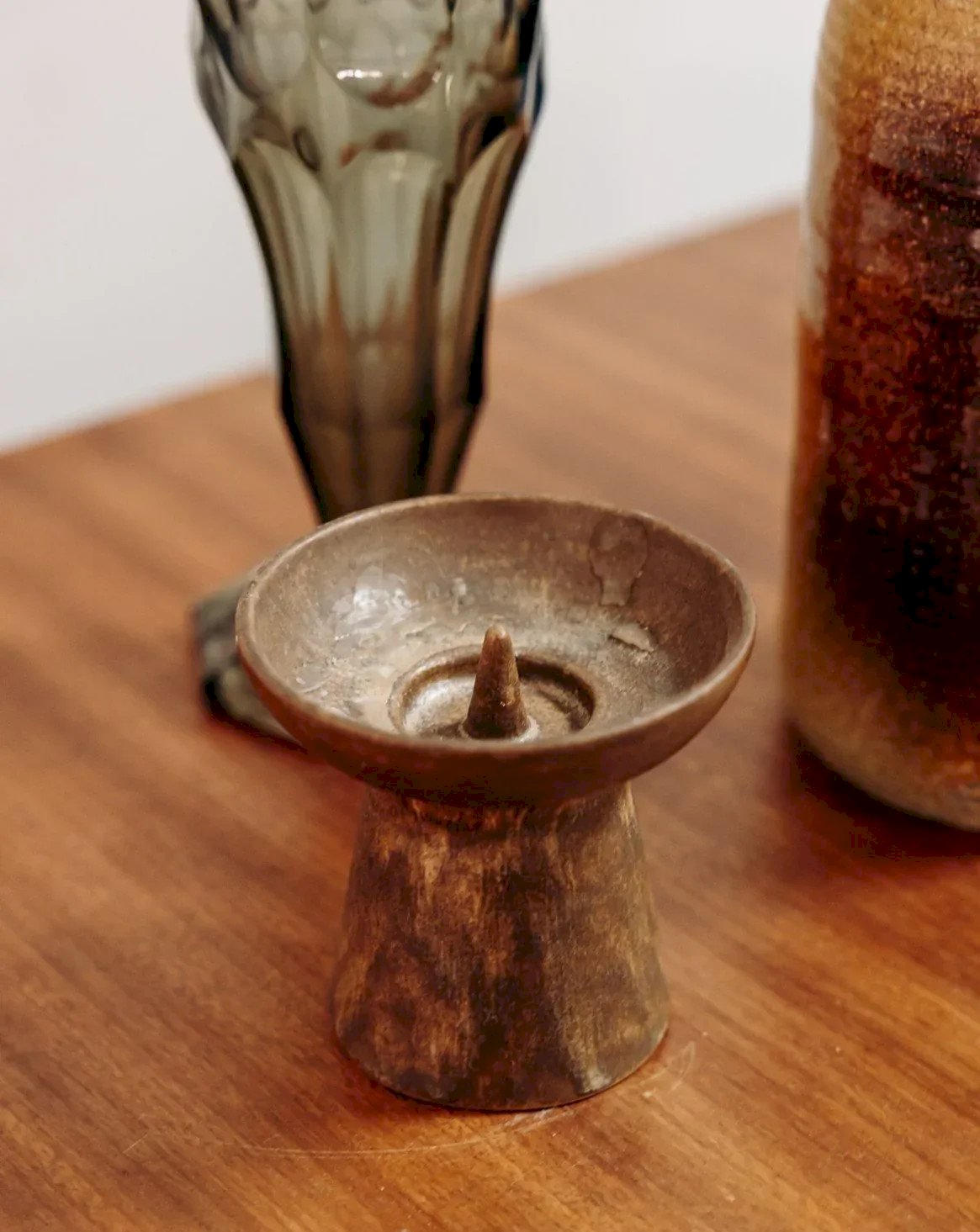 Enhance your decor with this round-shaped brown ceramic candlestick, designed to create a warm atmosphere. The small integrated spike securely holds the candle, while its compact silhouette and balanced proportions easily fit on a table, shelf, or fireplace. Its matte finish and earthy hue add an organic and contemporary touch, perfect for intimate evenings or contemplative breaks. Height: 11 cm Diameter of the top: 11 cm Condition: Used: Item that has been used. Item showing some superficial wear marks... Used: Item that has been used. Item showing some superficial wear marks, fully operational and functioning correctly. It may be a display model or an item returned to the store after a short period of use, including any imperfections. Brand: Debongout Type: Vintage product Material: Ceramic Style: Contemporary