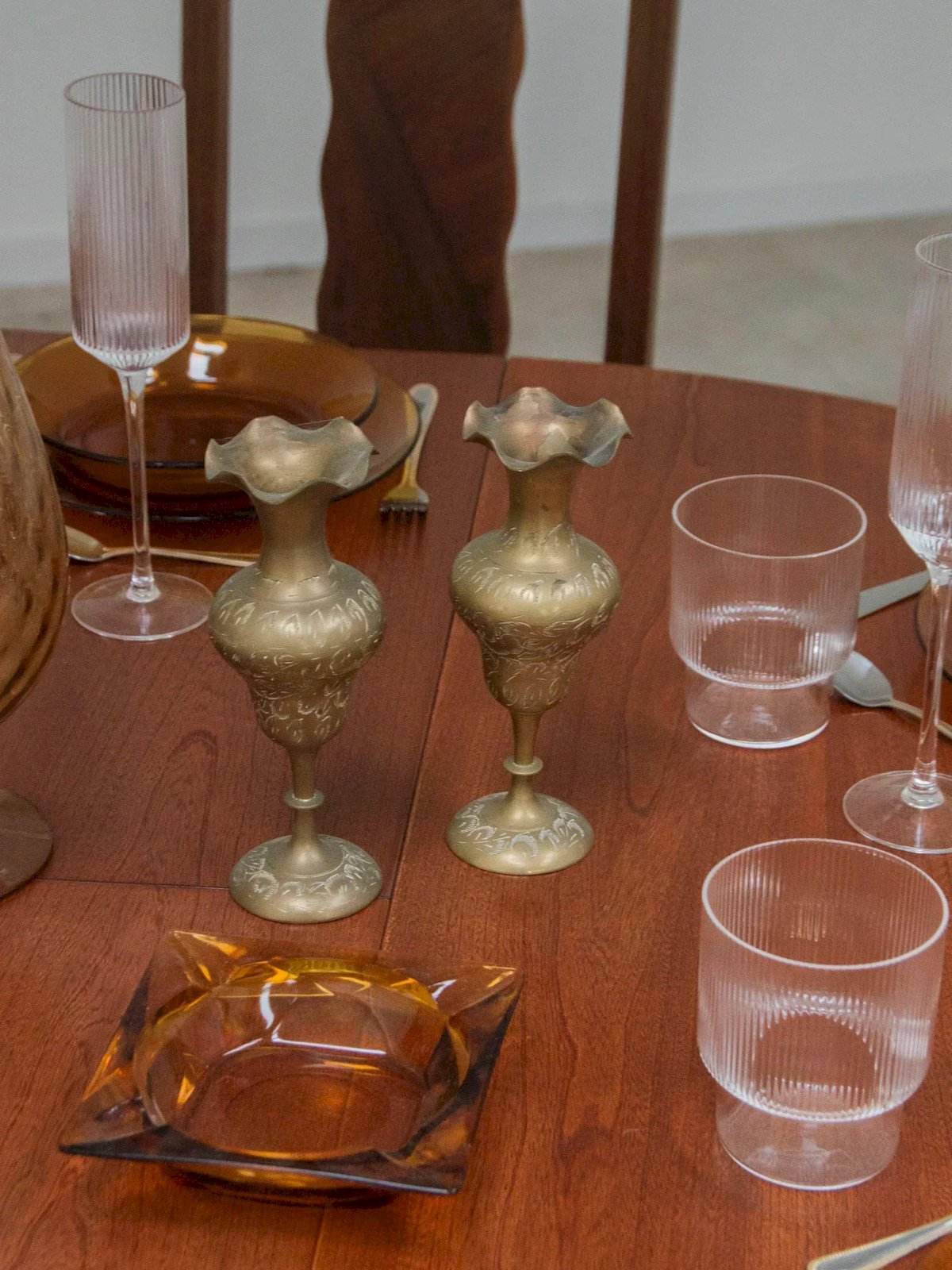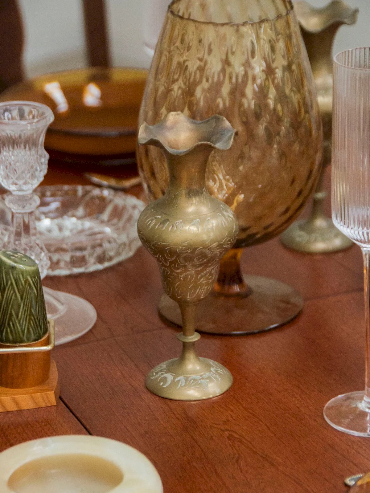 Discover this pair of sculpted brass candle holders in the shape of flowers, a blend of elegance and delicacy. Their organic silhouette adds a poetic touch to a table, a fireplace, or a shelf, diffusing warm light for dinners or everyday use. The patinated brass lends a subtle presence and beautiful material, ideal for an intimate and refined atmosphere, complementing both contemporary interiors and more traditional decor. Slight signs of use are present. Height: 20 cm Diameter: 7 cm Condition: Used: Item has been used. Item shows some superficial signs of wear, entirely operational and functioning correctly. It may be a demonstration model or an item returned to the store after a short period of use. Possible imperfections. Brand: Debongout Type: Vintage product Material: Brass Style: Contemporary