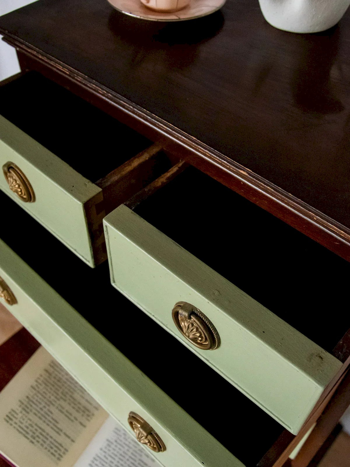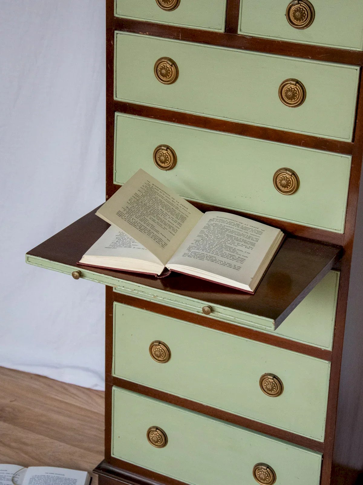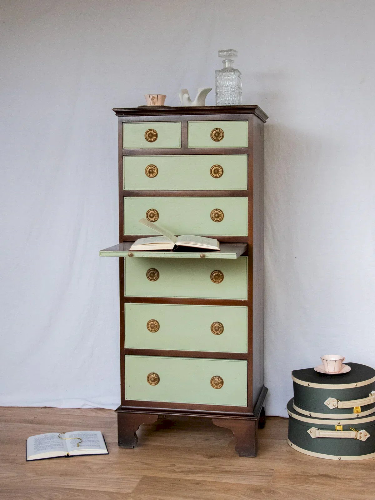 Adopt this English chiffonier - secretary, fully restored to regain a sober and practical elegance. Its tall silhouette reveals seven storage drawers and a secretary top that unveils a discreet writing space, ideal for a home office or a refined bedroom. The repainting of the drawers in green adds a controlled splash of color, punctuated by rounded double brass handles that highlight its vintage character. Its narrow format easily fits into urban interiors. Traces of the past spent noting on this authentic lady's chiffonier straight from England. Length: 49 cm Width: 41 cm Height: 117.5 cm Drawer height: 7 cm Condition: Used: Item has been used. Item shows some superficial signs of wear, ...Used: Item has been used. Item shows some superficial signs of wear, fully operational and functioning properly. It may be a demonstration model or an item returned to the store after a short period of use, along with any possible imperfections. Brand: Debongout Type: Vintage product Material: Wood, Brass Style: Country Customizable: Chests of drawers.