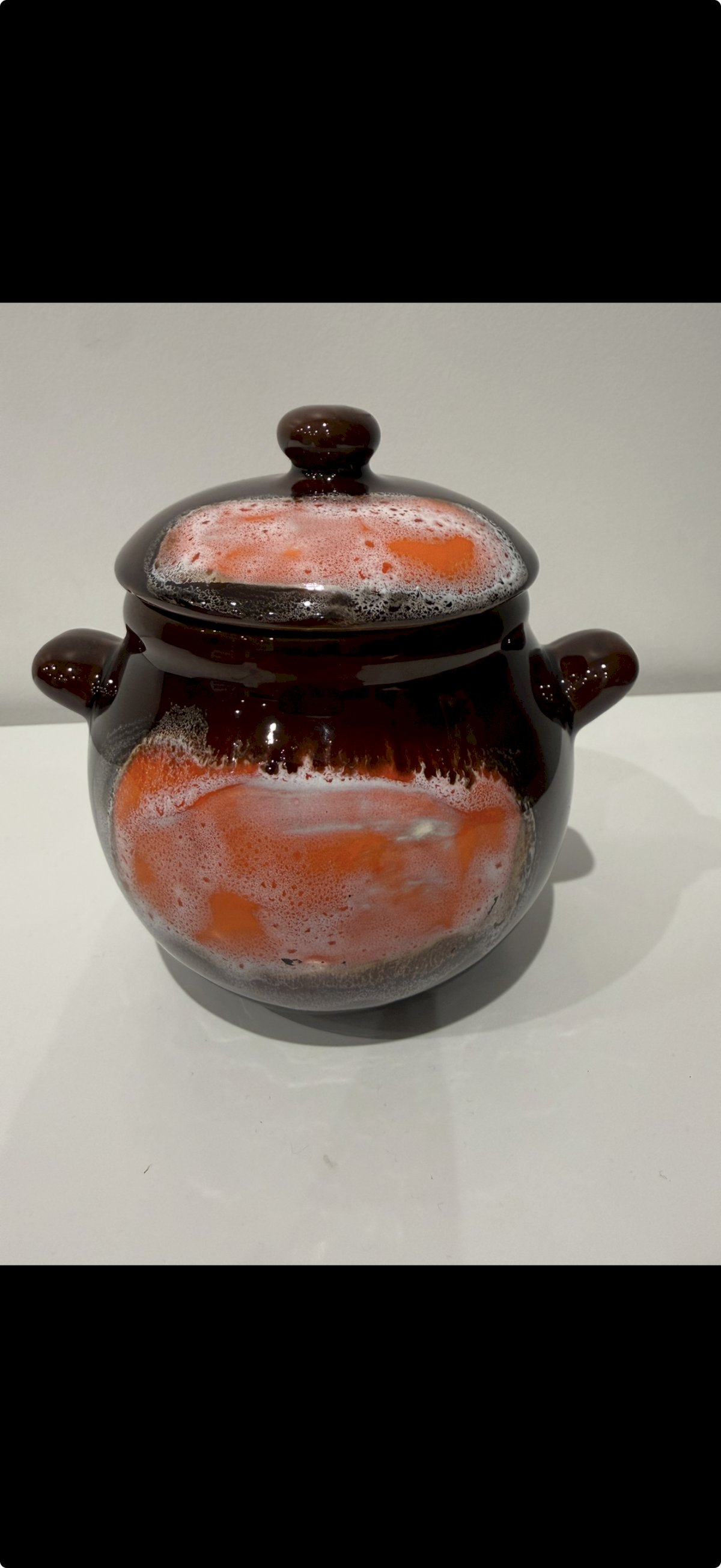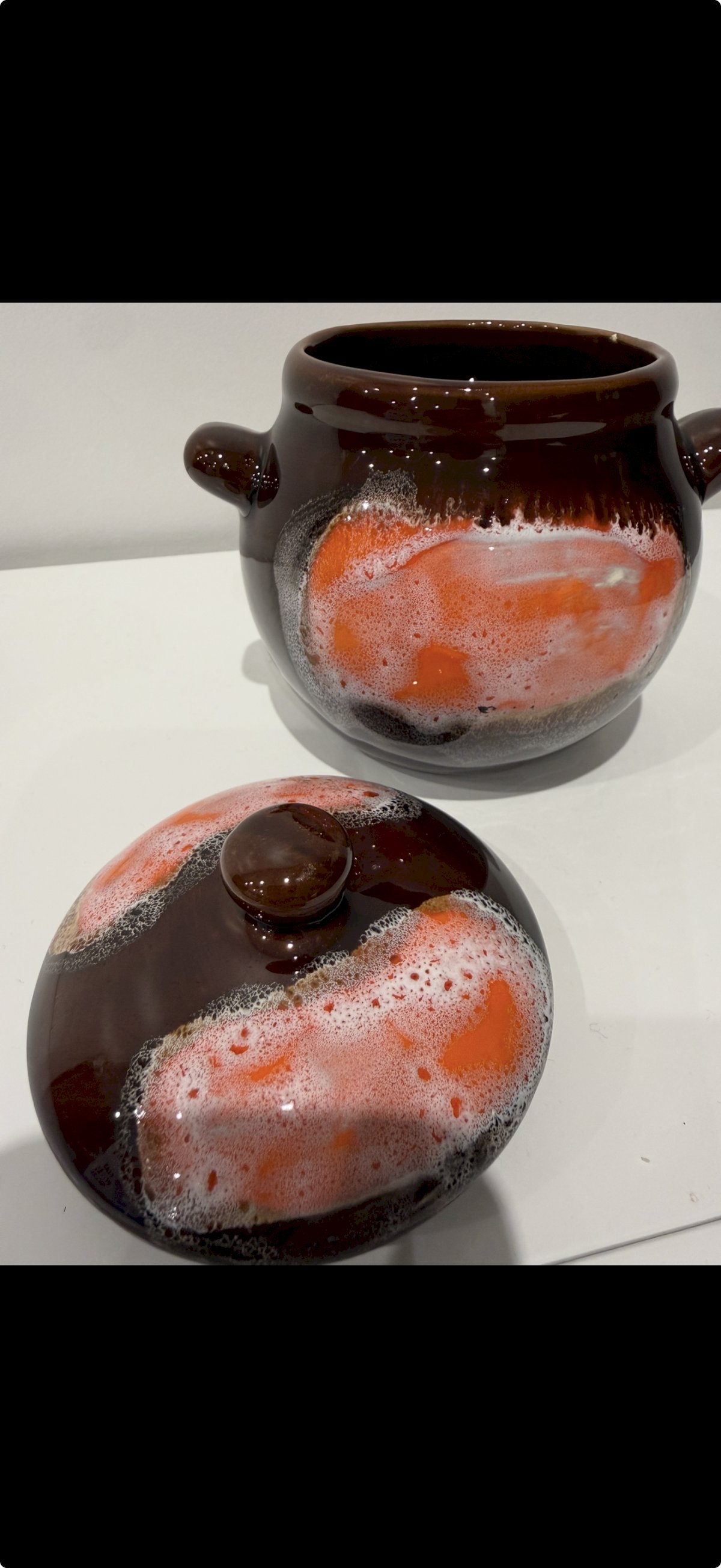 Vintage Ceramic Candy Bowl from Vallauris - Unique Piece. This superb ceramic candy bowl from Vallauris, dating from the 1950s-1960s, is a true gem for collectors and lovers of earthenware. With its compact dimensions (height 13 cm, opening diameter 8 cm, width 14 cm), it is ideal for decorating an interior while providing an elegant storage solution for your small treasures. Crafted in the renowned workshops of Vallauris, this piece is distinguished by its vibrant colors and careful glazing, typical of the post-war style of this region. The raised floral pattern on the lid, combined with a bright orange background, showcases the exceptional craftsmanship of Vallauris artisans. Perfect for vintage ceramic enthusiasts, this candy bowl will add a touch of retro charm to any room.