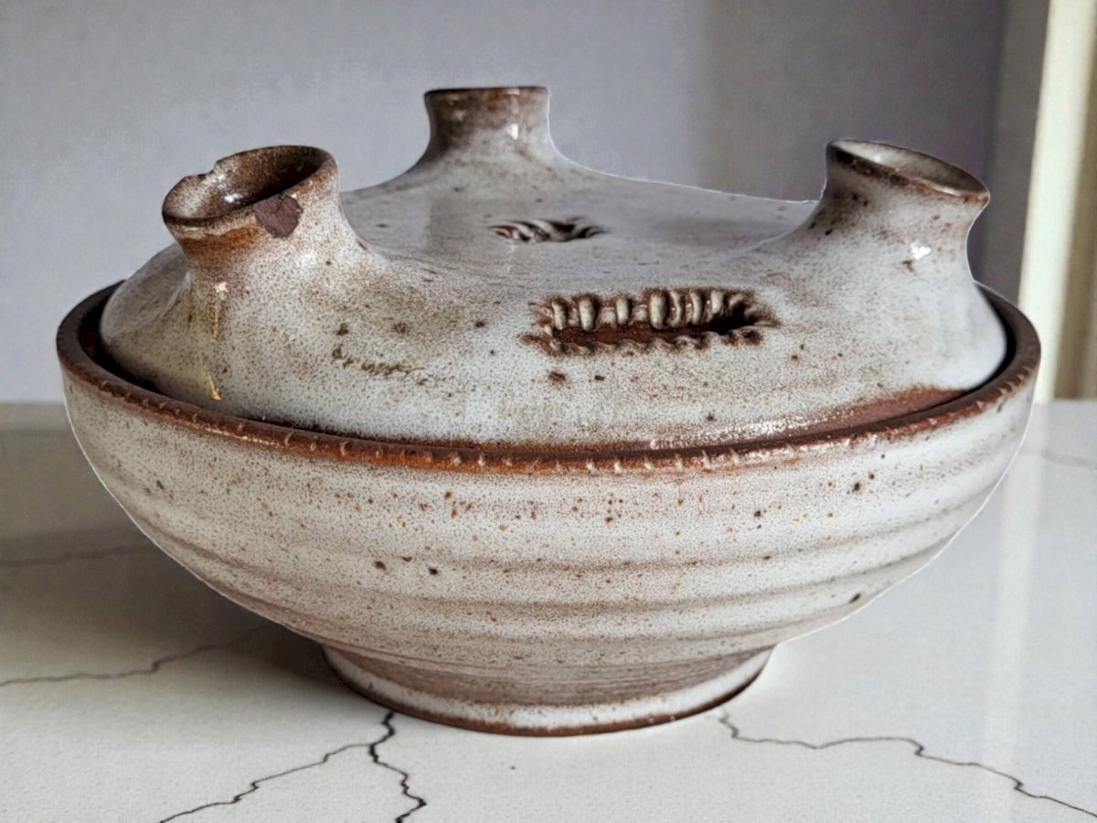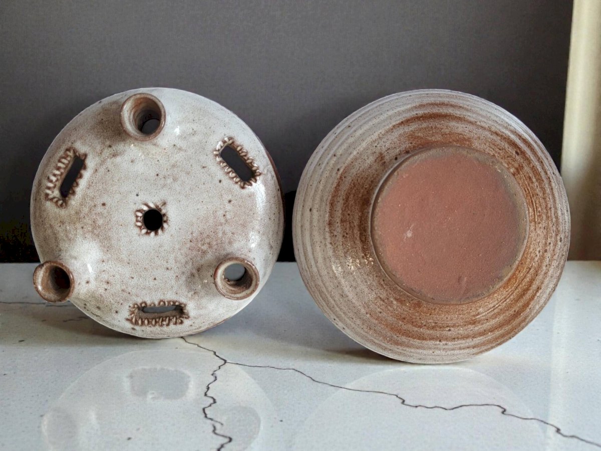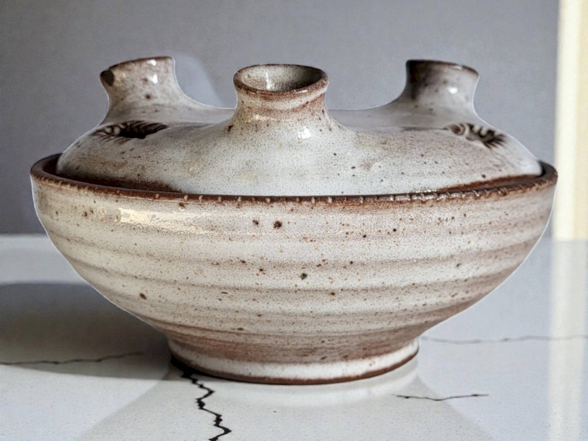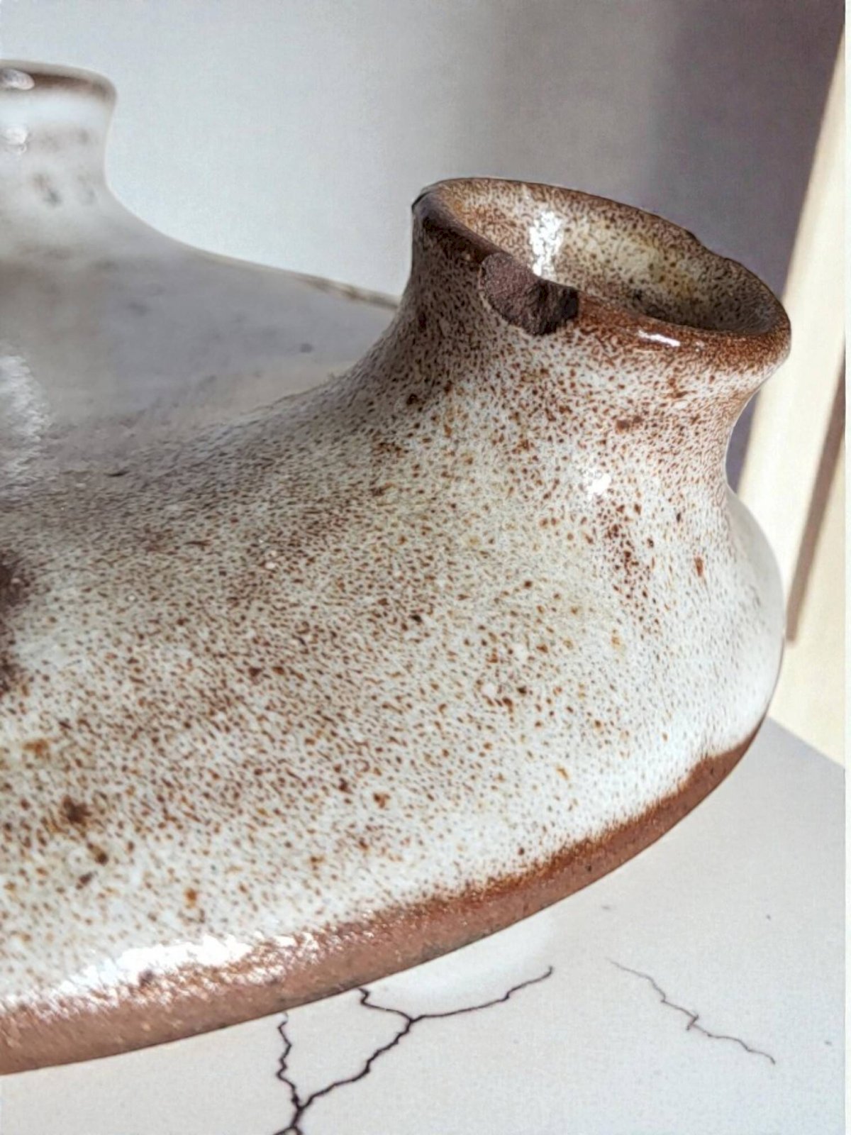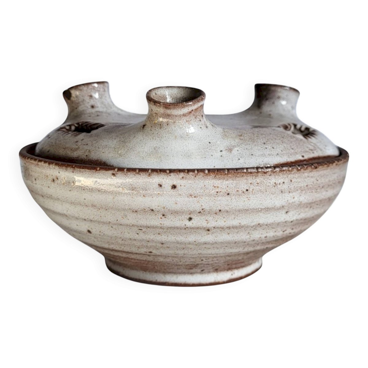 Ratilly / Pierlot / Puisaye stoneware flower vase. Height 9.5 cm. Diameter 15.7 cm. There are 2 chips on the neck. Careful packaging and fast delivery. L: 15 W: 15 H: 9