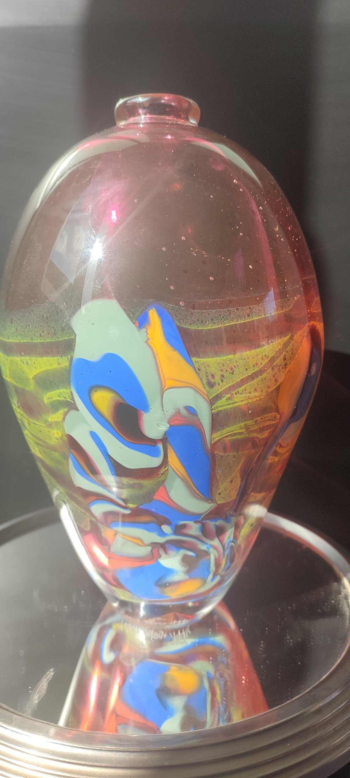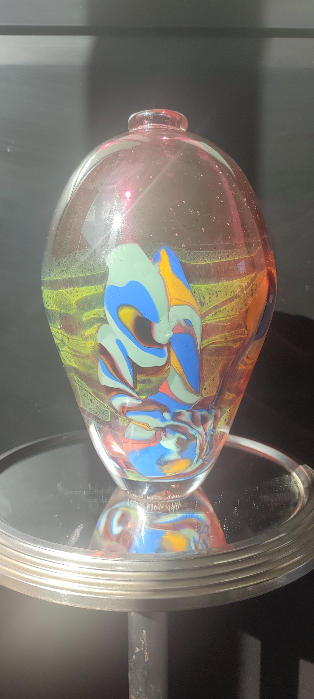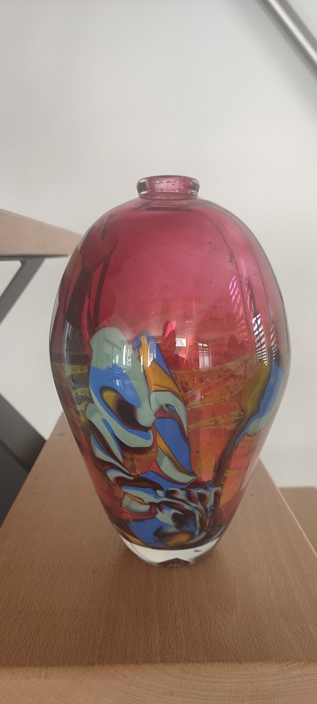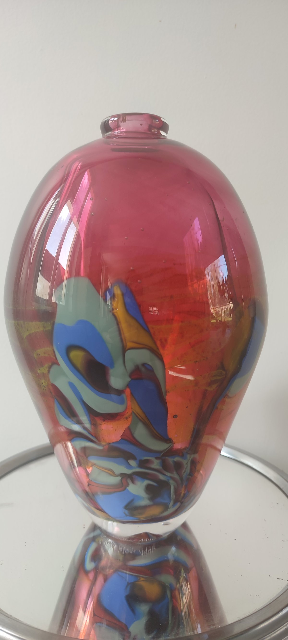 Unlike the artist's lighter pieces, this "sculpture" vase stands out for its mass and the complexity of its internal decor, making it a highly sought-after gallery piece among contemporary glass collectors.