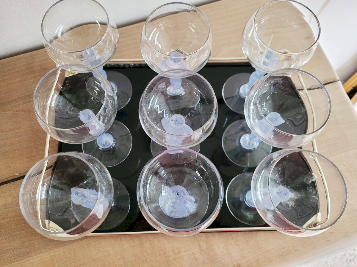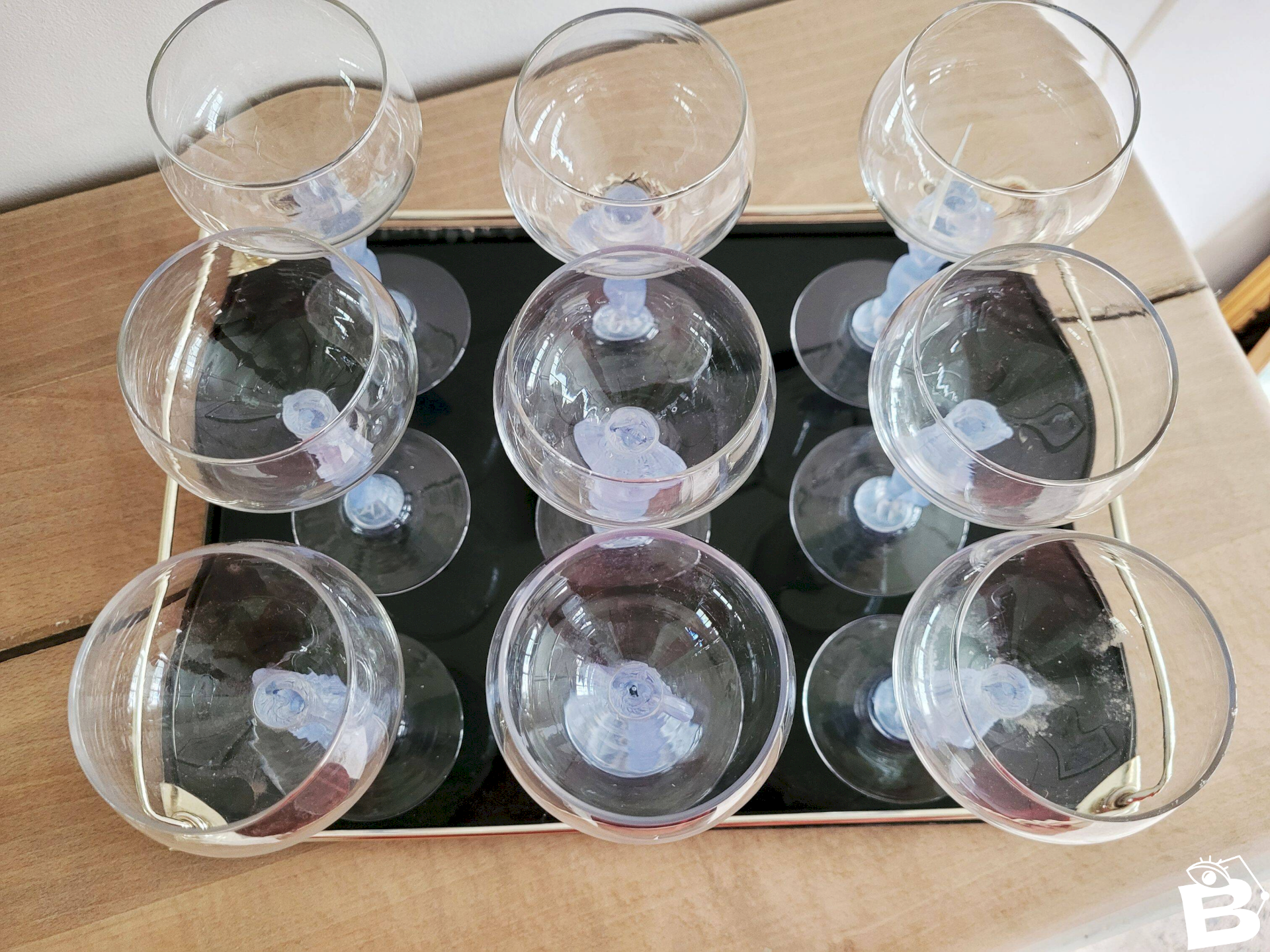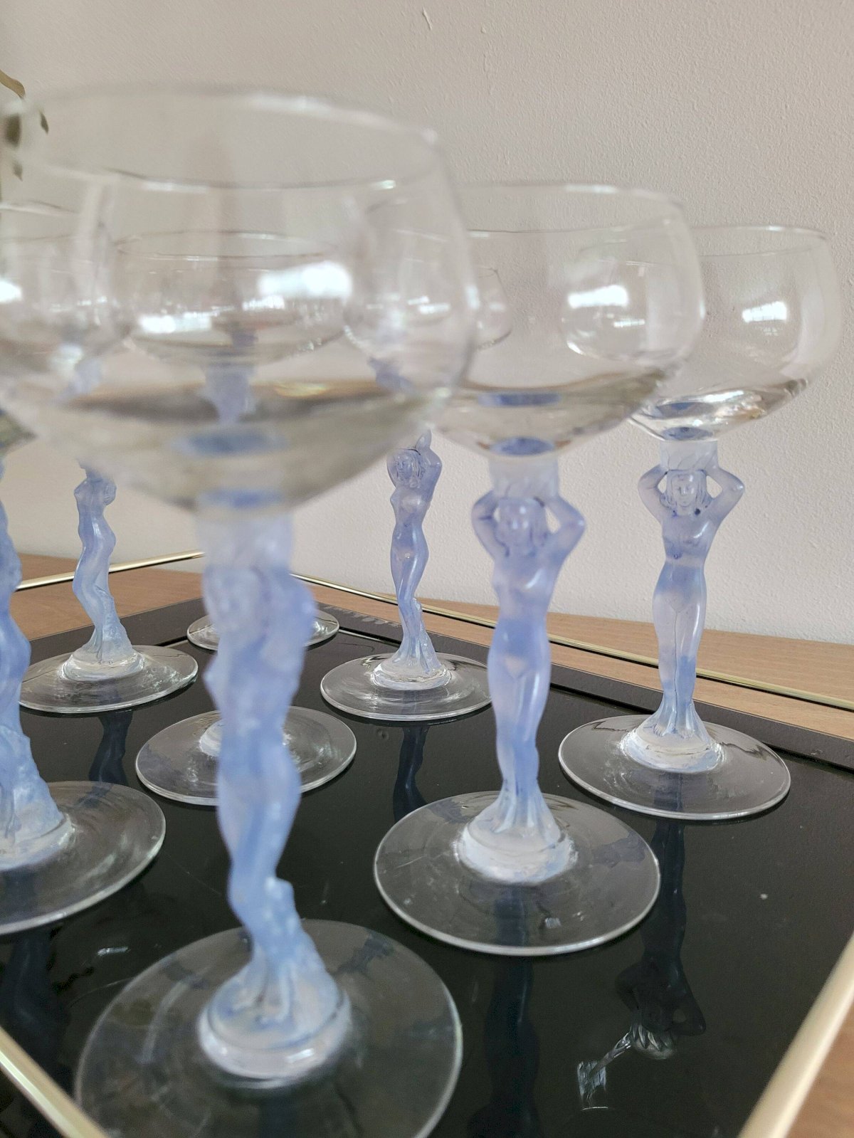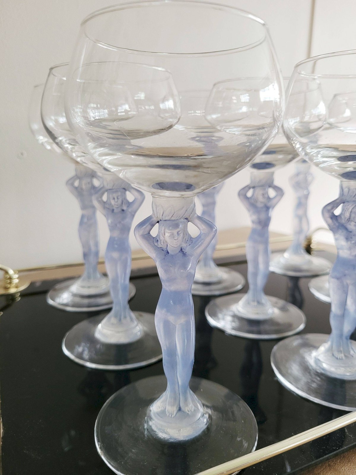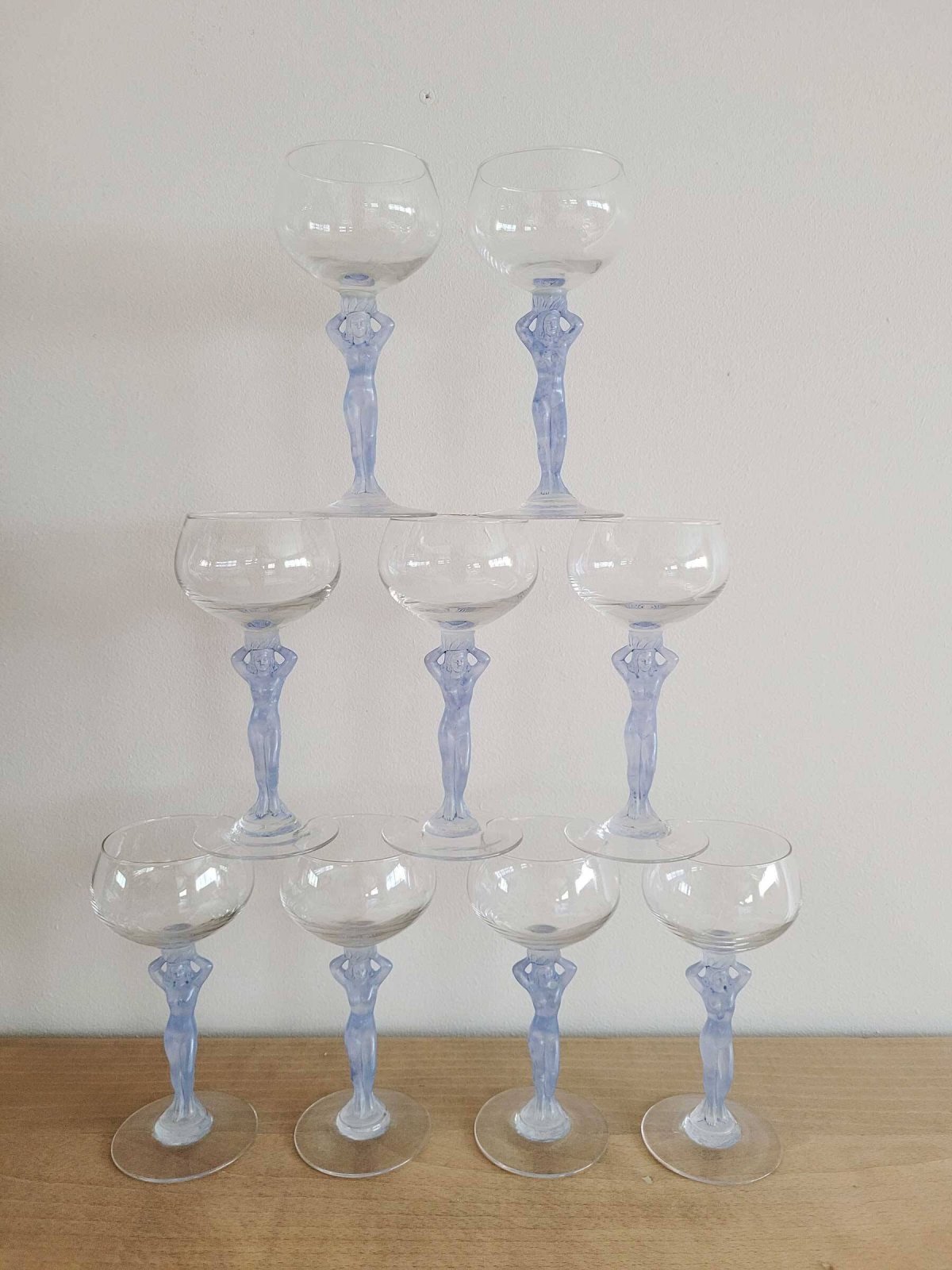 Here are nine glasses from the famous "Venus" series of the Bayel crystal factory in France. The foot represents a feminine figure in frosted glass with a velvety "frosted" blue color, while the bowl is made of crystalline glass. Original, this set is a gem for lovers of table arts! In generally good condition (see photos). Dimensions: Height: 14 cm. Shipping possible by post! L: 6 W: 6 H: 14