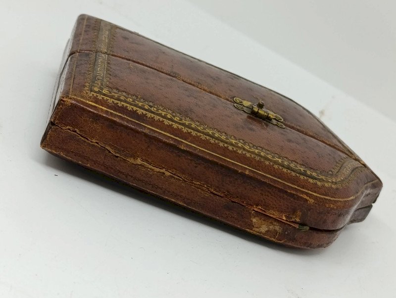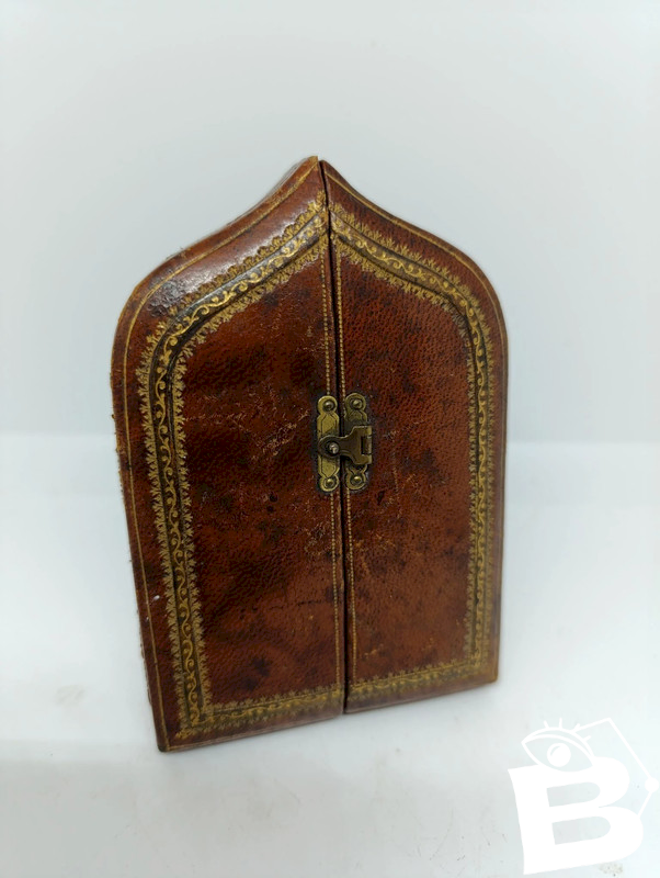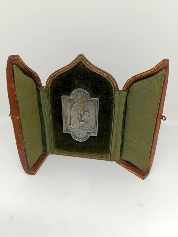 Very beautiful old religious triptych from the late 19th century, with an inner medallion representing Christ in good condition. Certainly a unique model marked ML and dated 1899. General good condition, but the inner hinge is a bit loose, some missing parts, and some wear on the exterior leather. It can be mounted thanks to a stand at the back. Closed dimensions are 12.5 x 8.5 cm, thickness 2.5 cm...