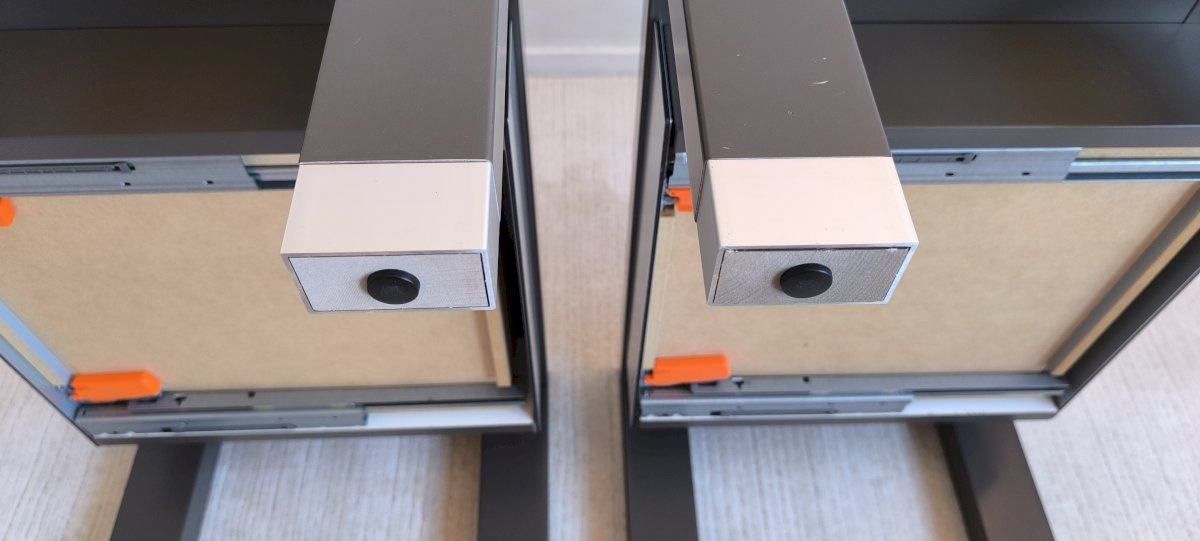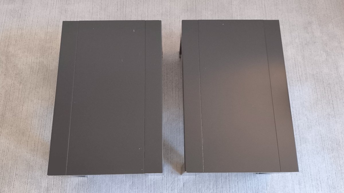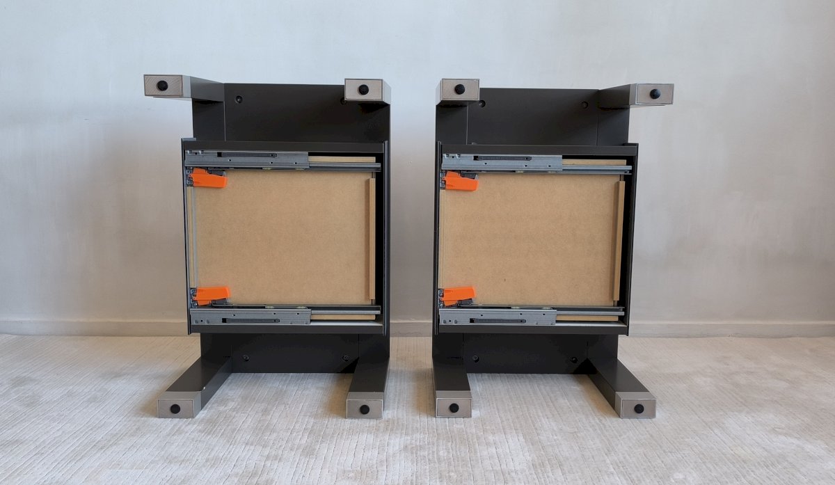 Structure made of gray lacquered ebony oak with a drawer in DIBOND (a precious aluminum alloy); the drawer mechanism features a clever self-closing brake system.
