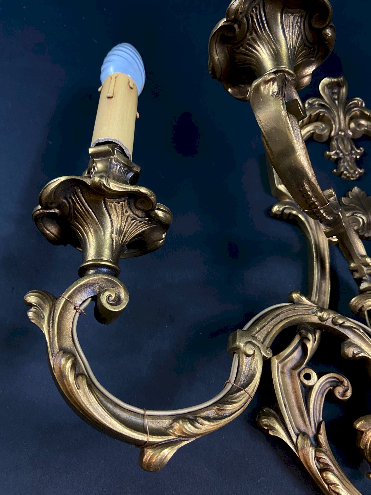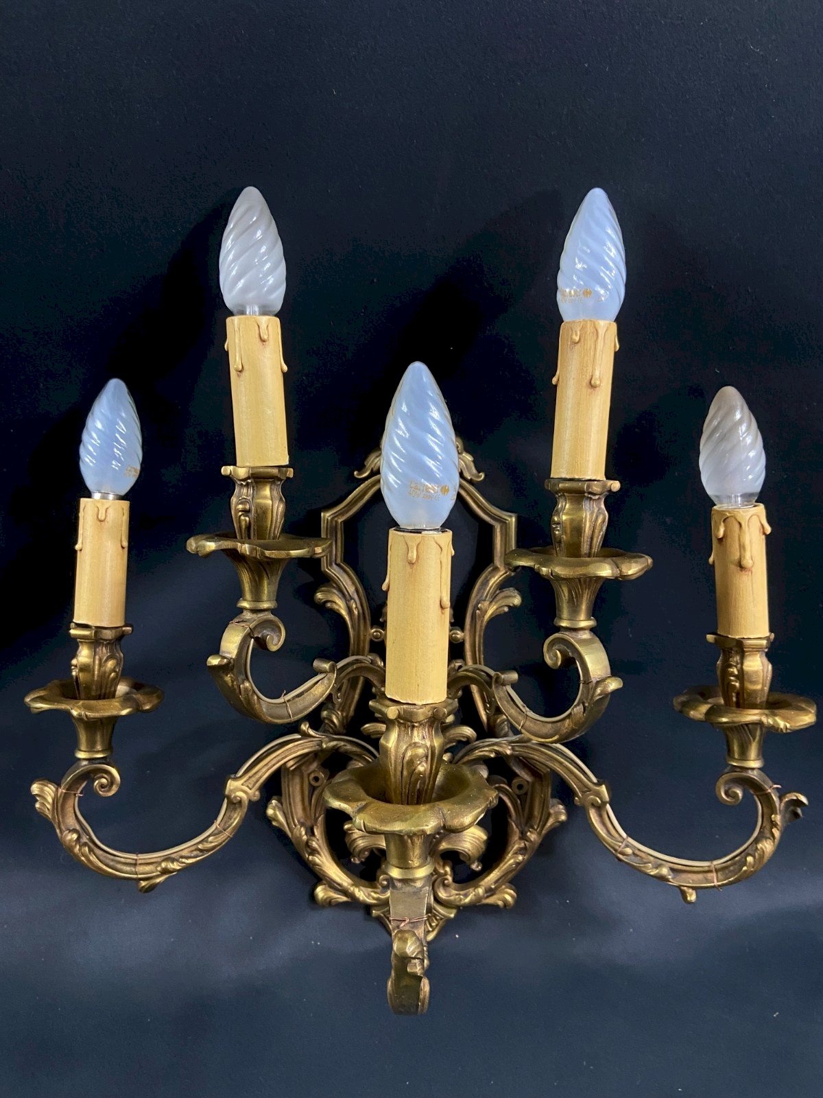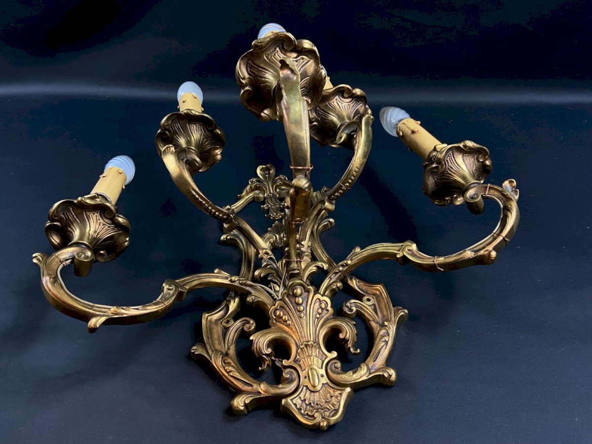Superb very important 5-light bronze wall sconce in Louis XV style, 20th century period. Unquestionable elegance, unusual proportions. Maximum dimensions: Wingspan 47.5 x Height with bulbs 50 x Depth 25.7 cm. Very nice density of material. Weight: 6113 grams. Very good condition. Bulbs not included. Ultra-secure shipping worldwide - Pickup of orders possible by appointment at 7 rue Notre-Dame, 18000 Bourges. - Possibility of grouping within the same package: please contact me in advance so that I can calculate your optimized shipping costs. Type: Wall sconce, Period: 19th century and earlier, Country of origin: France, Subtype: Interior, Material: Bronze, Style: Louis XV, Neoclassical.