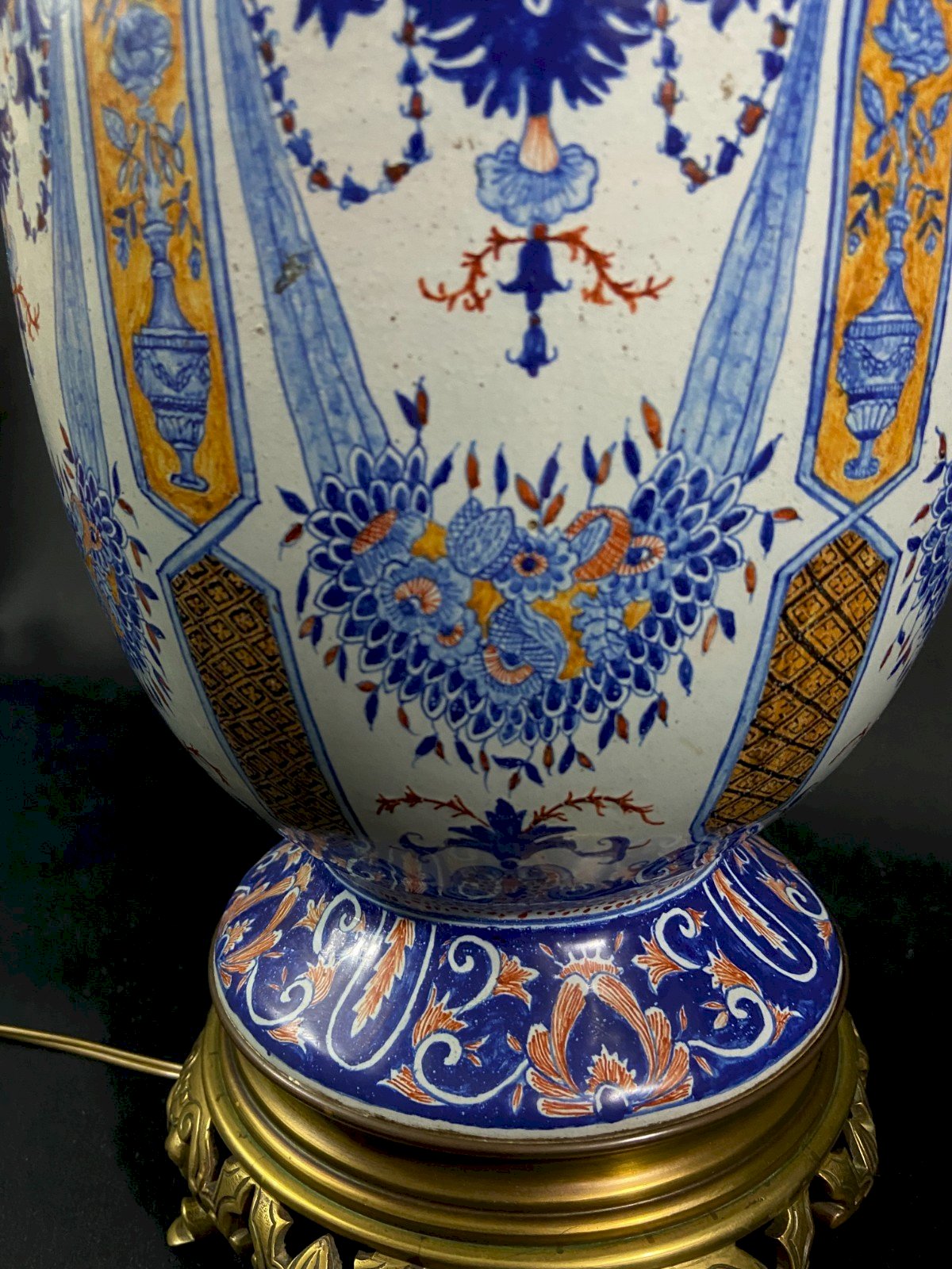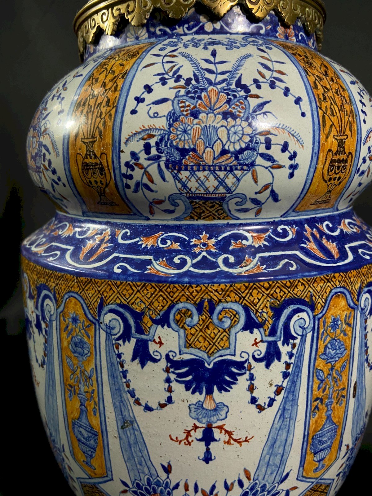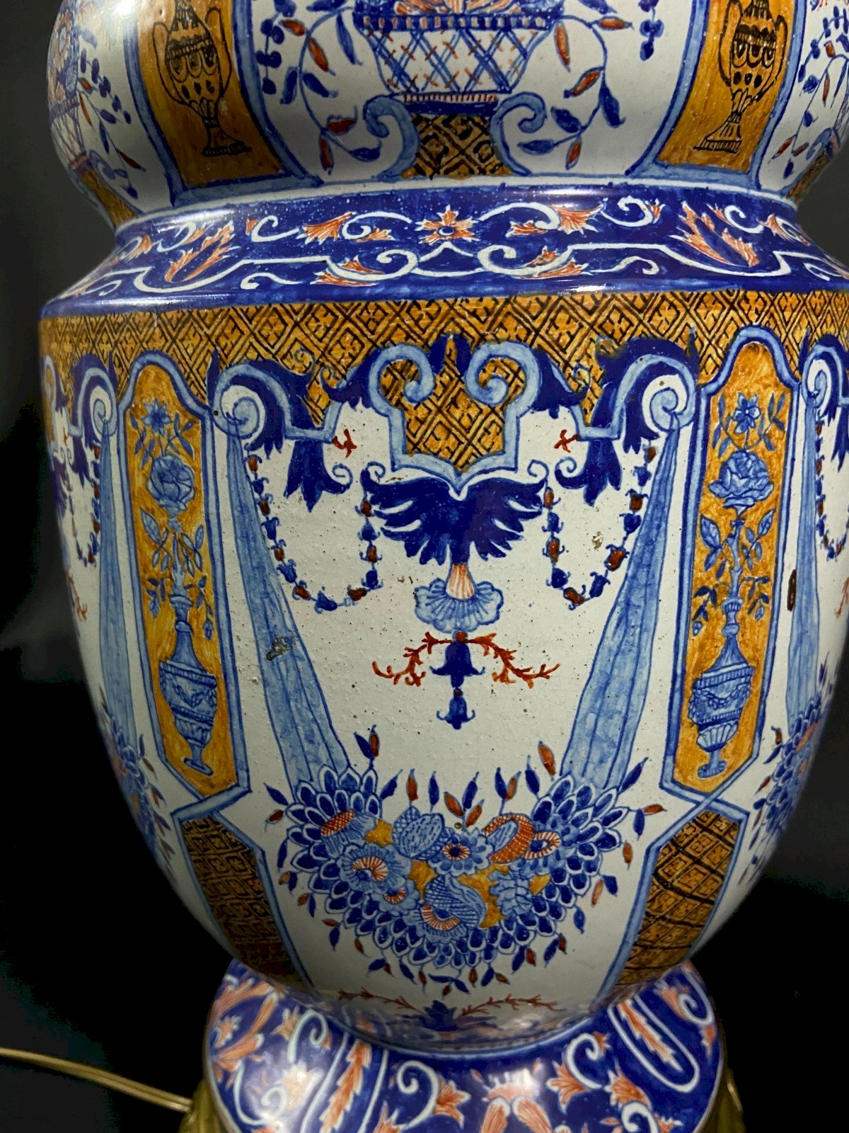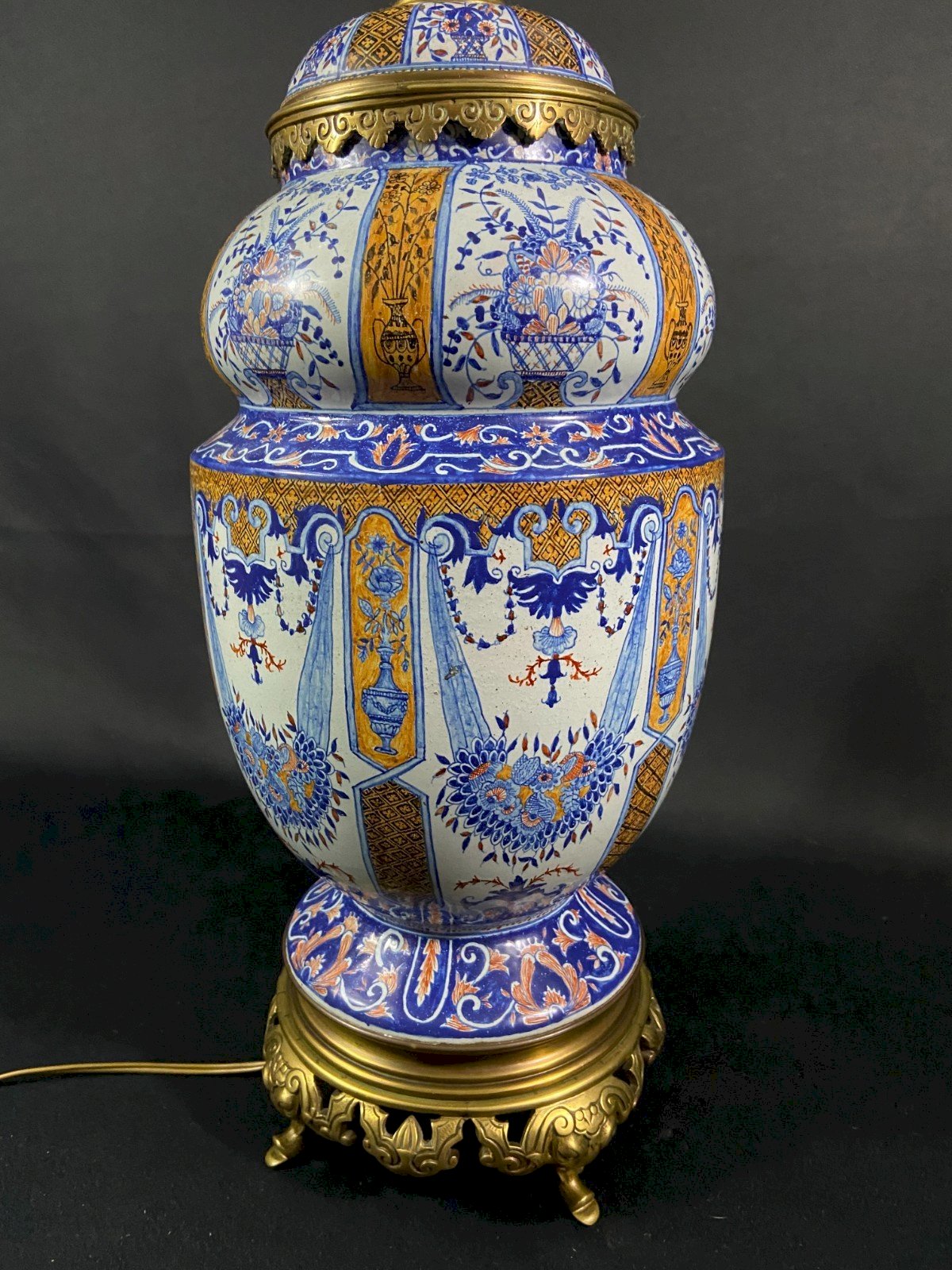 Impressive BEAUTIFUL very large porcelain lamp from Desvres on a bronze mount, late 19th century, 1880. Former oil lamp now electrified. Decoration in Rouen style with vertical panels alternating baskets of flowers, fire pots, and ochre diamond-shaped mesh, garlands, and blue volutes. Undeniable elegance. Very beautiful proportions. Maximum dimensions: Total height: 74 cm / Height of the porcelain only: 39 cm x 21 cm Weight: 6467 grams Shipping VERY worldwide Materials from: France Authenticity: Original Type: Display item, Decorative Brand: Desvres Origin: France Subtype: Lamp, Lantern Height: 74 cm Material: Bronze Style: Renaissance Width: 21 cm