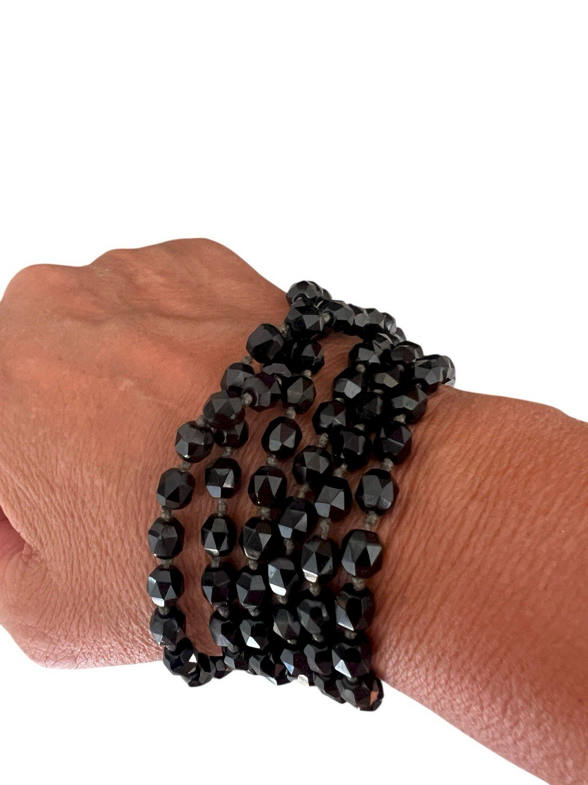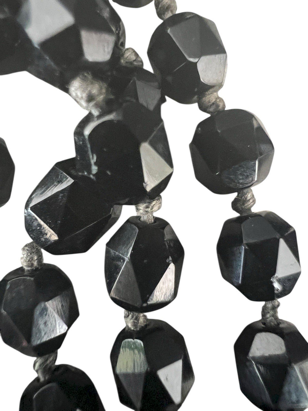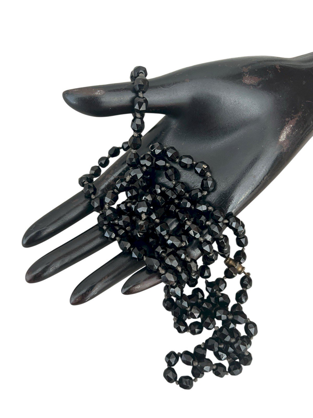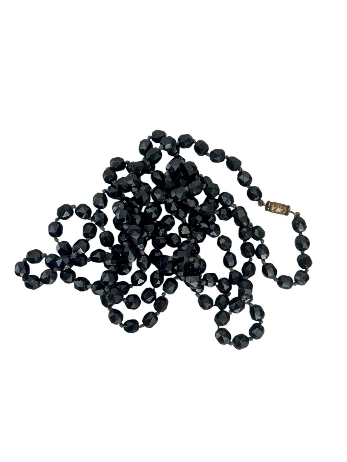 Very long antique jet bead necklace, 140 cm, Charleston era. Elegant antique jet necklace – Magnificent and very long antique jet bead necklace, a testament to the elegance of the Roaring Twenties (1920-1929), also known as the Charleston era. Measuring a total of 140 cm, it offers great versatility. Its total length allows for a wear of approximately 68 cm once around the neck, but it can also be worn in multiple ways, such as a multi-strand necklace or as a bracelet, wrapped around the wrist, as shown in the photo. This quality jewelry features a knotting technique between each bead, showcasing meticulous craftsmanship and preserving the integrity of the piece. The necklace is secured with a screw clasp, which is perfectly functional. Despite its great age, it is in very good condition with normal signs of wear for an object that has stood the test of time. It is the ideal piece to complement a vintage outfit or to add a touch of history and sophistication to your style. Condition: Worn item. Possible imperfections. Type: Pearl necklace Theme: Beads Dominant stone: Jet Color: Black Dominant color: Black Material: Stone Length: Over 90 cm