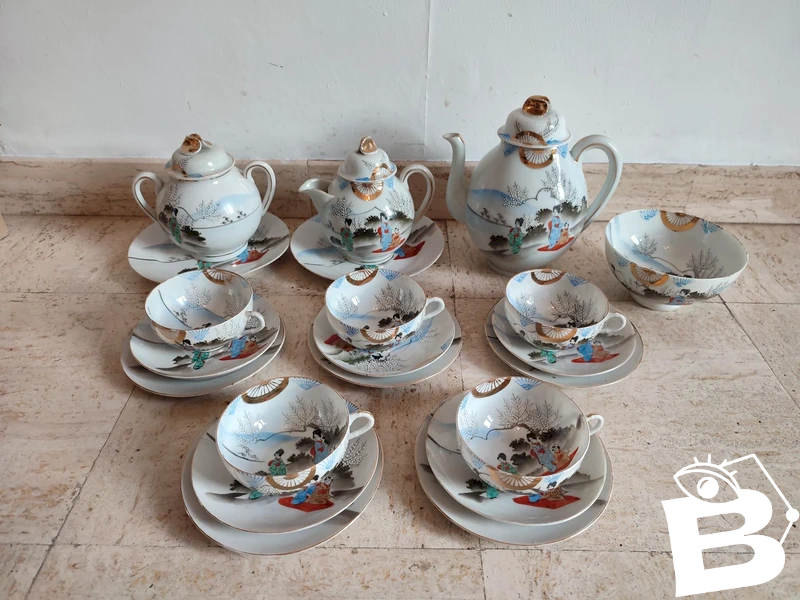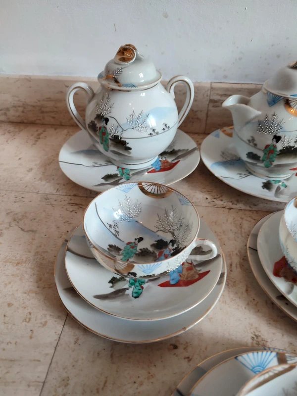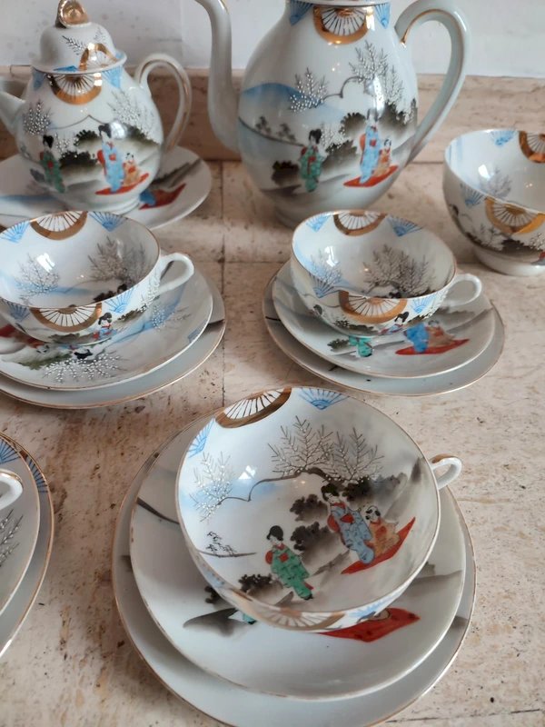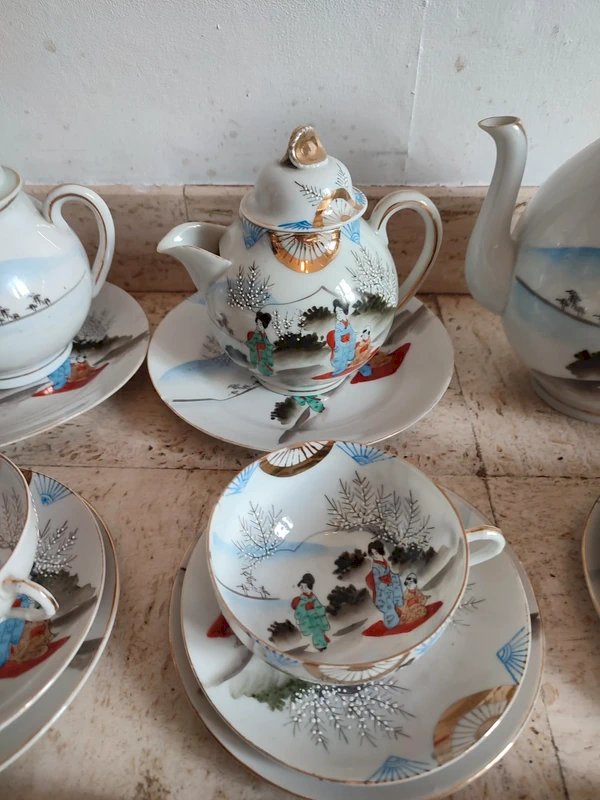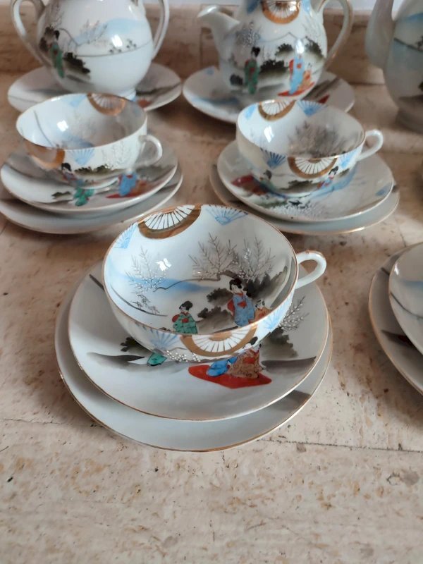 Very beautiful Japanese tea service for 5 people in good condition, 21 pieces. There are 5 cups with a diameter of 9.5 cm and a height of 5 cm, 5 plates with a diameter of 14 cm, 5 plates with a diameter of 15.5 cm, 2 plates with a diameter of 19 cm, a sugar pot with a height of 14.5 cm, a milk pot with a height of 14.5 cm, a teapot with a height of 20 cm, and a bowl with a diameter of 14 cm and a height of 7 cm. There are some signs of wear and small chips normal due to its age, nice work of drawing and painting, signature under the pieces to be determined.