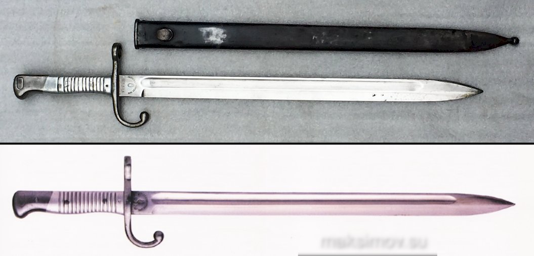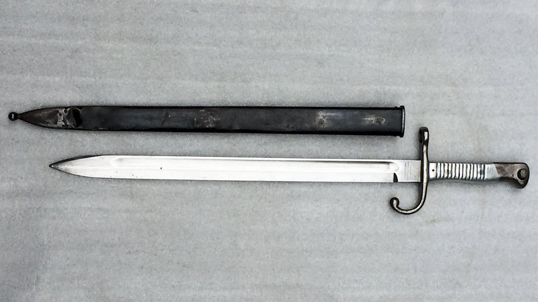Production then transitioned to a lighter grip made of an aluminum alloy with 6% copper, around mid-1893, approximately 190,000 bayonets were manufactured until 1898.