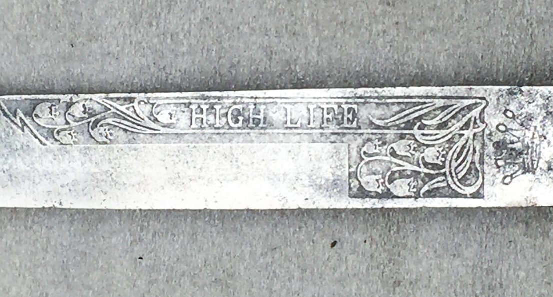 Superb and extremely rare knife. Bakelite handle decorated and inlaid. Blade engraved with floral decorations. Etching on the blade '' HIGH LIFE '' + floral decorations. Leather sheath in beautiful condition. Very pretty piece in beautiful condition of conservation and very rare. Very beautiful and robust piece, very pleasant to hold in the hands and even more to observe in the display case!