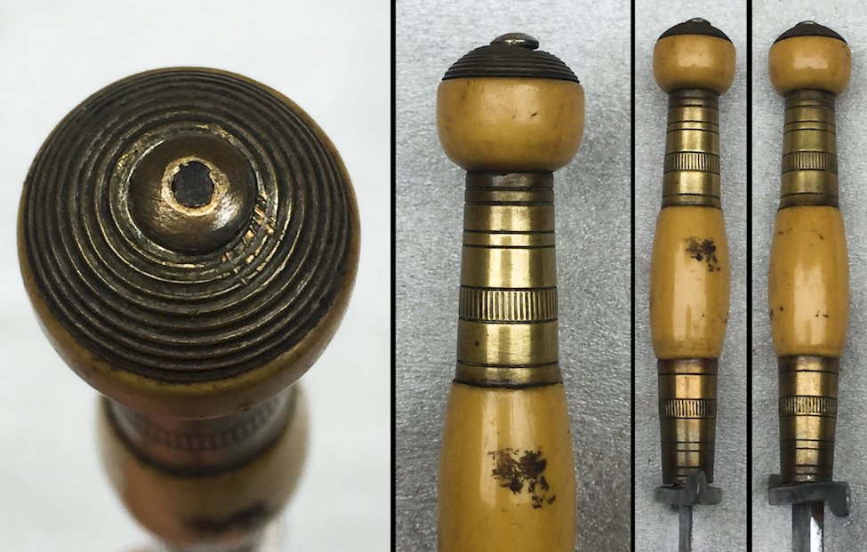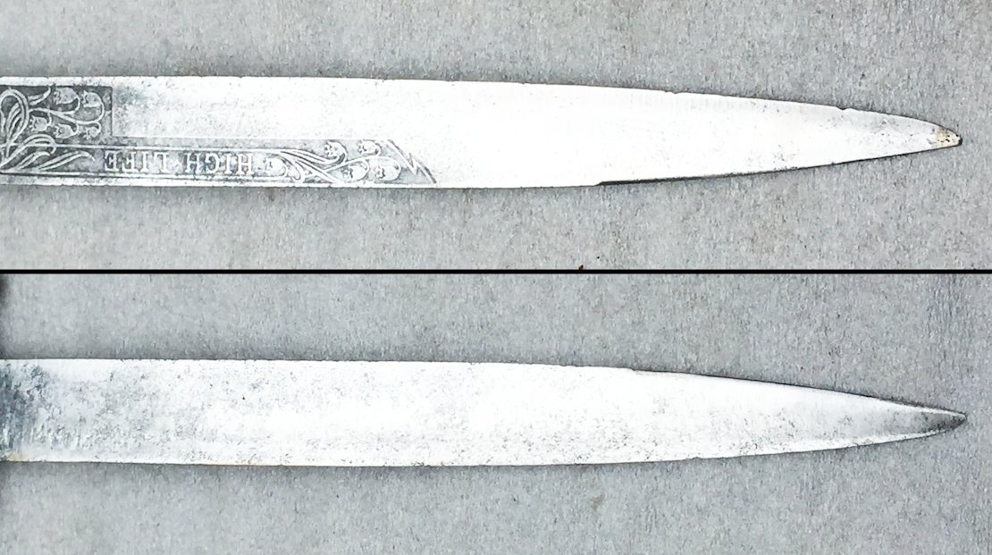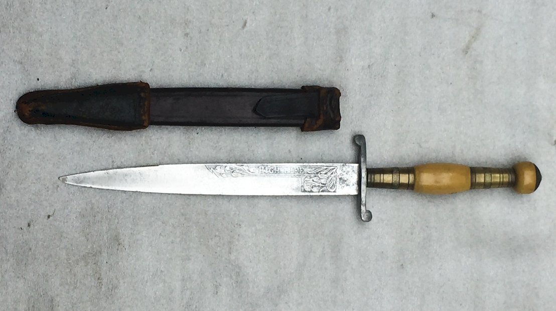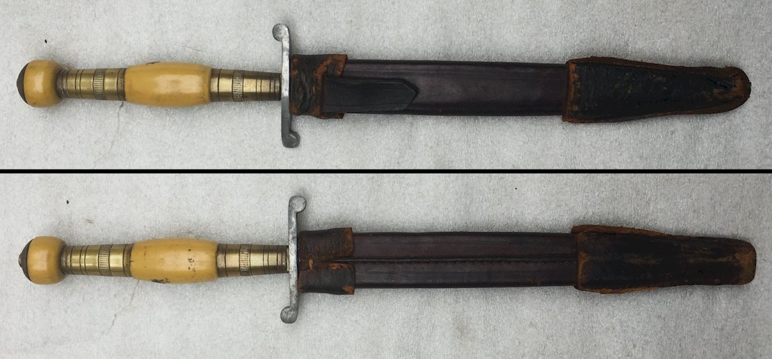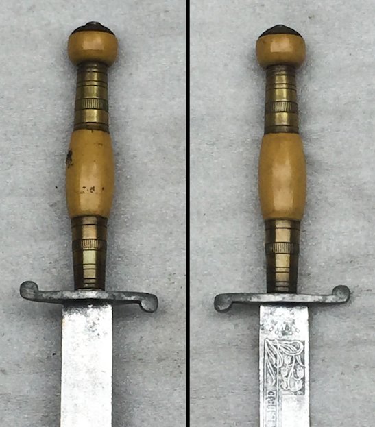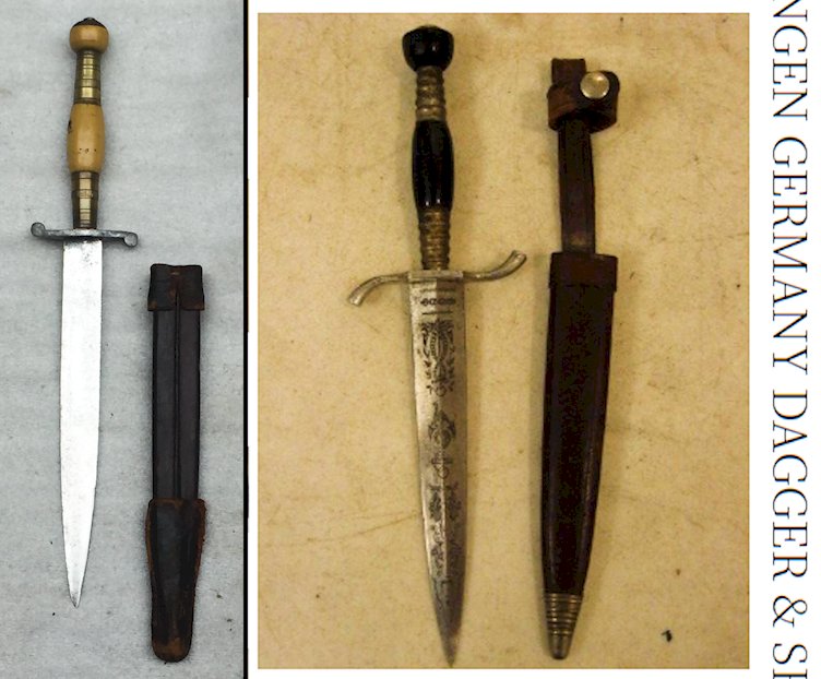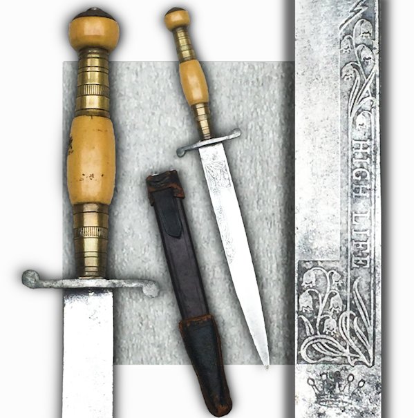 These knives were made in Solingen, Germany, for export to Brazil. They are believed to date from 1910-1927. Made in the typical northern Brazilian style called ''Faca de Ponta'' or (pointed knife) in English. These knives were usually carried by the wealthy as a sign of prestige, although banditos (highwaymen) also liked these long and sumptuous knives. The image of the lady with the heel is probably a princess or a royal queen. Some have suggested Princess Elizabeth or perhaps Queen Wilhemina of Denmark who sometimes had ties to the German nobility. (Estimated in expertise & auction house between 650-700 euros).
