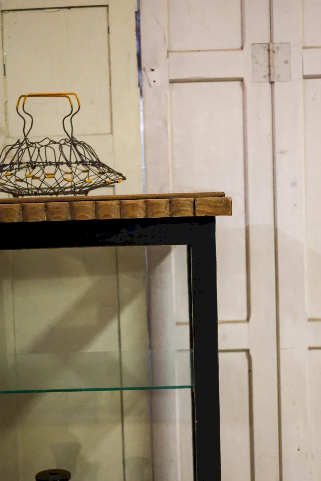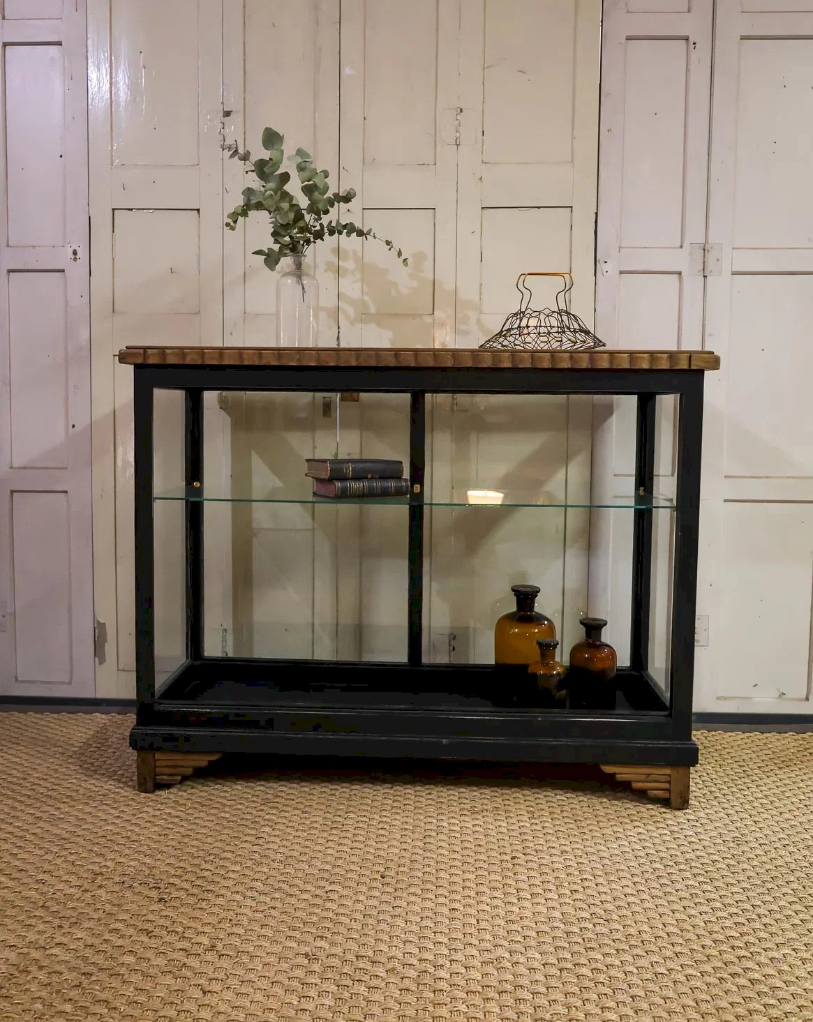 Enhance your interior with this Art Deco style display cabinet in contrasting black and white, where a sculpted wooden structure is paired with a luminous glass shelf. Its elegant proportions provide an ideal exhibition space for refined dinnerware, bound books, or collectibles, while the glass allows light to flow through and showcases each piece. Its graphic appearance adds a sophisticated and warm touch to the living room or entrance, merging function and aesthetics. Length: 119 cm Width: 43 cm Height: 93 cm Height of the glass shelf: 62 cm Condition: Used: Item has been used. Item shows some superficial wear marks ... Used: Item has been used. Item shows some superficial wear marks, fully operational and functioning correctly. It may be a display model or an item returned to the store after a short period of use, including any potential imperfections. Brand: Debongout Type: Vintage product Material: Wood, Glass Style: Contemporary Custom: Sideboards and display cabinets