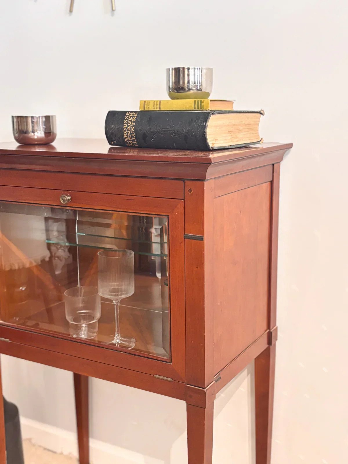 Discover our elegant English display cabinet, a piece of furniture that combines charm and functionality. With its refined design and meticulous finish, it will bring a touch of authenticity to your interior. Ideal for showcasing your precious items, this cabinet is also perfect for creating a discreet storage space. It represents a unique opportunity to add a classic and timeless piece to your decor. Length: 67 cm Width: 40.5 cm Height: 100.5 cm Condition: Used: Item has been previously used. Item shows some superficial signs of wear, fully operational and functioning correctly. It may be a demonstration model or a return item after a short period of use. Any potential imperfections. Brand: Debongout Type: Vintage product Material: Wood, Glass Style: Contemporary Customizable: Cabinets and display cases.