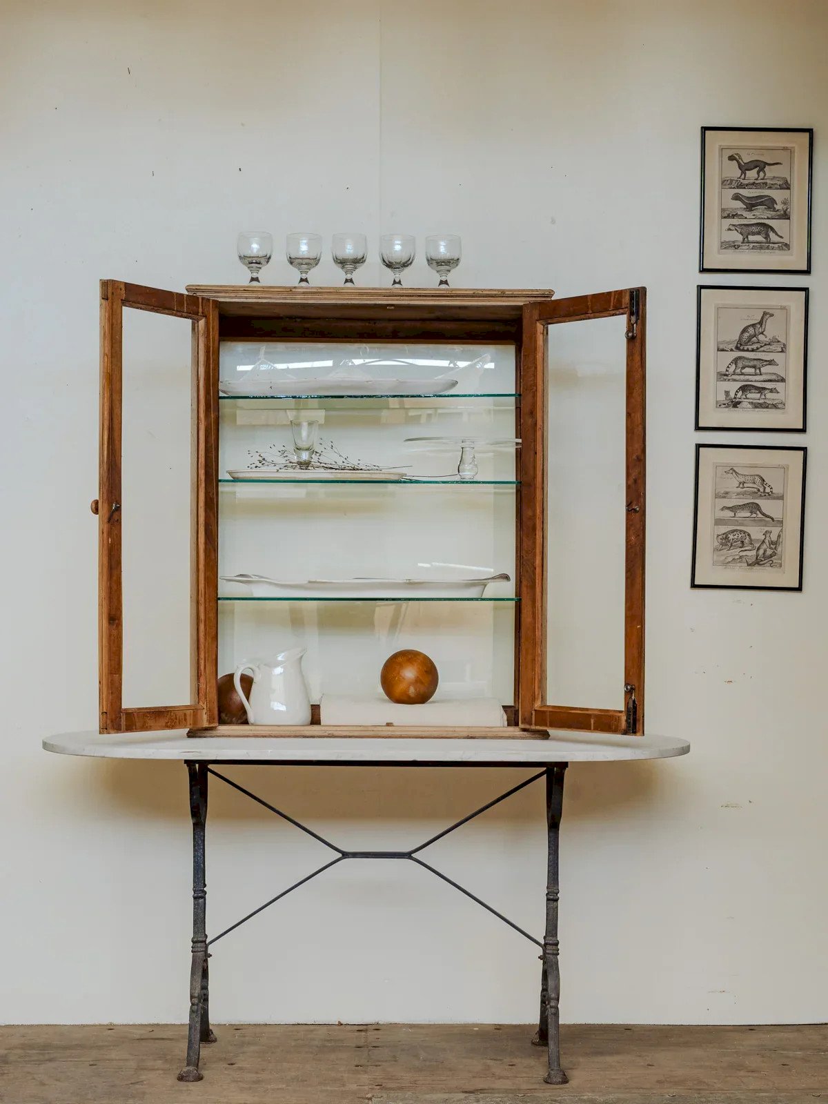 Enhance your interior with this blond walnut display cabinet, featuring a warm grain and an original wooden handle that gives it authentic elegance. Its lock closure and three modular glass shelves highlight dishes and objects, while its proportions fit both a living room and an entrance. Some signs of use that add to its authenticity. Length: 79 cm Width: 38.5 cm Height: 98 cm Condition: Used: Item that has been used. Item showing some superficial signs of wear, fully operational and functioning correctly. It may be a demonstration model or an item returned to the store after a short period of use. Possible imperfections. Brand: Debongout Type: Vintage item Material: Walnut, Wood, Glass Style: Contemporary Custom: Dish cabinets and display cases.