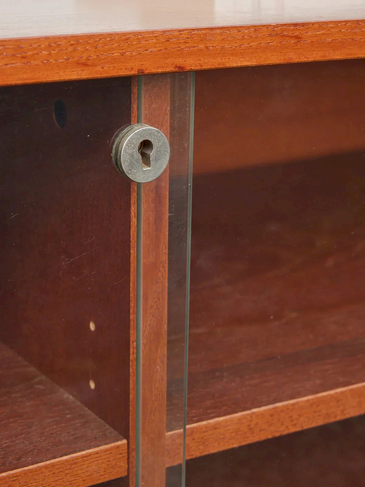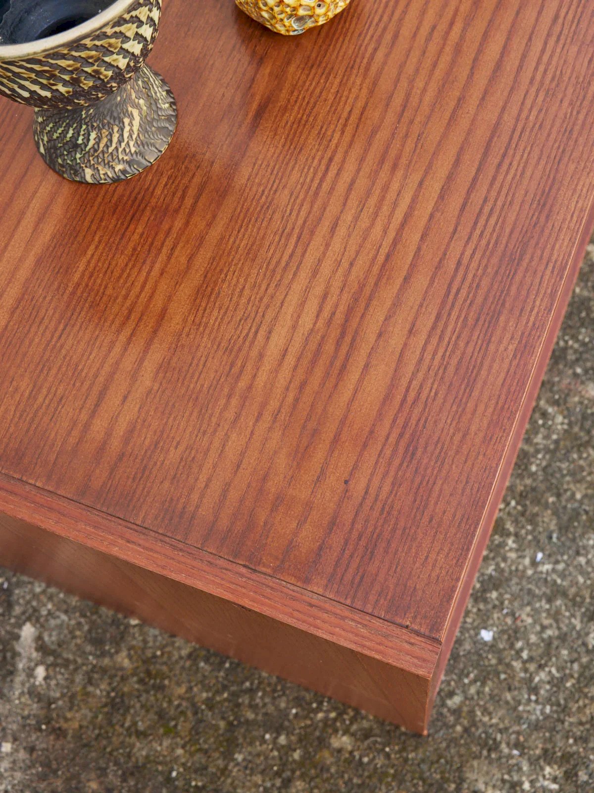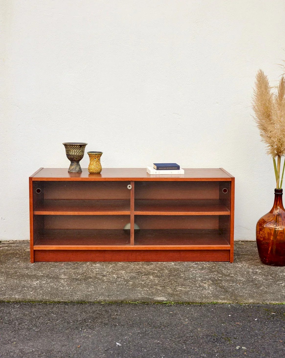 Discover this 70s TV unit made of teak veneer, featuring clean and warm lines that add a retro-Scandinavian touch to your living room. Its sliding glass doors reveal well-proportioned storage spaces while holes at the back facilitate cable management for an elegant and tidy setup. A small stain to note on the top, which has been refinished. Length: 117 cm Width: 50 cm Height: 50 cm Condition: Used: Item has been used. Item shows some superficial signs of wear, fully operational and functioning properly. It may be a demonstration model or a product returned to the store after a short period of use, with possible imperfections. Brand: Debongout Type: Vintage product Material: Wood Style: Contemporary Customizable: Display cabinets and showcases.