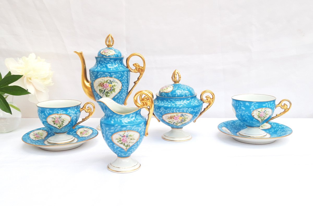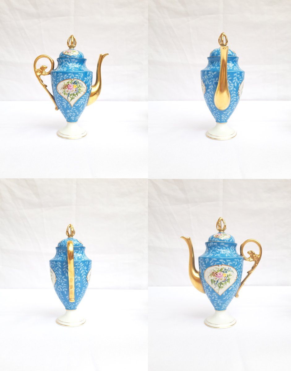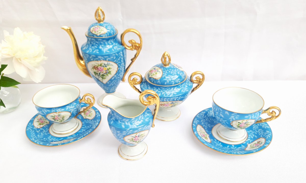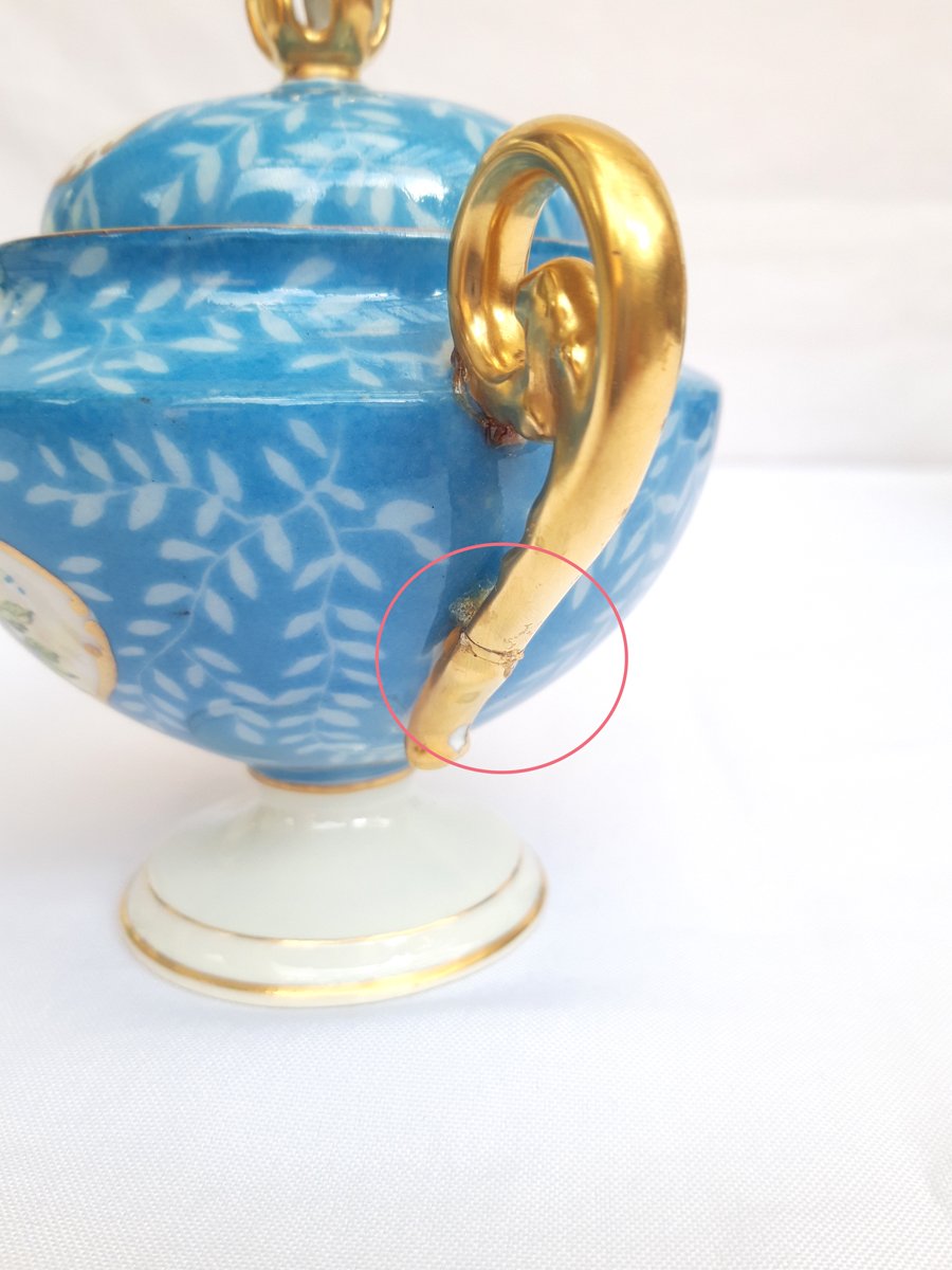 - traces of previous (durable) repairs on the handle of the teapot, one handle of the sugar bowl, one cup, and one saucer. Worn gilding in places on the handles.