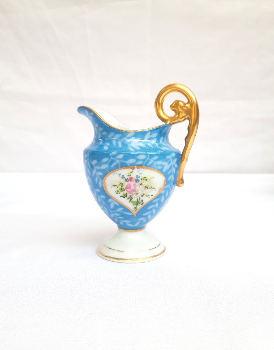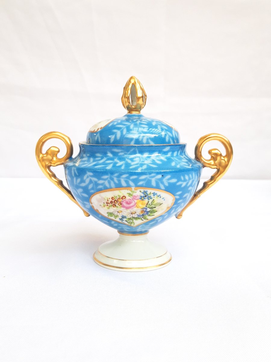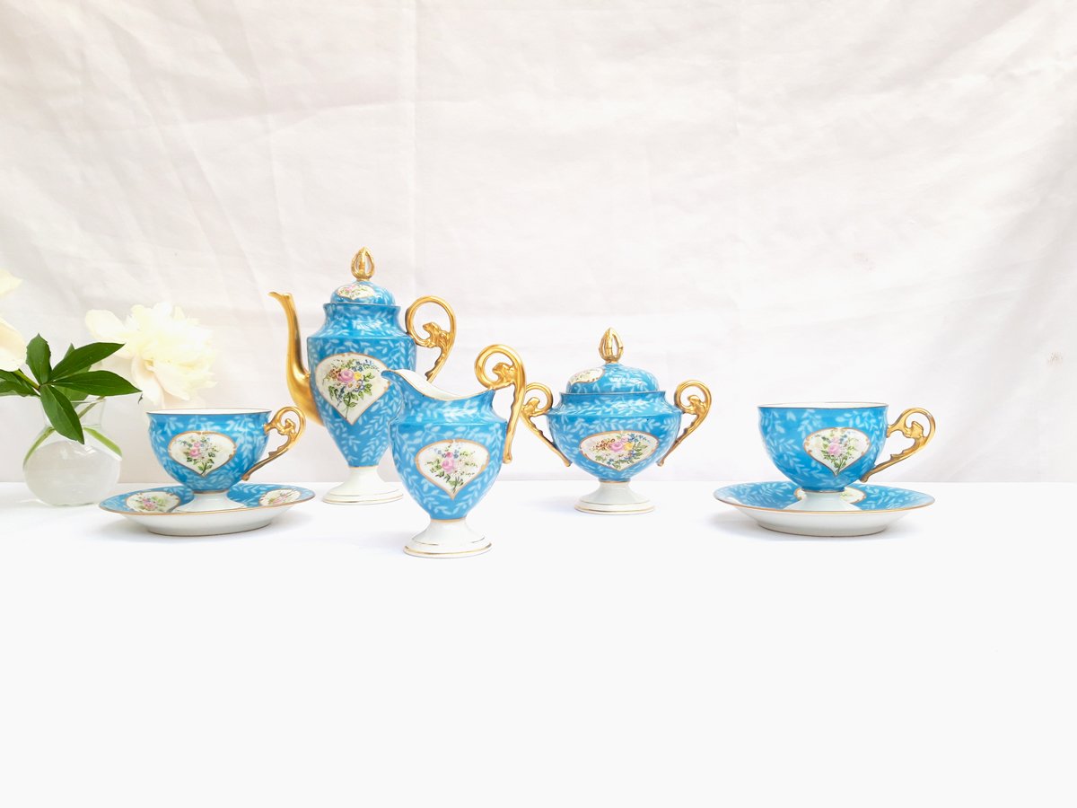 Elegant pedestal pieces in Victorian/Napoleon III style, very graceful baroque design, with decor inspired by 19th-century Sèvres style: white porcelain with floral decorations in reserve on a celestial blue background, with gold scrolls and borders, and all handles and grips enhanced with liquid gold.