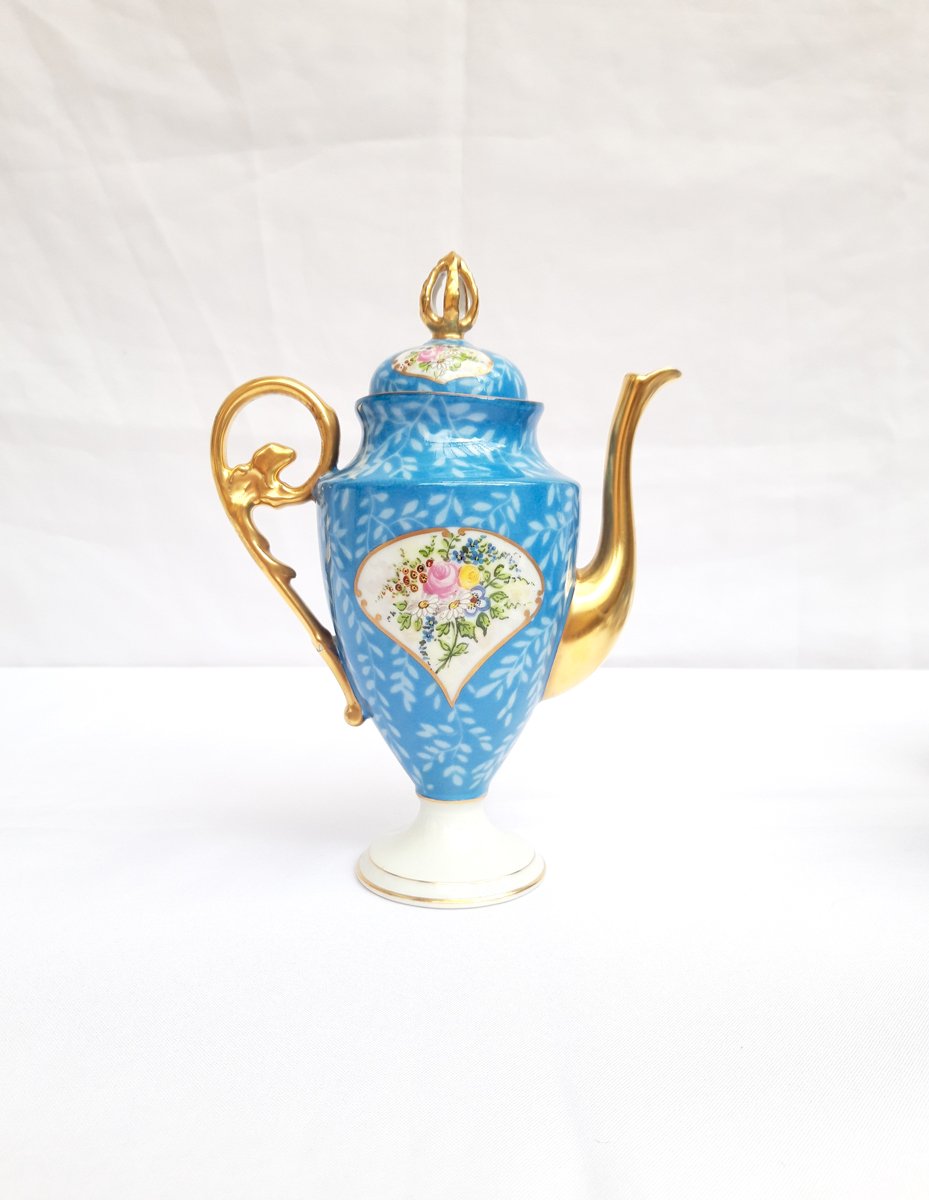 Height of pieces in cm: teapot 21 - sugar bowl 14 - milk jug 12 - cup 9