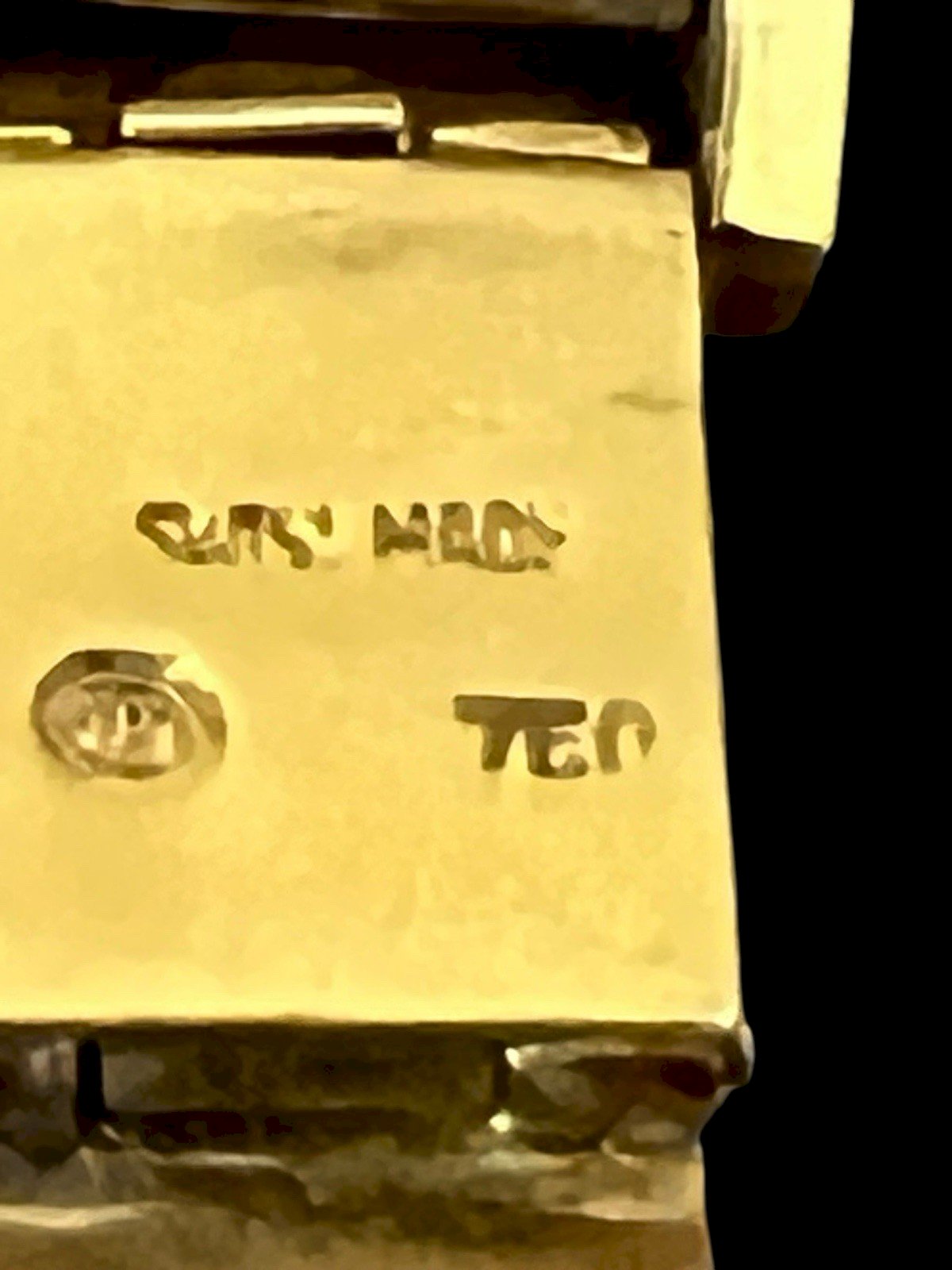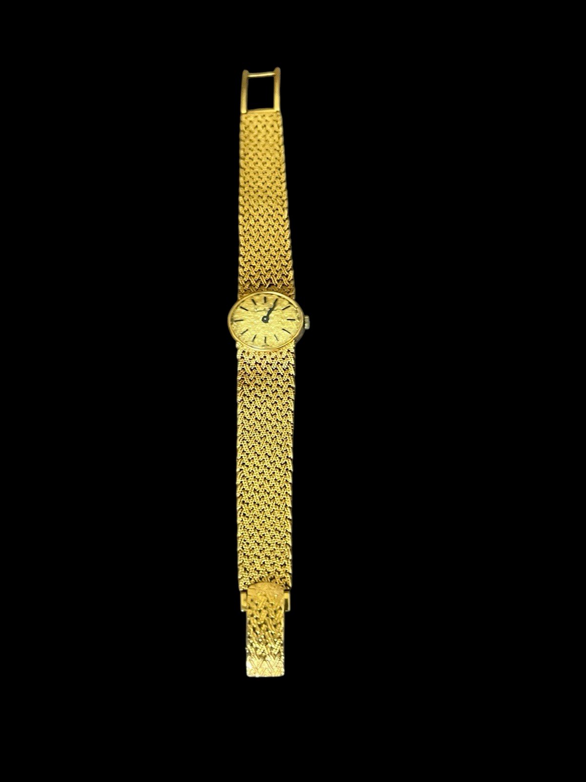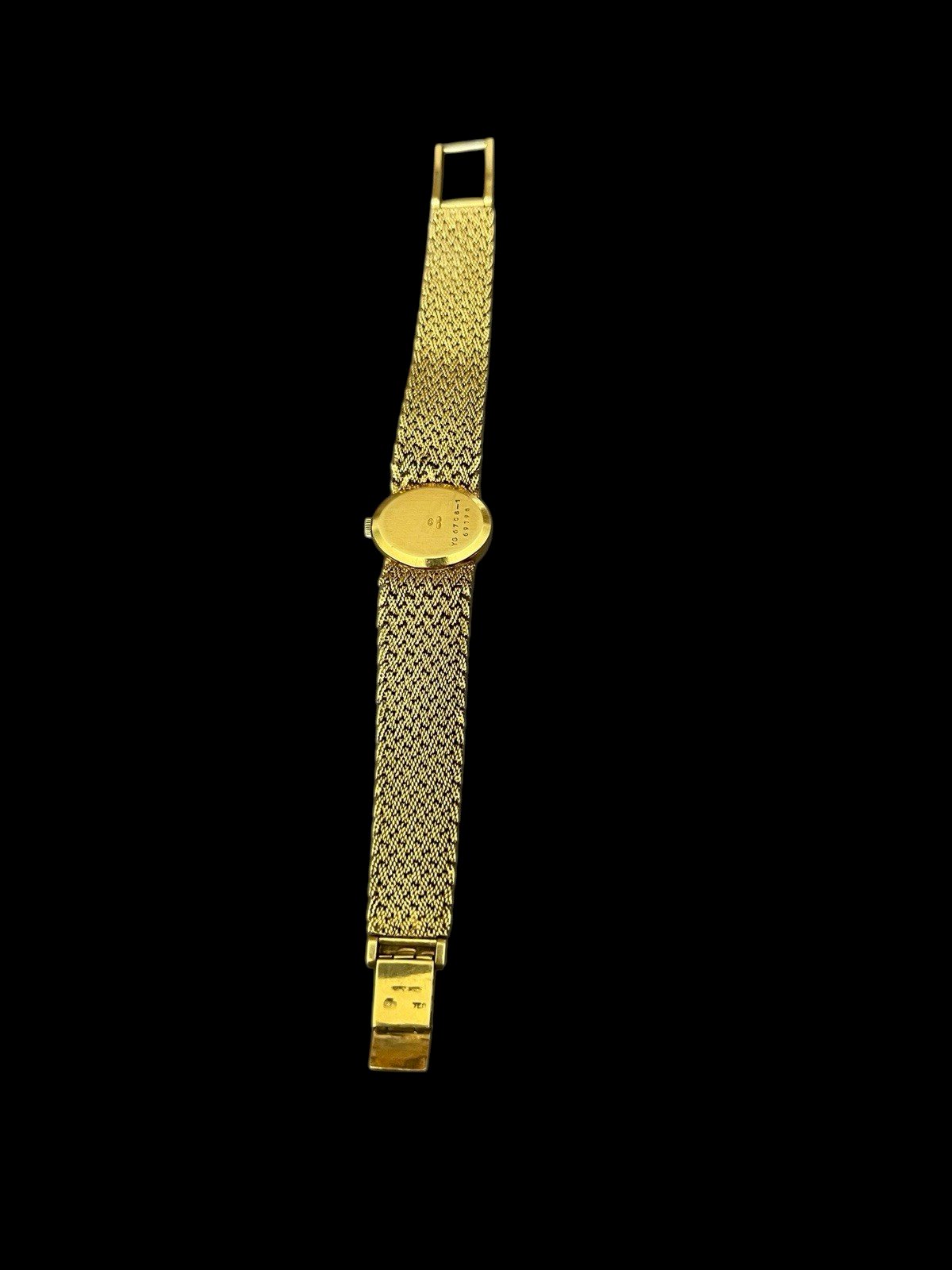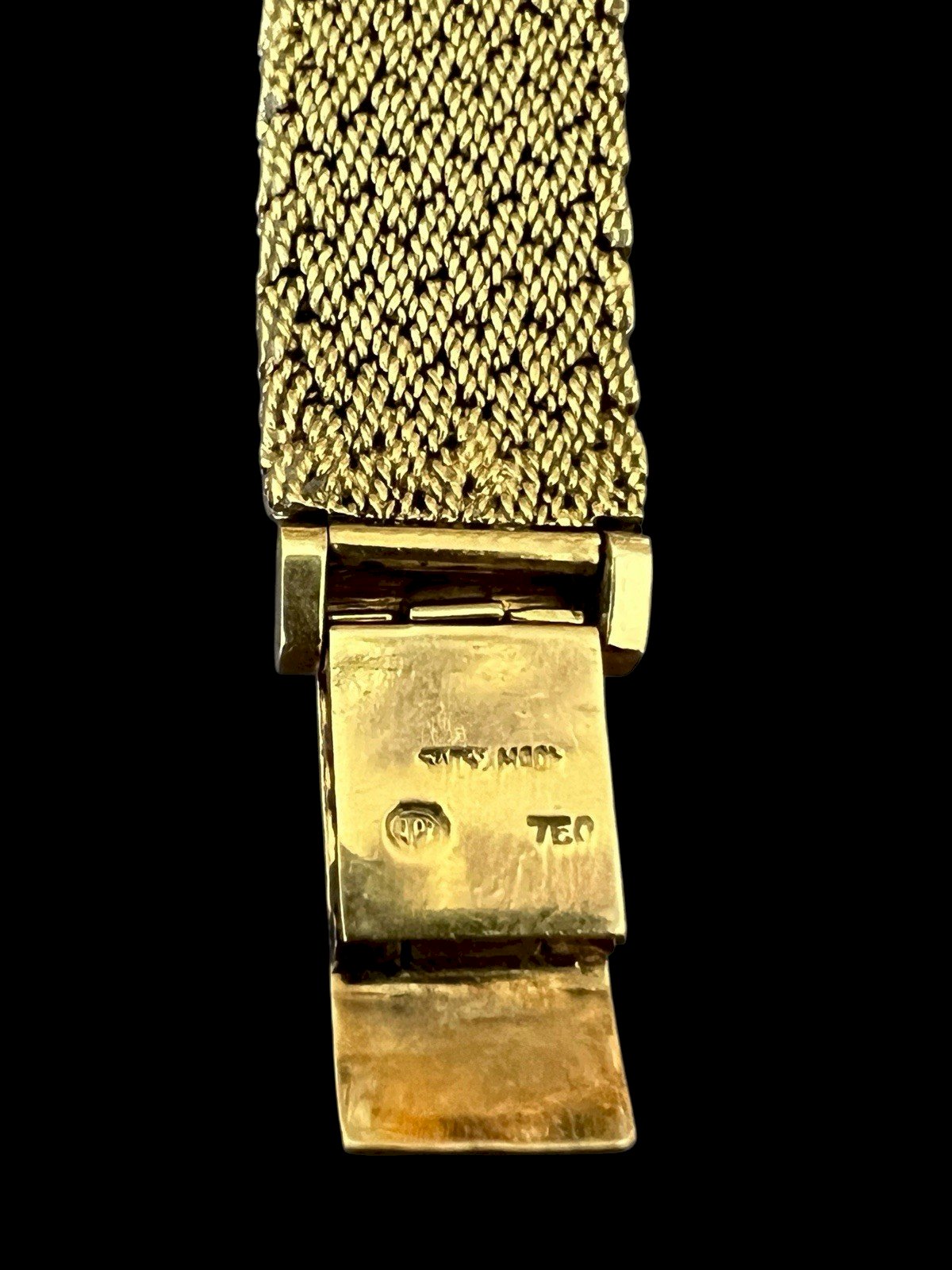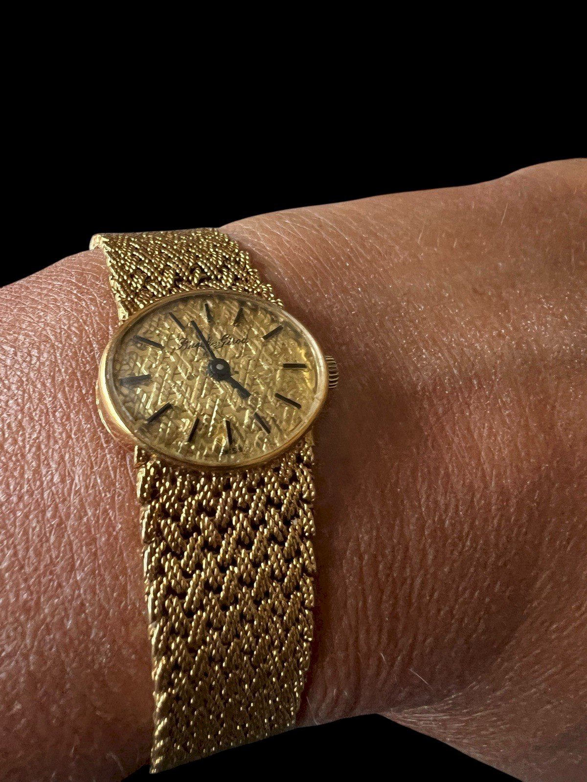 Vintage 18-carat gold watch. Brand: Bueche-Girod Country: Switzerland Gender: Women Type: Mechanical wristwatch (manual winding) Material: Solid 18-carat gold (750/1000), hallmarked Hallmarks: “18K 750”, head hallmark (official control), master hallmark “122” Total weight (watch + bracelet): 40.75 g Total length: approx. 17.5 cm (small wrist) Bracelet width: approx. 1.5 cm (at widest) Case diameter (without crown): approx. 20 mm Dial: gold, textured decoration, black indexes Bracelet: integrated, woven solid gold, two small threads emerge from the back (see photos), requires slight restoration Movement: Swiss mechanical, runs but may need cleaning/maintenance Model reference: not indicated (not present on the watch, which is common for Bueche-Girod from this era) Condition: Generally good condition, normal signs of use. The watch works, but cleaning/service is recommended for optimal use. The bracelet shows two small threads emerging from the back (see photos). Shipping: Insured shipping at actual value, careful and secure packaging. Condition: Used - Very good condition: This item has been lightly used, but its condition is correct. It may show some signs of wear, such as light scratches or tarnishing. All imperfections must be shown and described in the seller's listing. Bracelet color: Gold Case color: Gold Model:´ Features:´ Customized: No Vintage: Yes Movement: Mechanical (Manual) Brand: Bueche Girod Type: Wristwatch Dial color: Gold Country of origin: Switzerland Case material: N Bracelet material: Yellow gold Character: N Style: Classic Clasp: Deployant Department: Women