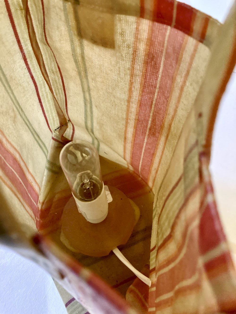 The bag is made of fiberglass resin rigidized fabric, with a weighted glass paste base ensuring good stability. The light diffuses through the fabric and creates a warm and soft atmosphere.