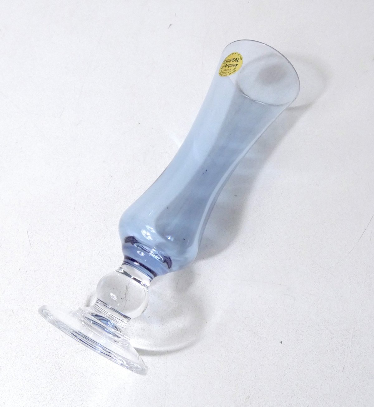 Elegant purple crystal vase signed Cristal d'Arques France, guaranteed with over 24% lead (original label present). It features a beautiful elongated baluster shape, resting on a circular base with a central knot. The crystal is clear, with subtle purple or bluish reflections depending on the light. Dimensions: height 21 cm, diameter approximately 6 cm. In excellent condition. A refined vase, perfect for showcasing a bouquet or complementing a collection of colored crystal.