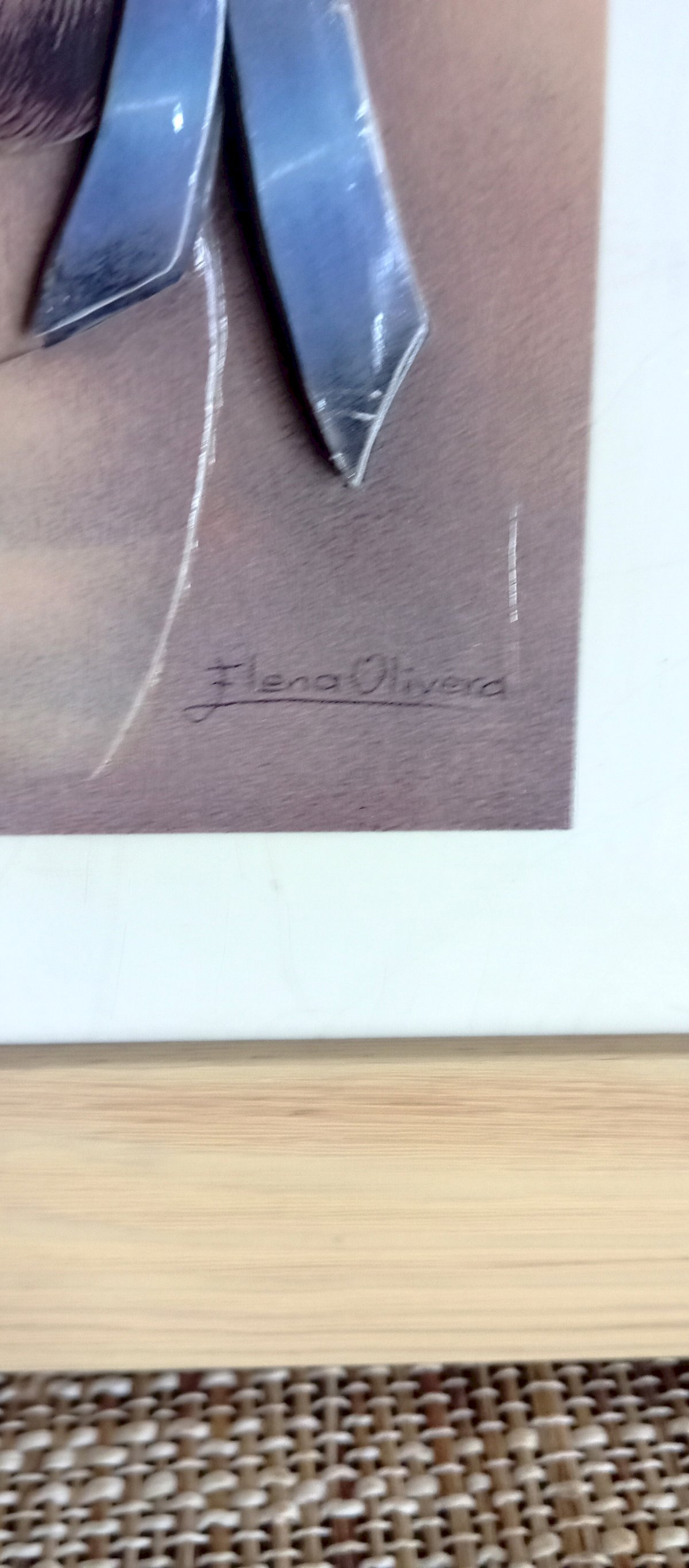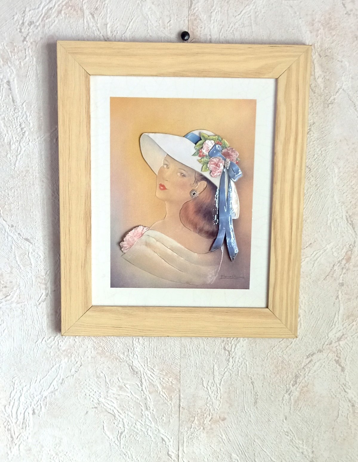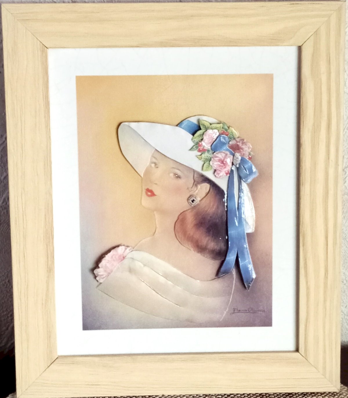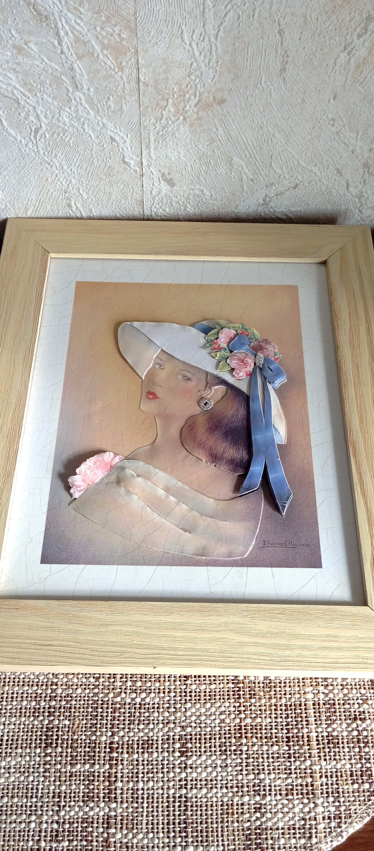 Vintage 3D relief illustration, signed by Elena Oliveira, presented in a light wooden frame, ready to hang.