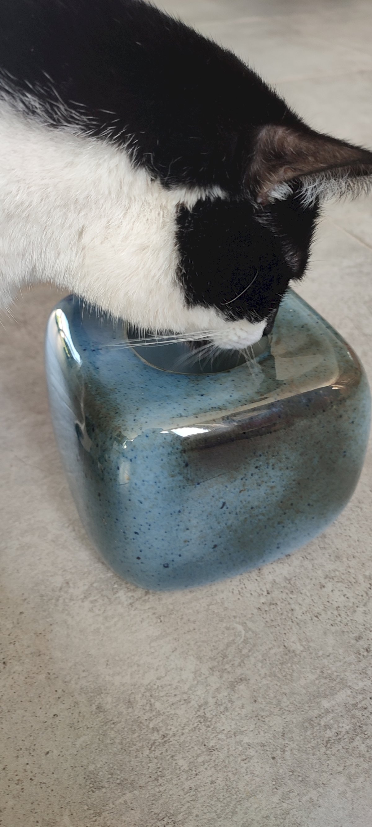 Design: Cube with rounded corners, reactive blue glaze, sky blue speckled with khaki.