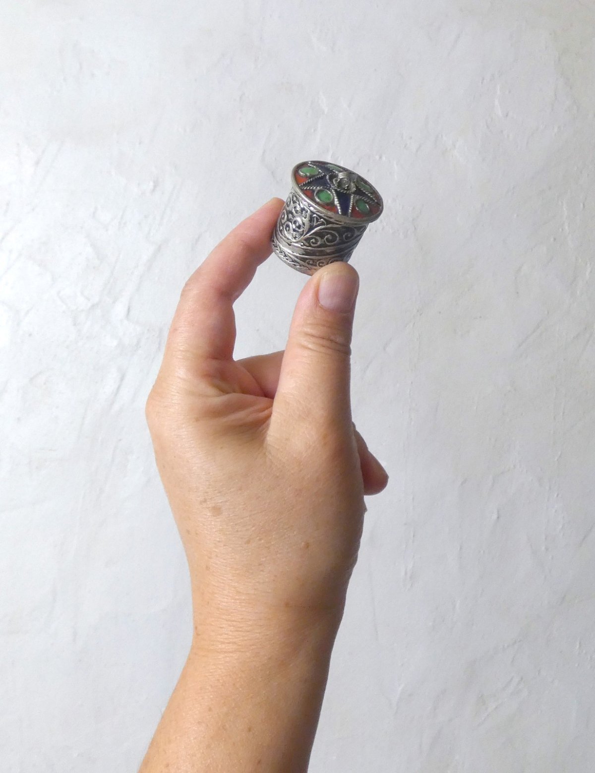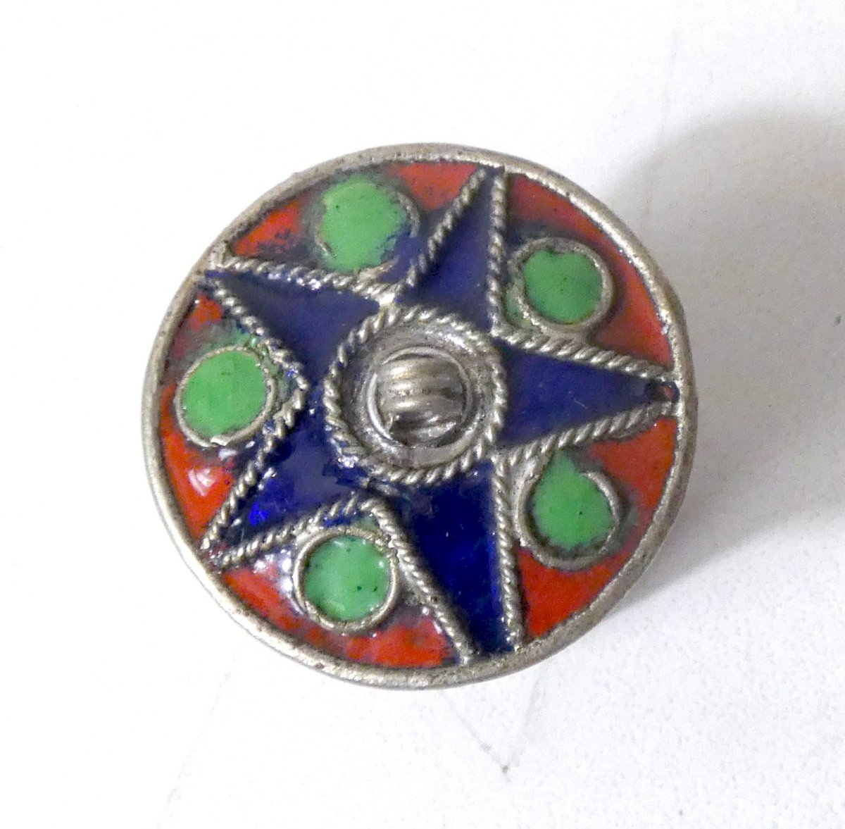 Old Berber metal cloisonné box, enameled in blue, red, and green. Moroccan craftsmanship from the 60s/70s, can be worn as a pendant as an amulet box. Beautiful vintage ethnic object, decorative and rare, in very good condition (3 x 3 cm).