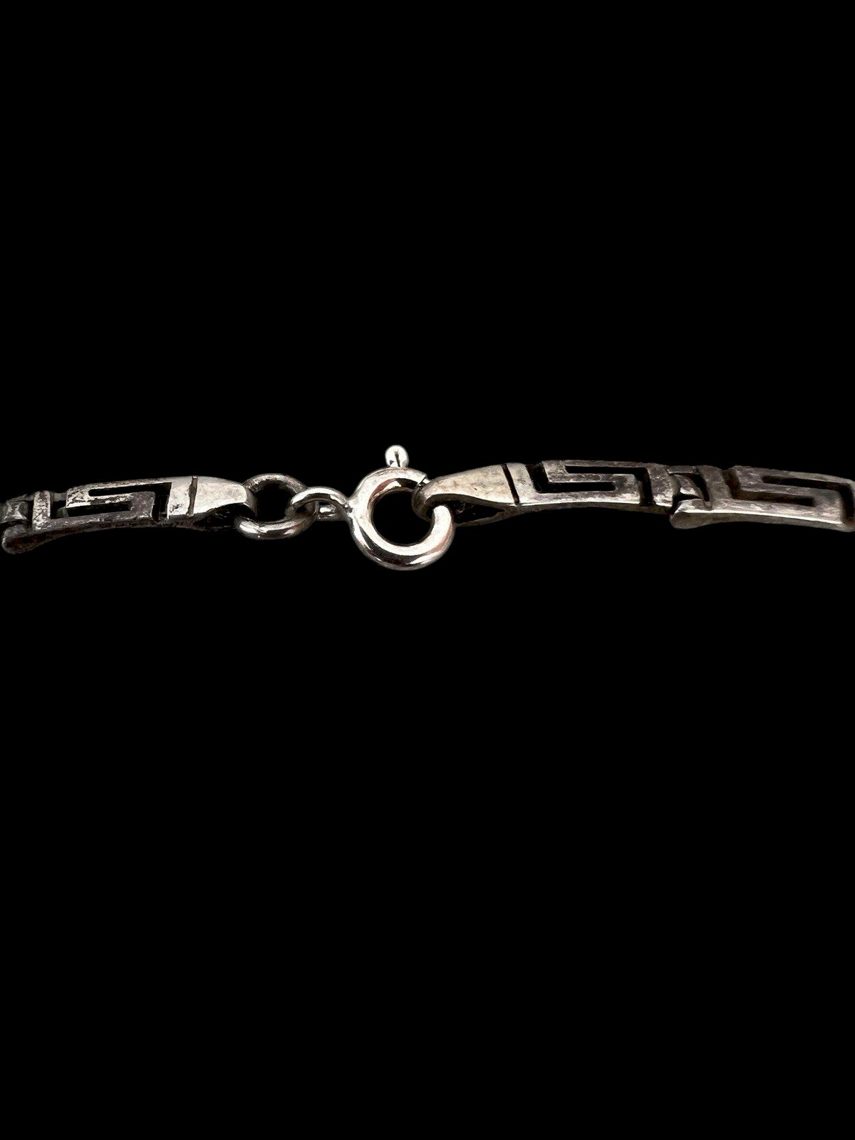 Vintage necklace in 925 silver. Vintage necklace in solid silver - Greek pattern (Meander) This charming little vintage necklace in solid silver hallmarked 925 features an elegant and timeless design. Its design, reminiscent of a torque, gives it a unique look. It is distinguished by its Greek meander pattern, an iconic and geometric frieze that adds a touch of sophistication to this piece of jewelry. The necklace weighs approximately 15.9 g. Its neck circumference is about 41 cm, although it is difficult to measure accurately due to its V-shaped structure, but this is a reliable estimate. It is the perfect piece to complete a look with style and authenticity. Condition: Pre-owned: Item has been worn. ...Pre-owned: Item has been worn. any potential imperfections. Type: Choker Metal purity: 925 parts per 1000 Metal: Sterling silver