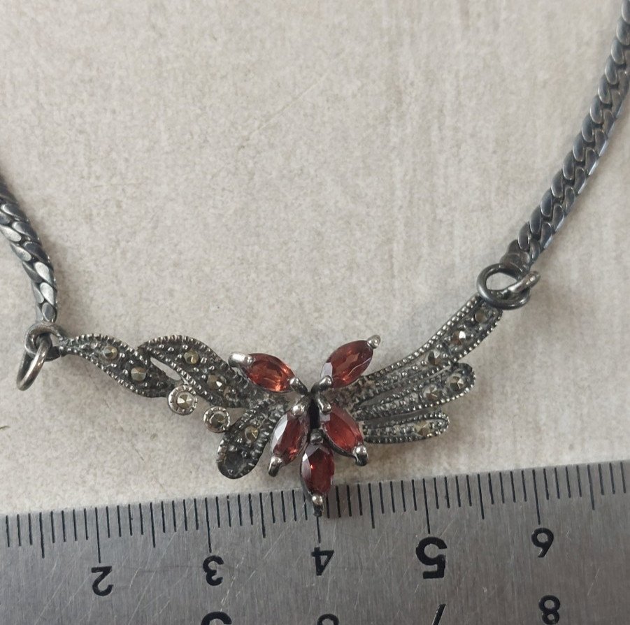 Vintage Art Deco necklace, red stone and marcasite, in silver in good condition, seems to be missing one marcasite, no visible hallmark, pendant dimensions 4 cm X 1.9 cm, total necklace length 42.7 cm, total weight 12.57 g. See photos. Check out my other items! Reduced shipping costs for combined purchases. Condition: Used, item has been worn, may have imperfections.