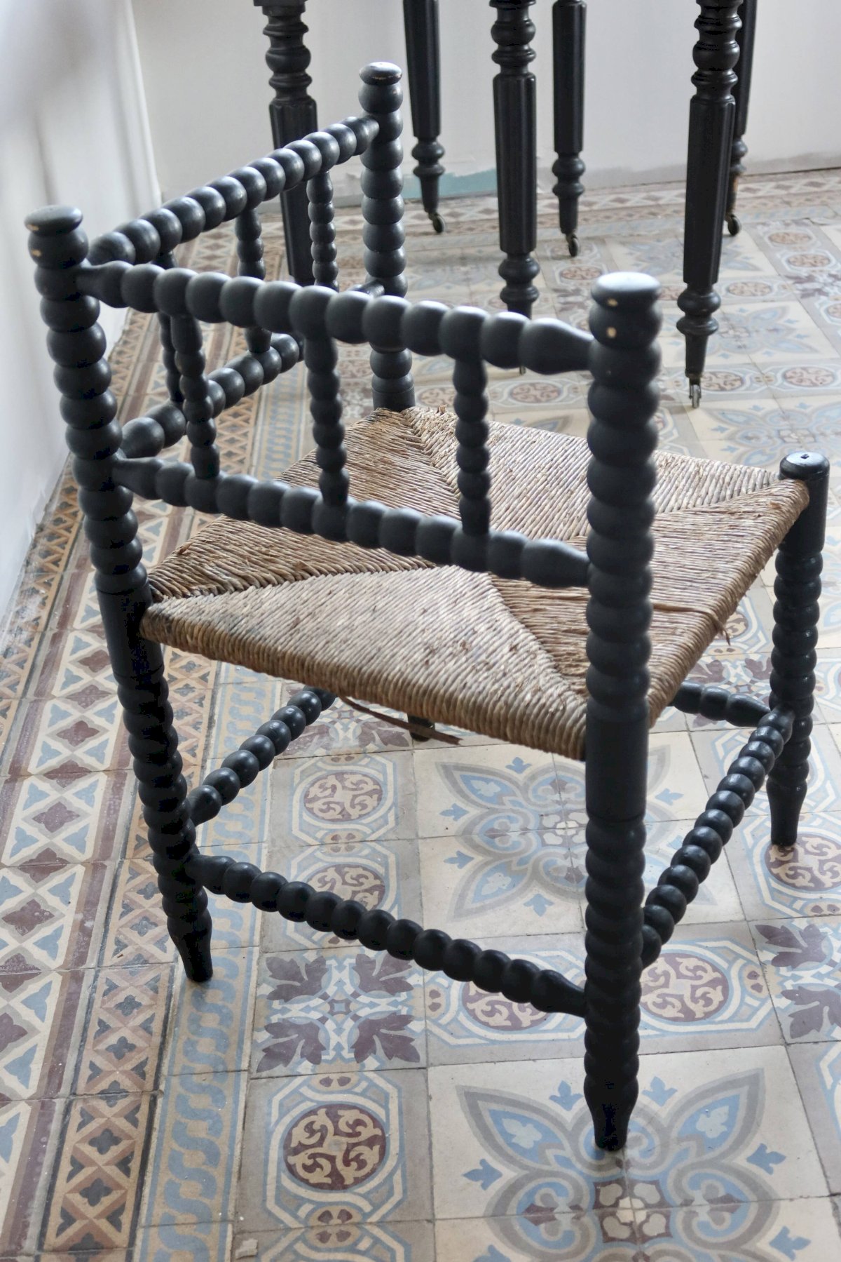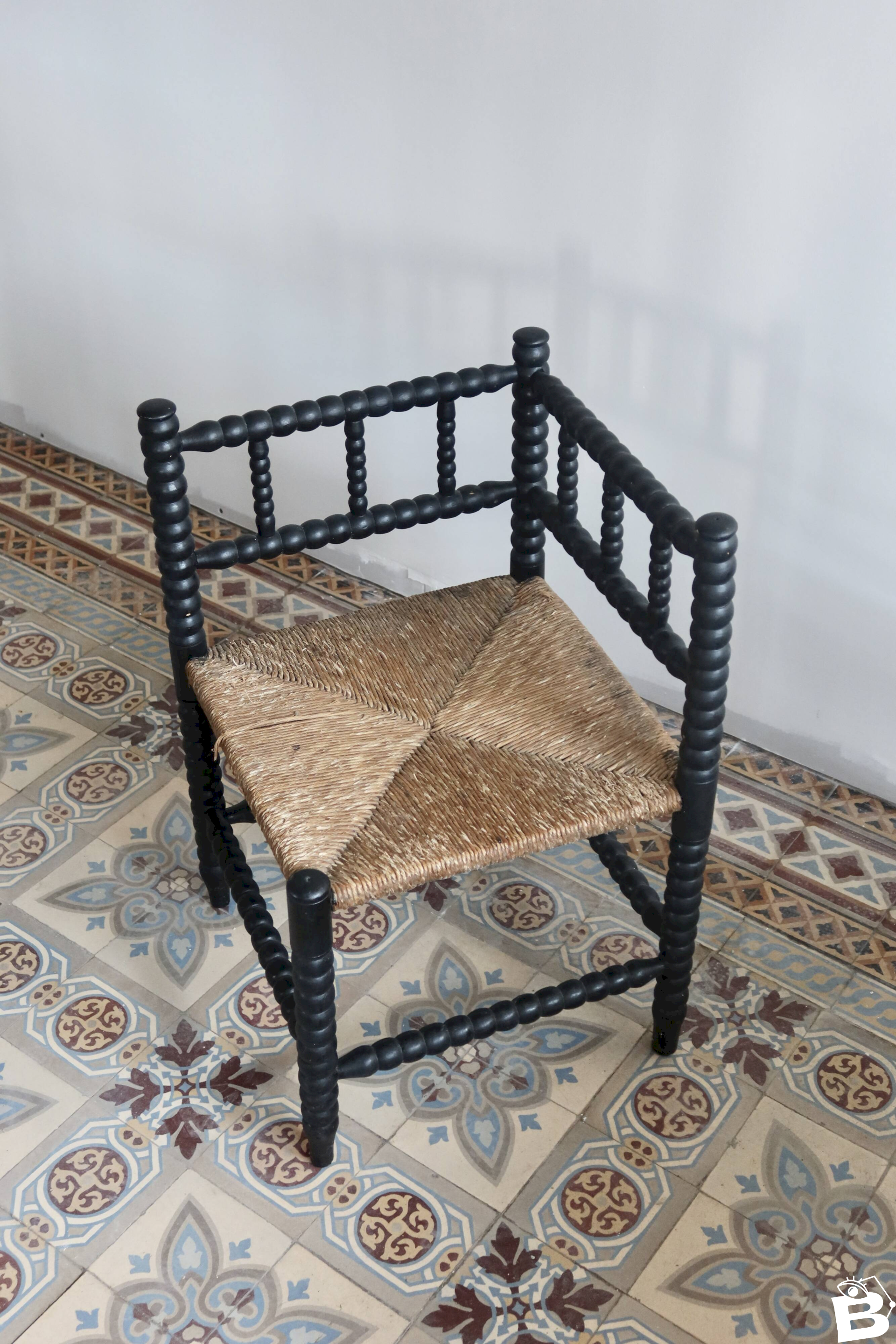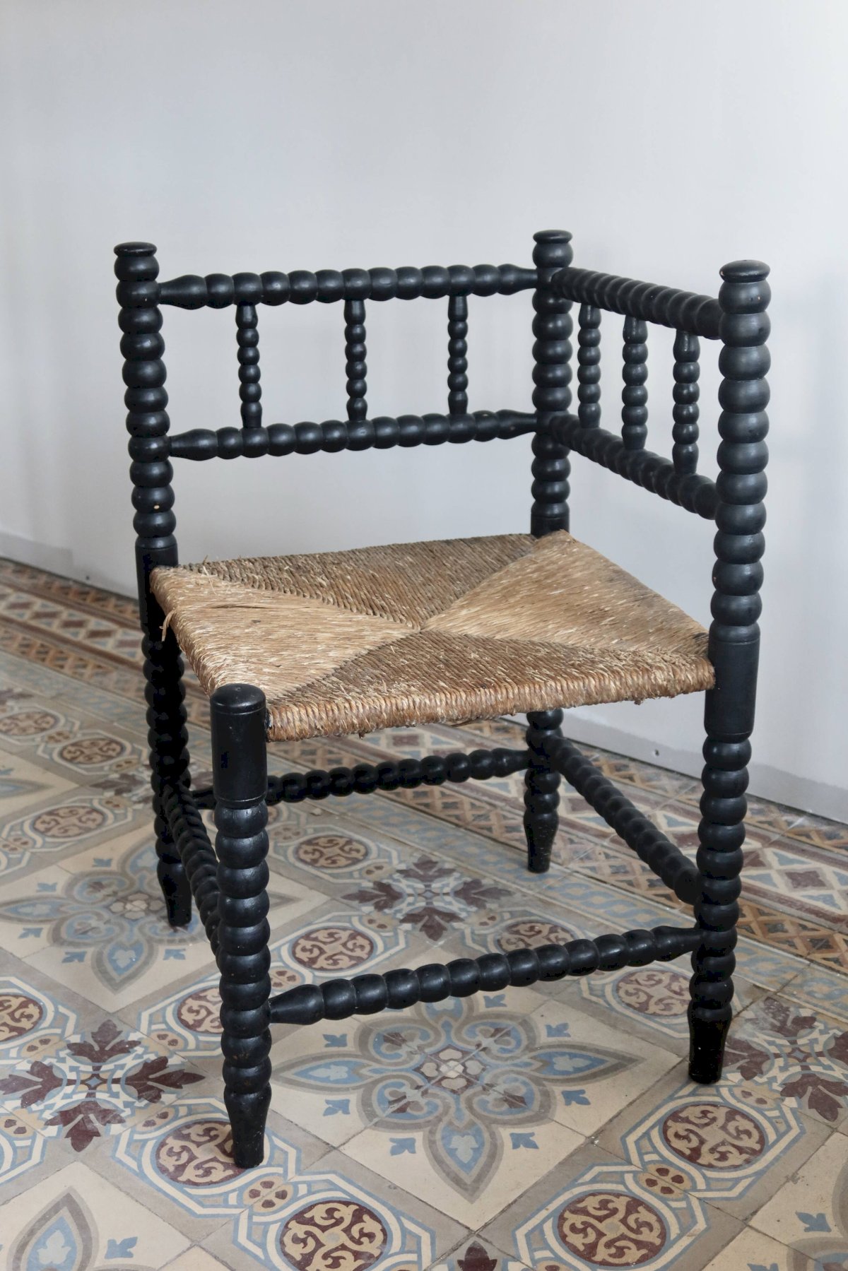 Antique corner chair made of turned wood, painted in black, with a seat of woven straw decorated in a cross pattern. The whole shows visible wear related to use and time, particularly on the paint and a slightly undone strand of straw, without compromising stability or usability. Chair found as is, with no restoration made. Approximate dimensions: 30cm X 60cm X 30cm. L: 30 W: 30 H: 60