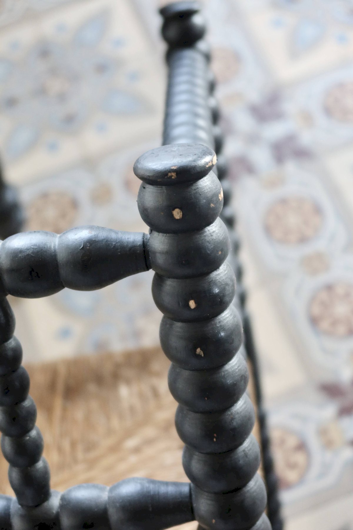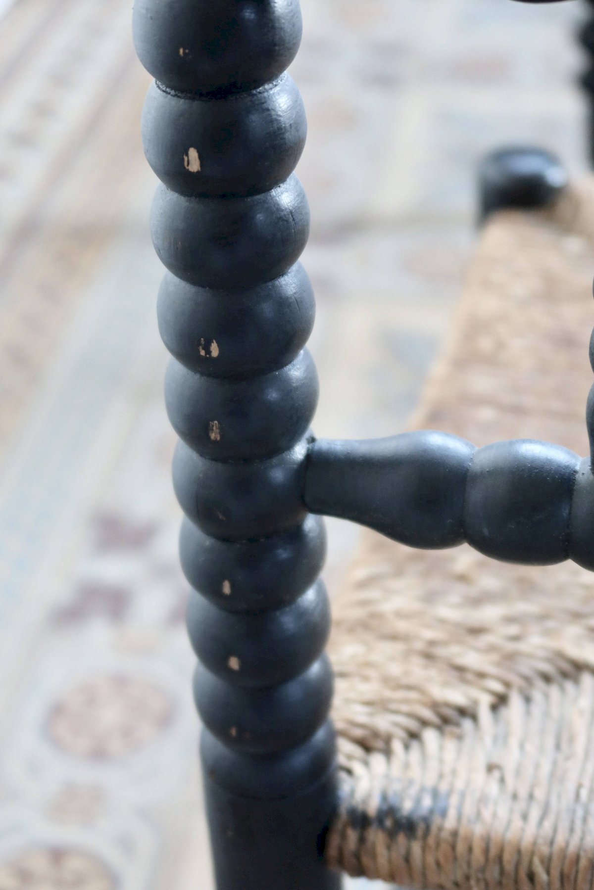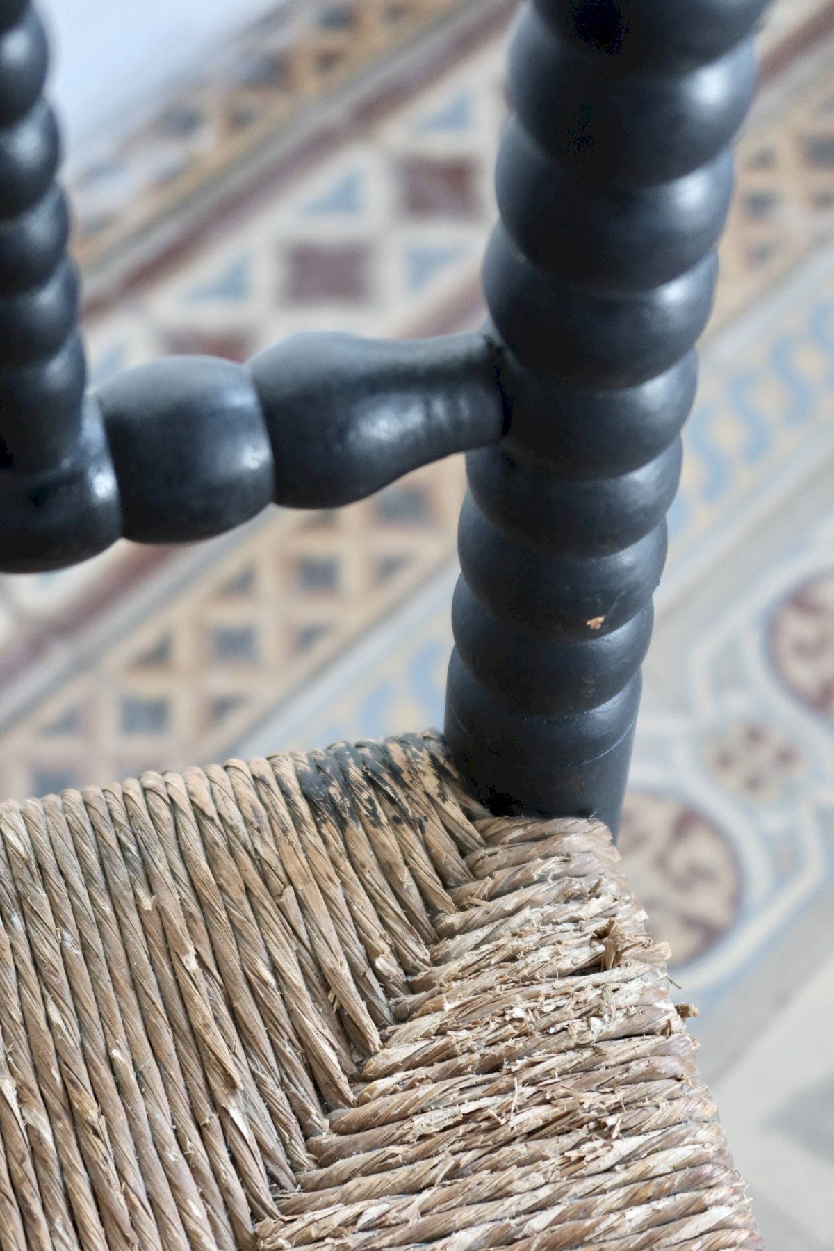 Antique corner chair made of turned wood, painted in black, with a seat of woven straw decorated in a cross pattern. The whole shows visible wear related to use and time, particularly on the paint and a slightly undone strand of straw, without compromising stability or usability. Chair found as is, with no restoration made. Approximate dimensions: 30cm X 60cm X 30cm. L: 30 W: 30 H: 60