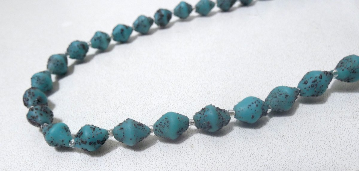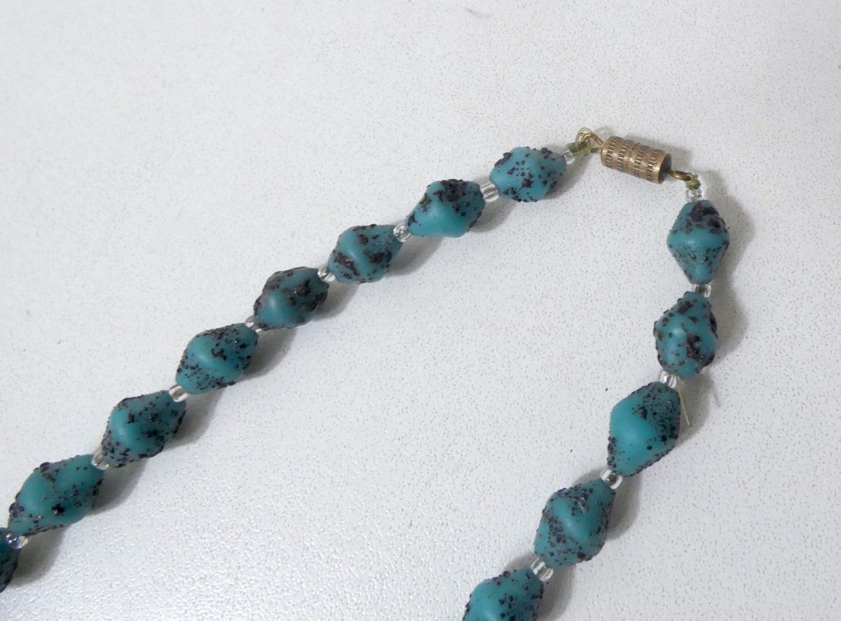 Antique sautoir necklace made of glass paste, opaque turquoise beads with brown/eggplant speckles in relief. Irregular biconical bead shapes. Total length 115 cm, brass-colored screw clasp. Vintage costume jewelry, likely of Czech (Bohemian) origin, from the 1950s to 1970s. In excellent condition. Condition: Used item that has been worn. Please note any possible imperfections. Country of origin: Metropolitan France.