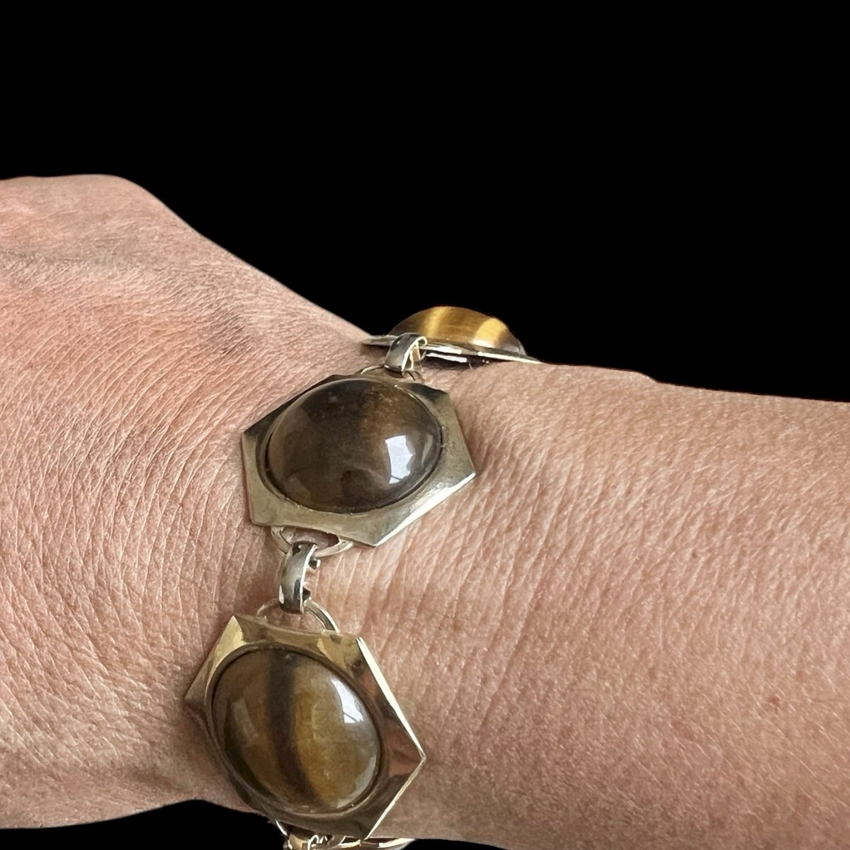 Vintage bracelet circa 1960-1970 featuring important half tiger's eye cabochons. Bracelet dimensions approximately 19.5 cm long and about 2.8 cm wide – Minor signs of wear. Condition: Pre-owned item. ...Pre-owned item. any potential imperfections. Style: Bracelet Dominant stone: Tiger's eye Color: Gold
