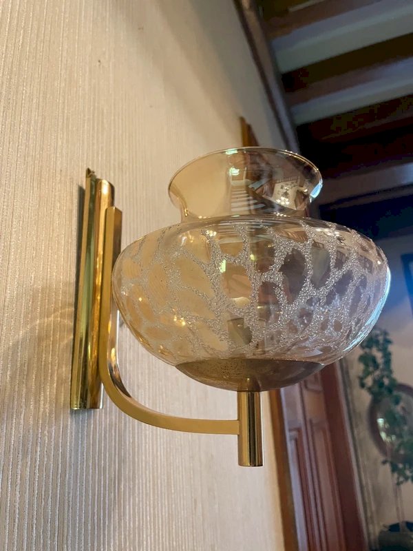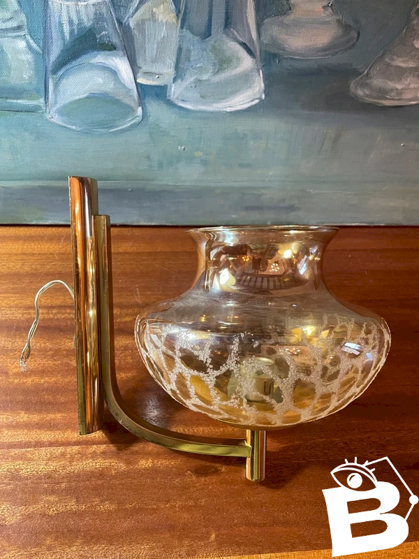 Beautiful vintage wall lamp, very stylish, brass and slightly iridescent yellow glass with a gold tint. Very good condition. For bulb socket.