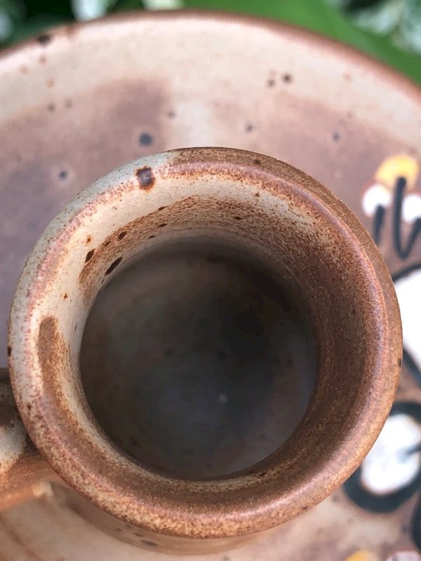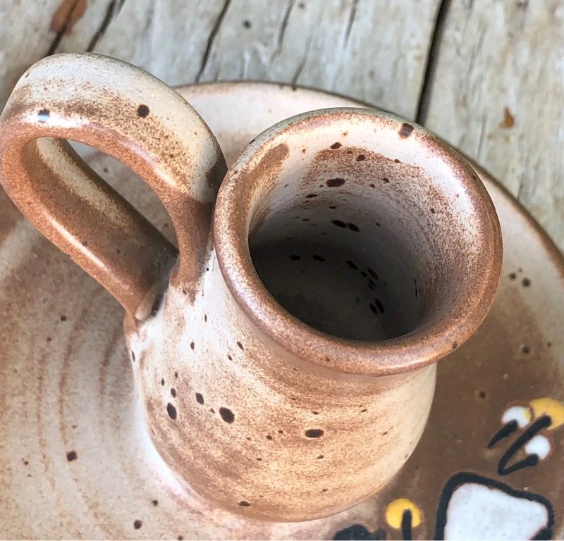 Brown and beige ceramic candle holder signature to identify design craftsmanship