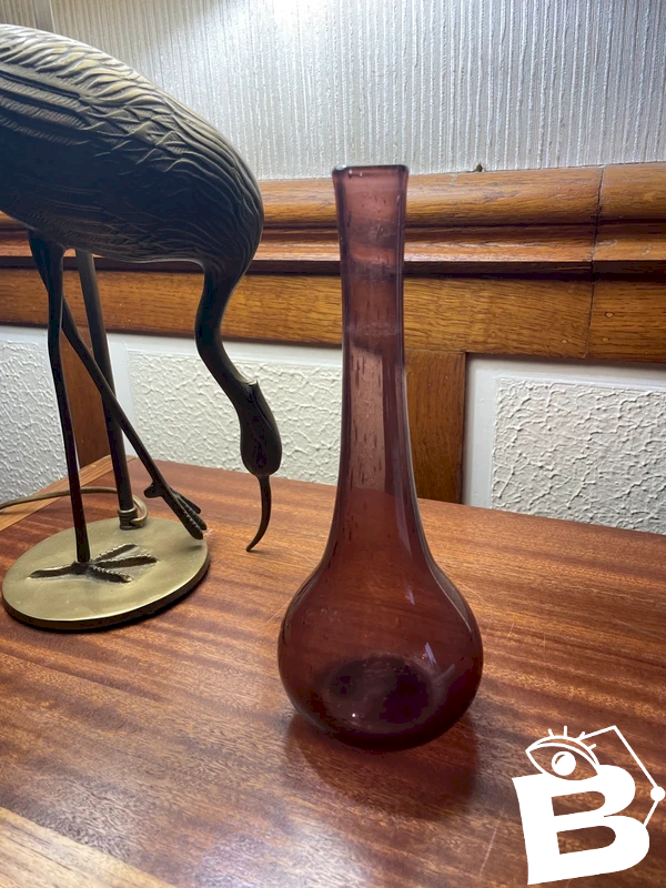 Single flower vase with a pure and balanced shape, purple aubergine glass with typical bubbles from the Biot glassworks (South of France).