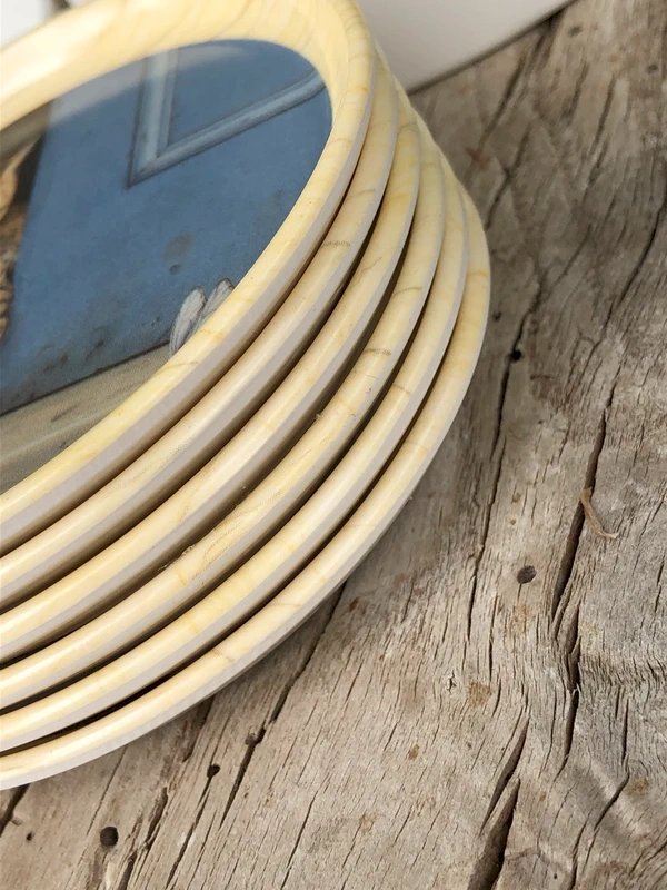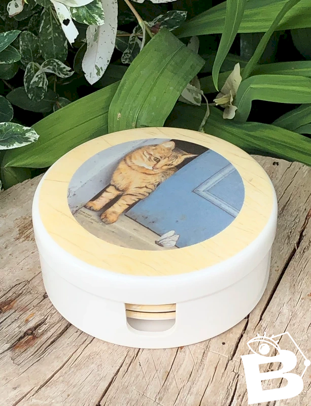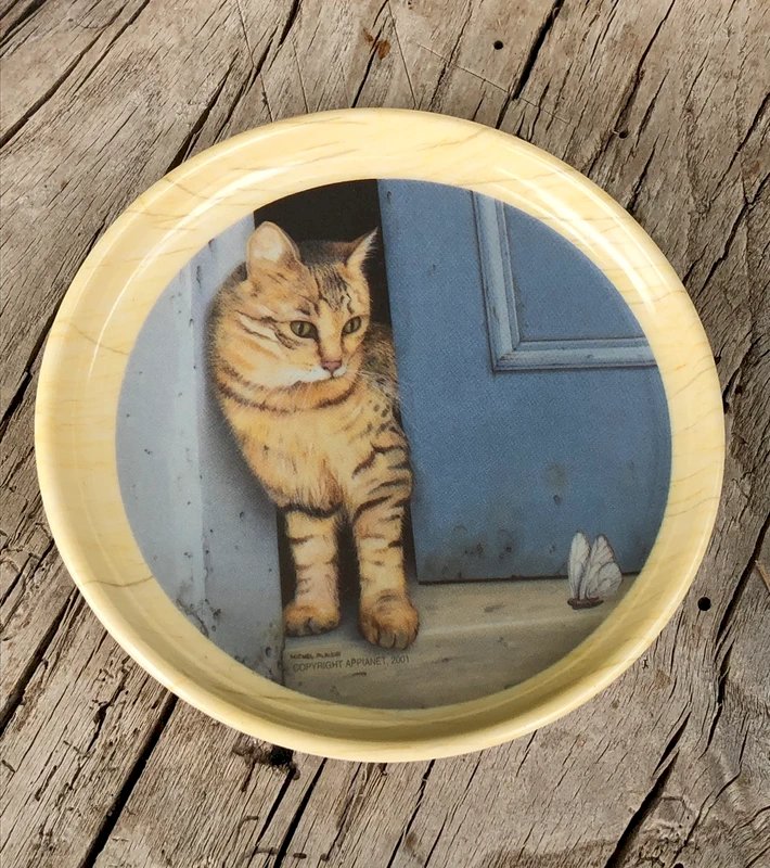 6 coasters and vintage box with cat patterns in melamine made in Italy Excellent condition Diameter 10.3 cm