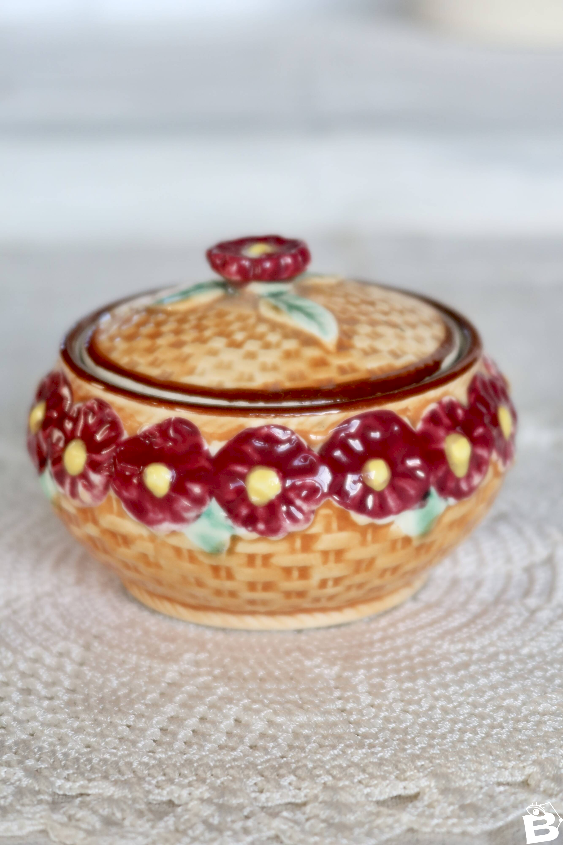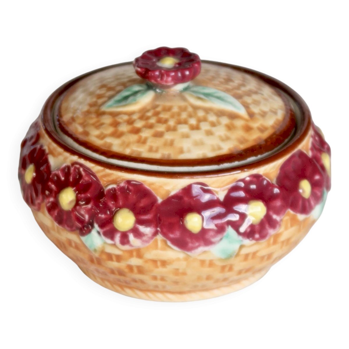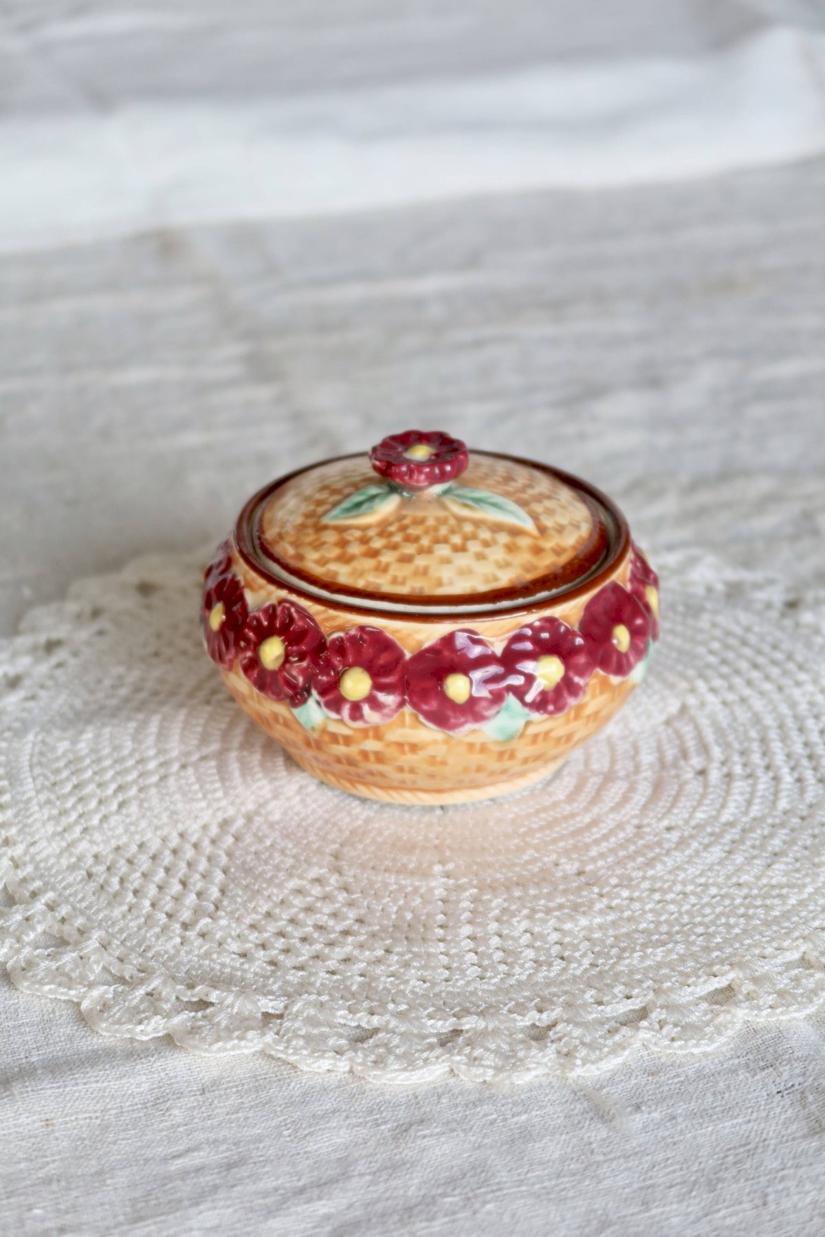 Vintage ceramic and slipware candy jar - Woven basket, burgundy flowers