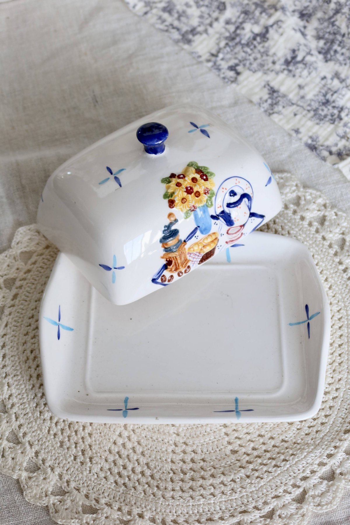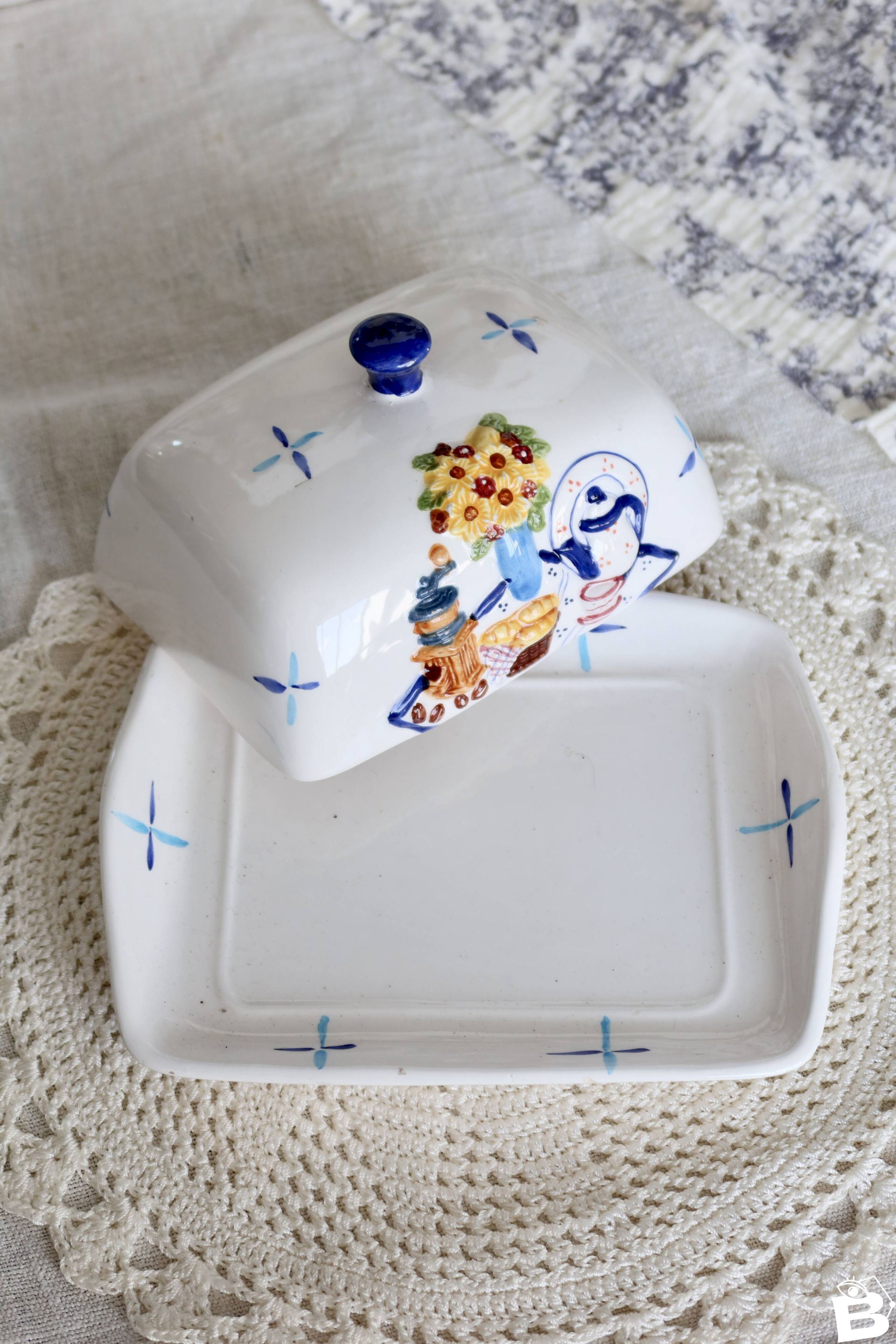 White earthenware butter dish composed of a bell and its plate, decorated with slip decoration on the breakfast theme.