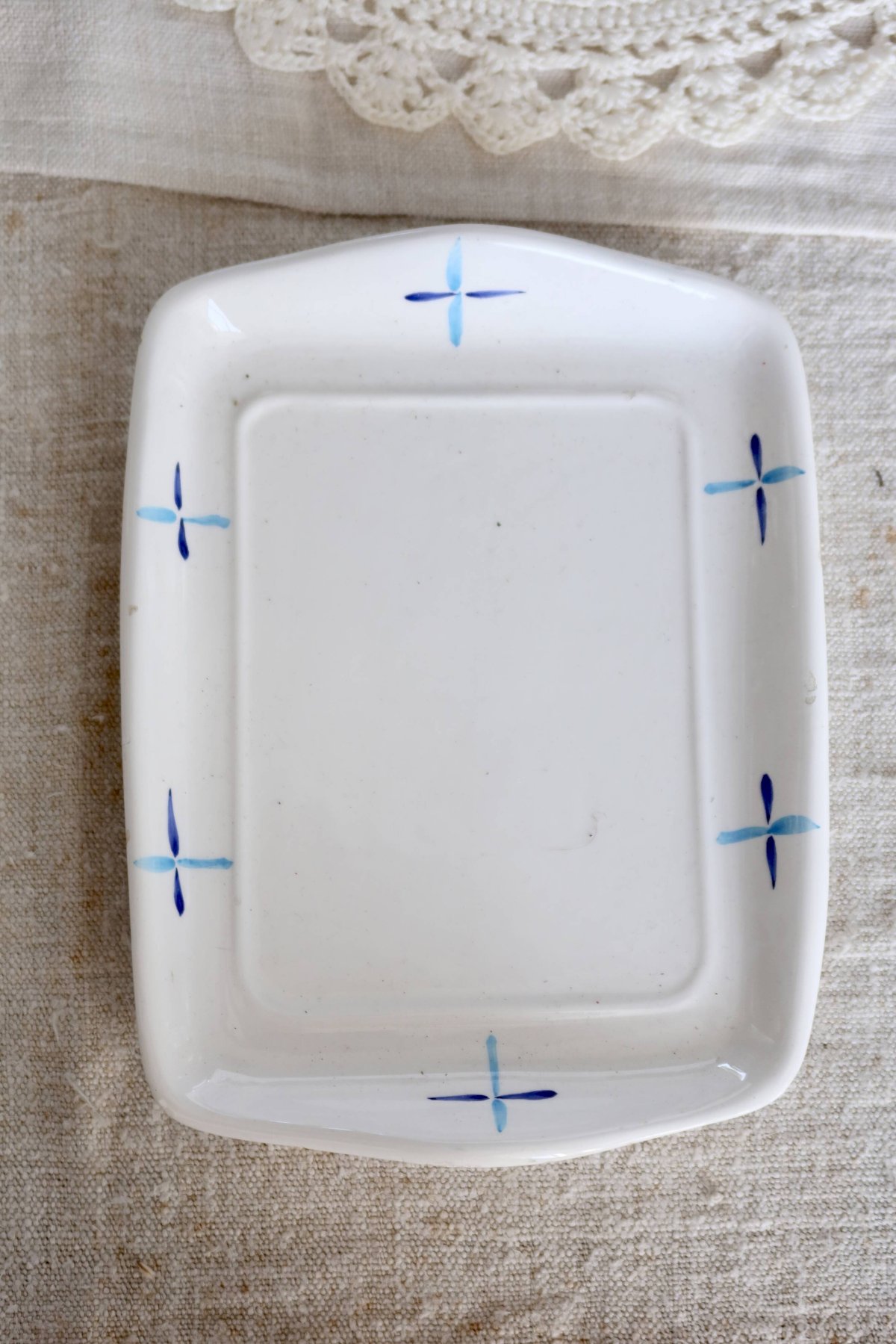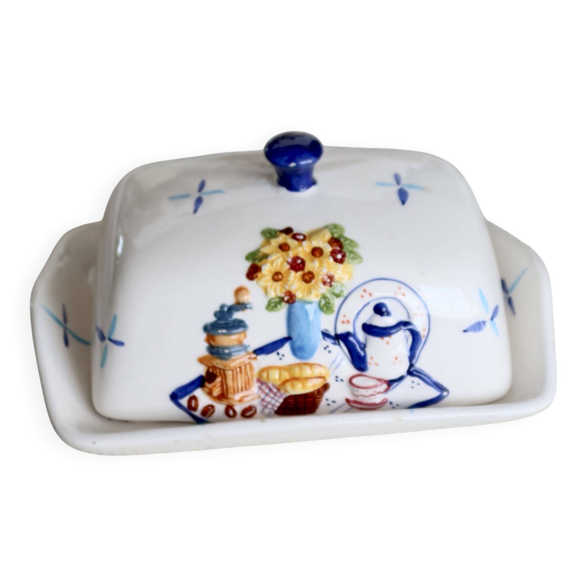 Painted blue motifs and bright colors — bouquet, coffee pot, and cup — with a blue grip knob for a retro touch. Note: very slight enamel chips on the rim of the plate, discreet in use (see photos). Dimensions: 18cm x 9cm x 13cm. L: 18 W: 13 H: 9