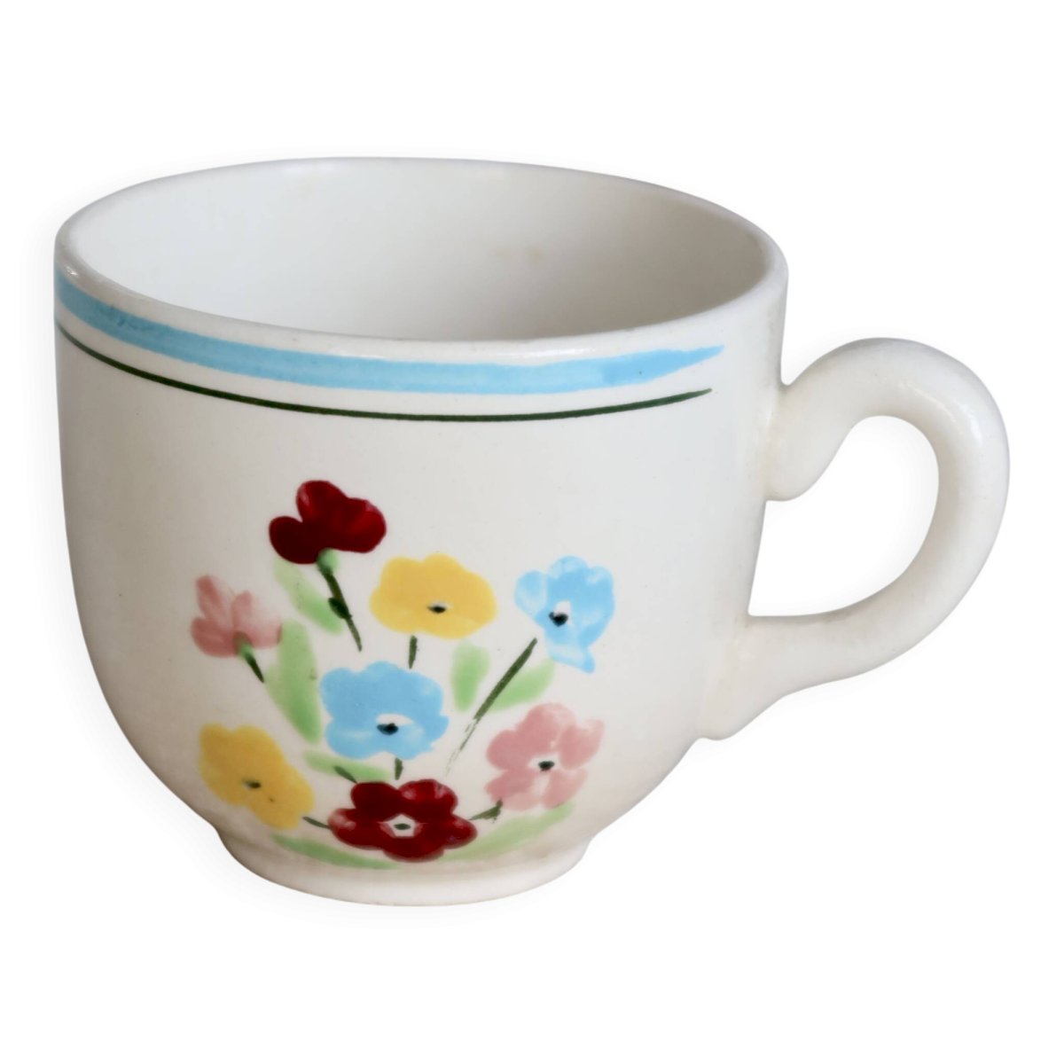 Coffee cup made of faience from the Salins manufactory, decorated with small multicolored bouquets and light blue borders.