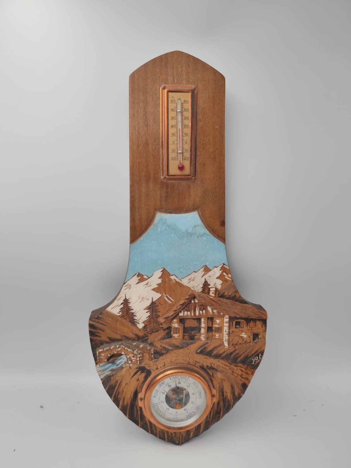 Charming vintage wall barometer, decorated with a hand-painted alpine landscape: chalet, wooden bridge, stream, and snow-capped mountains. Equipped with a needle barometer and a vertical thermometer integrated into a copper frame.