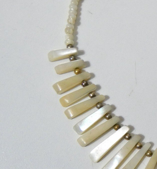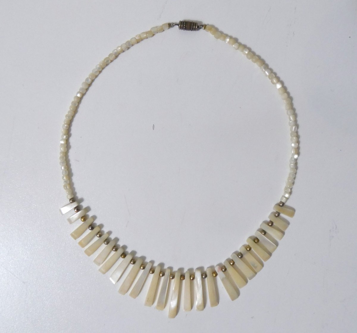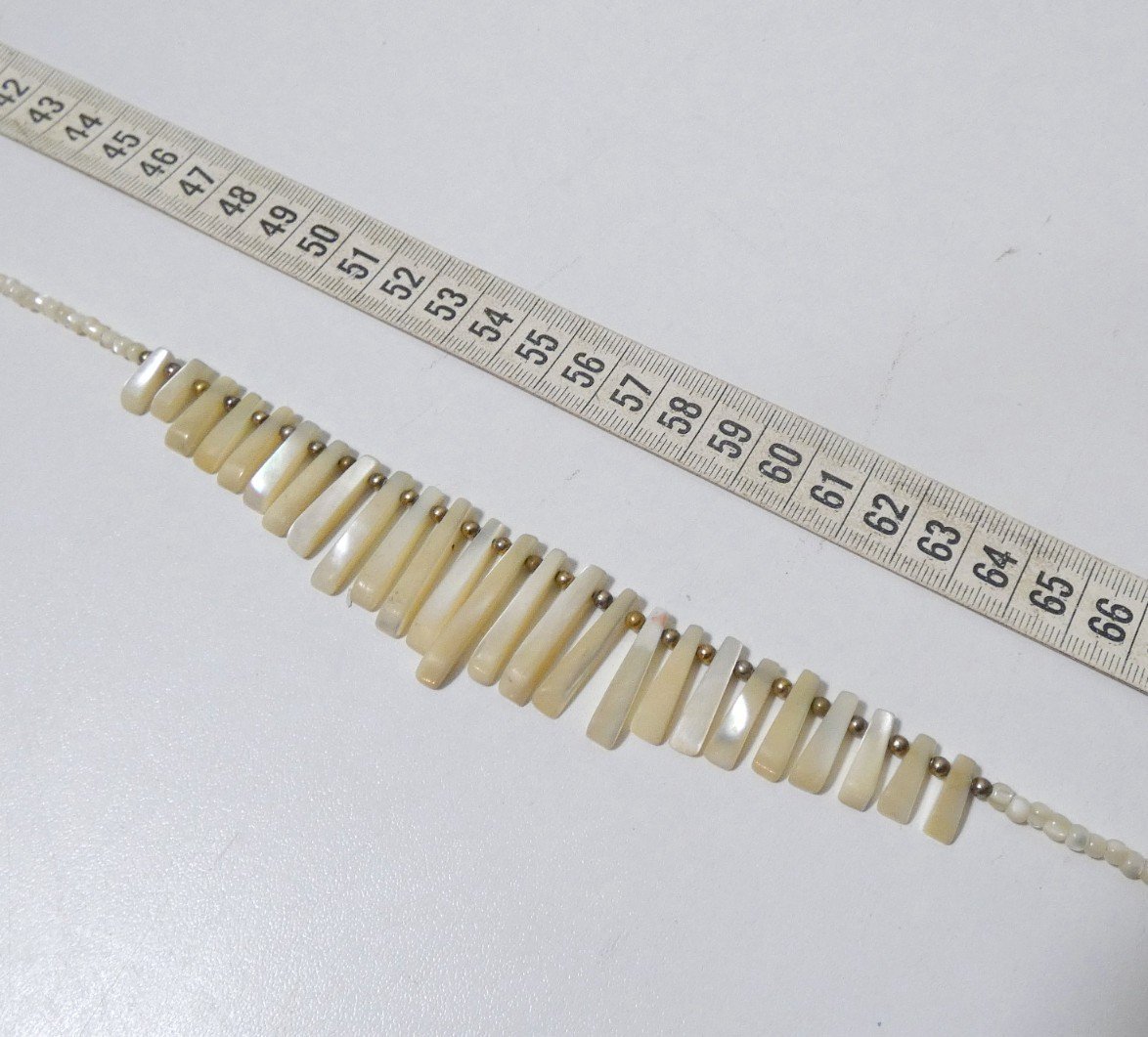 Old choker necklace, made of mother-of-pearl and golden pearls. Length of the necklace: 44 cm. Screw clasp. Very good condition. Condition: Pre-owned item. May show some imperfections.